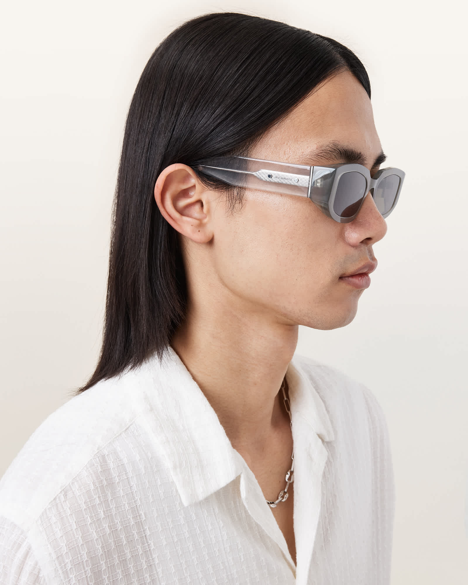 Rectangular frame All Saints bolt detailing Signature hexagon metal detailing Magnetic fastened case Recycled lens cloth Please note, these sunglasses are not suitable to wear while driving