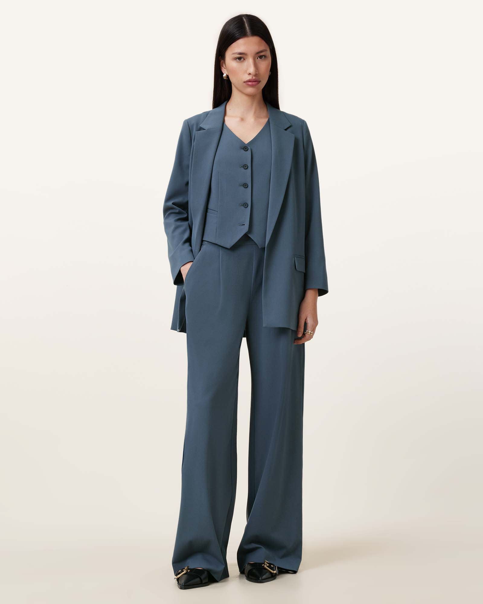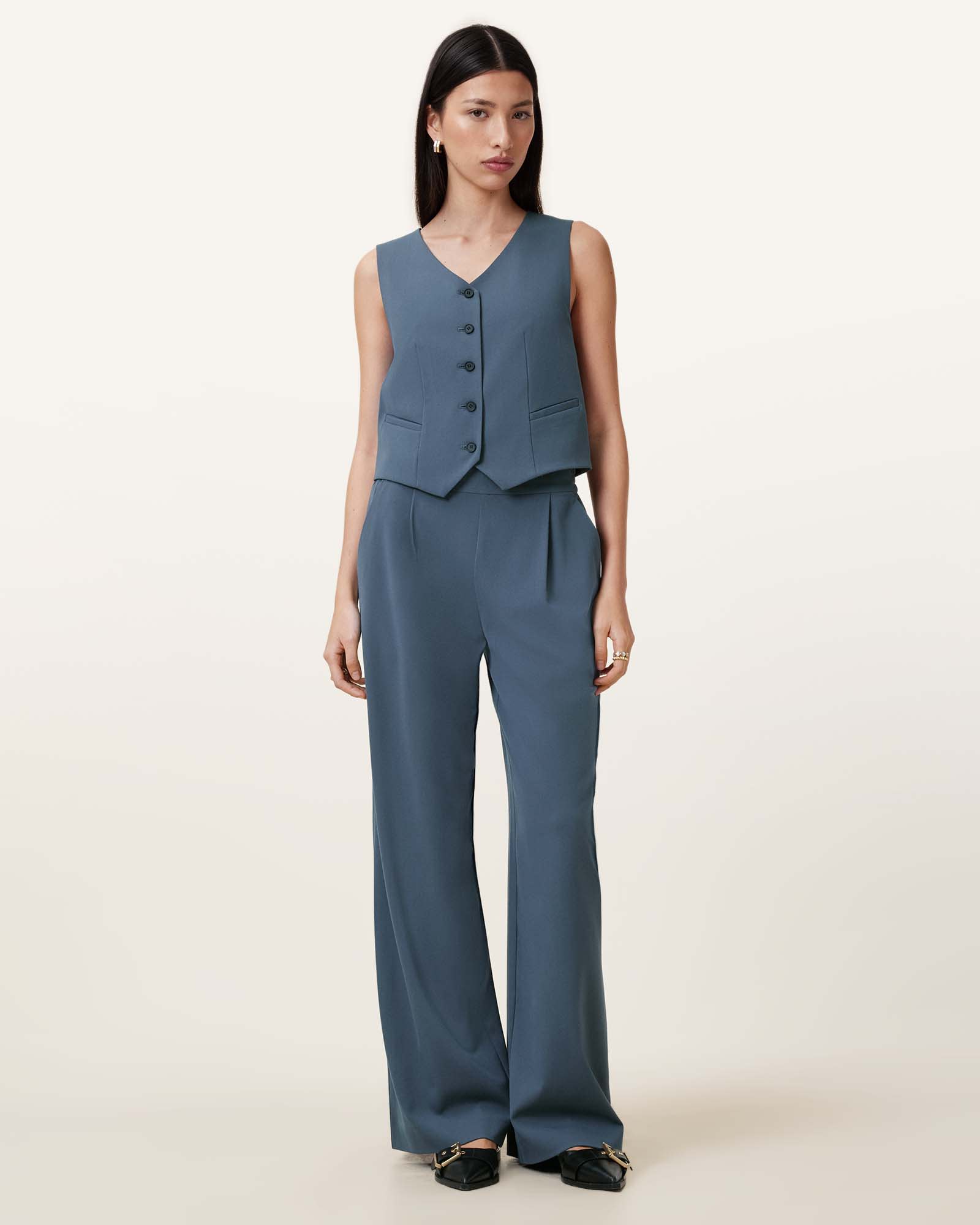This waistcoat is designed to a regular fit Sleeveless V-neck Front button fastening Two angled welt pockets Fully lined Pair with the Aleida Trousers Lightweight