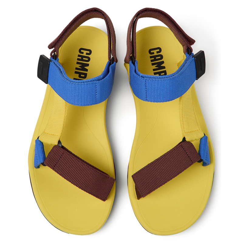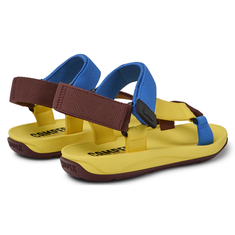 CAMPER - Yellow, blue, and burgundy men's sandals with 100% recycled PET straps, EVA outsoles, and a hook-and-loop closing system.