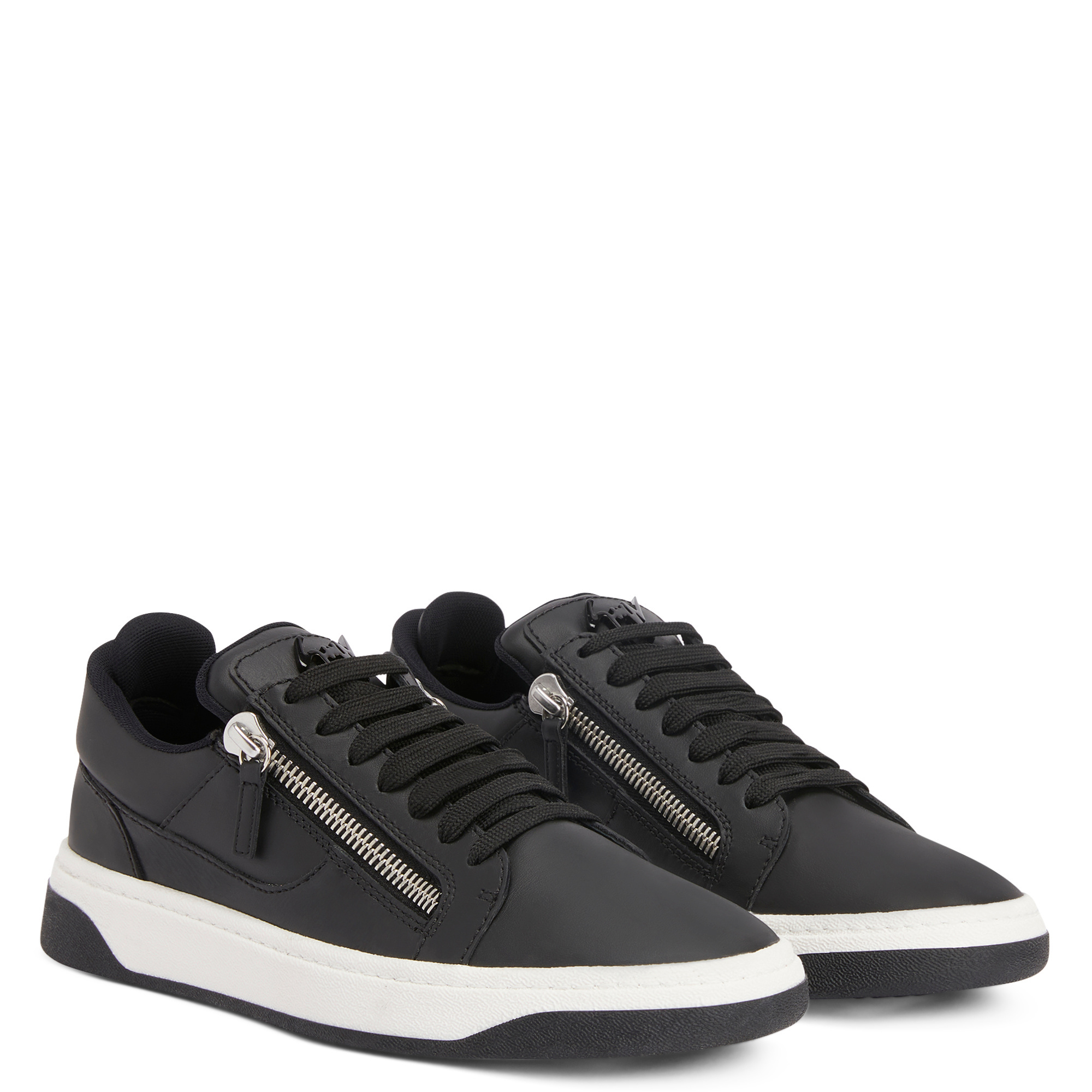 Low-top lace-up sneakers in leather with two tonal side zips and two-tone rubber sole.