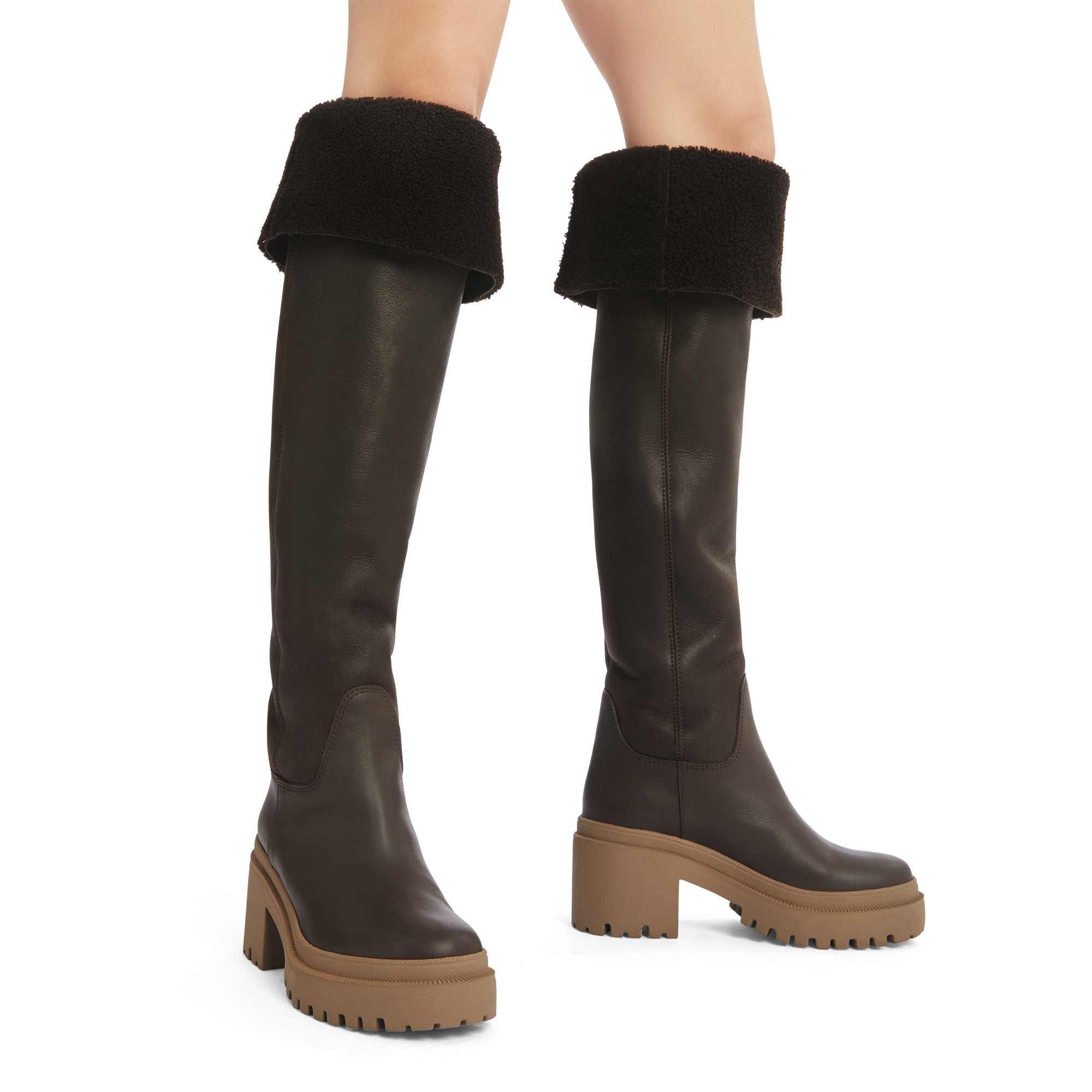 Knee-length boots in leather with sheepskin lining, chunky heel and rubber one-piece sole.