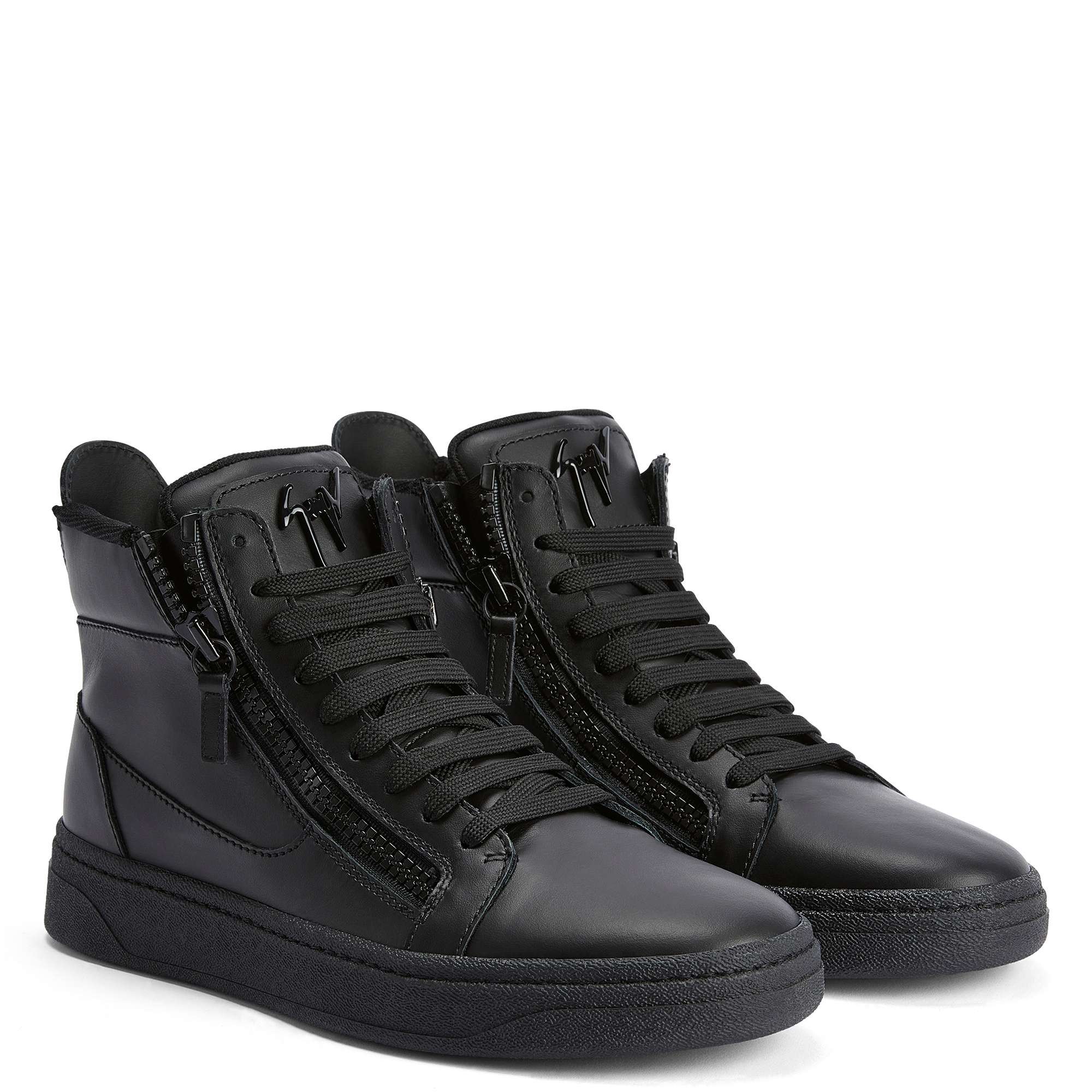 High-top lace-up sneakers in leather with two tonal side zips and rubber sole.