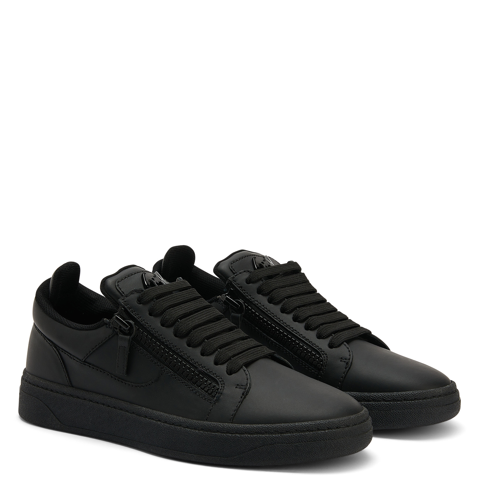 These low-top sneakers, crafted from black leather with matching cotton laces, feature a black lacquered metal ‘Signature' detail, matching side plastic zippers and rubber soles.