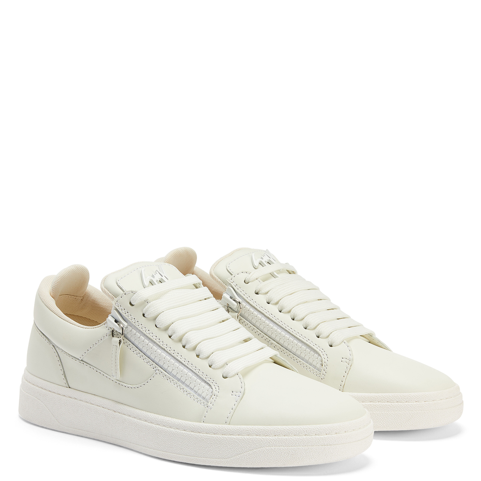 These low-top sneakers, crafted from white leather with matching cotton laces, feature a white lacquered metal ‘Signature' detail, matching side plastic zippers and rubber soles.
