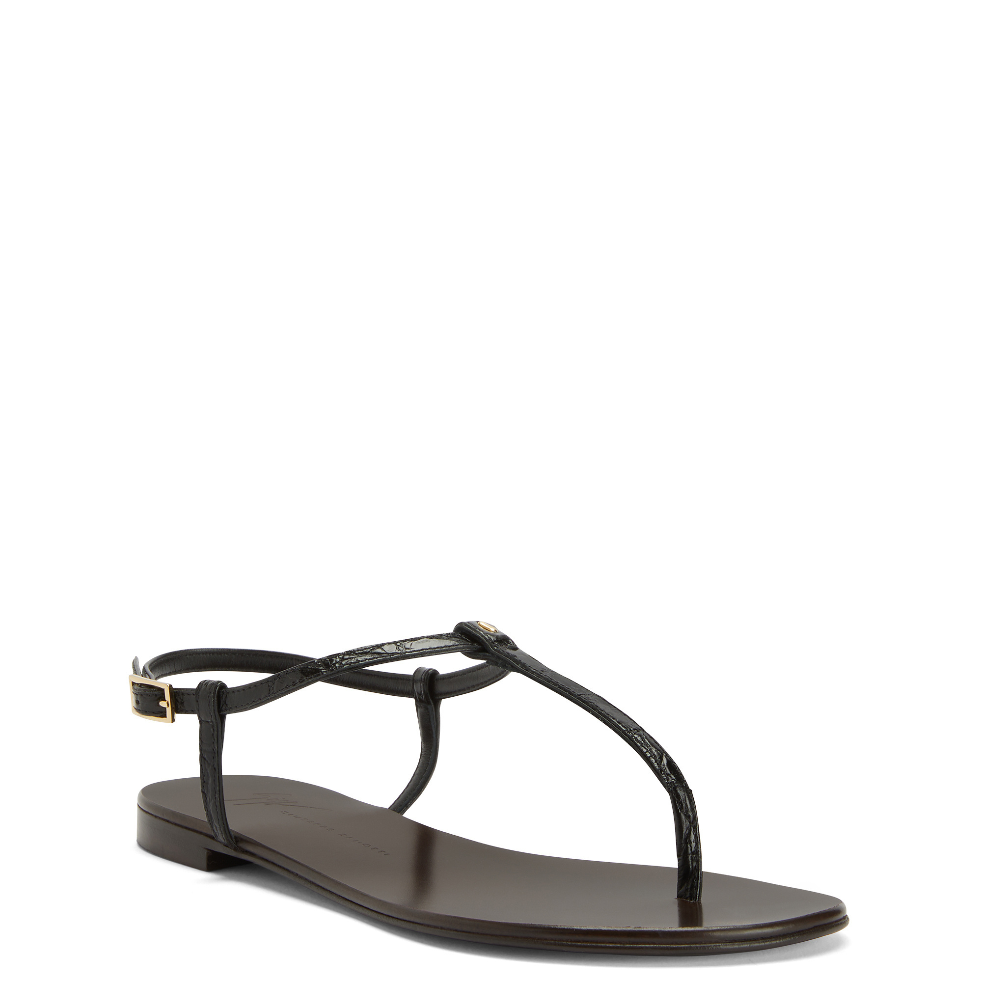 Flat thong sandals in crocodile-print leather with metal detail and adjustable strap with metallic buckle.