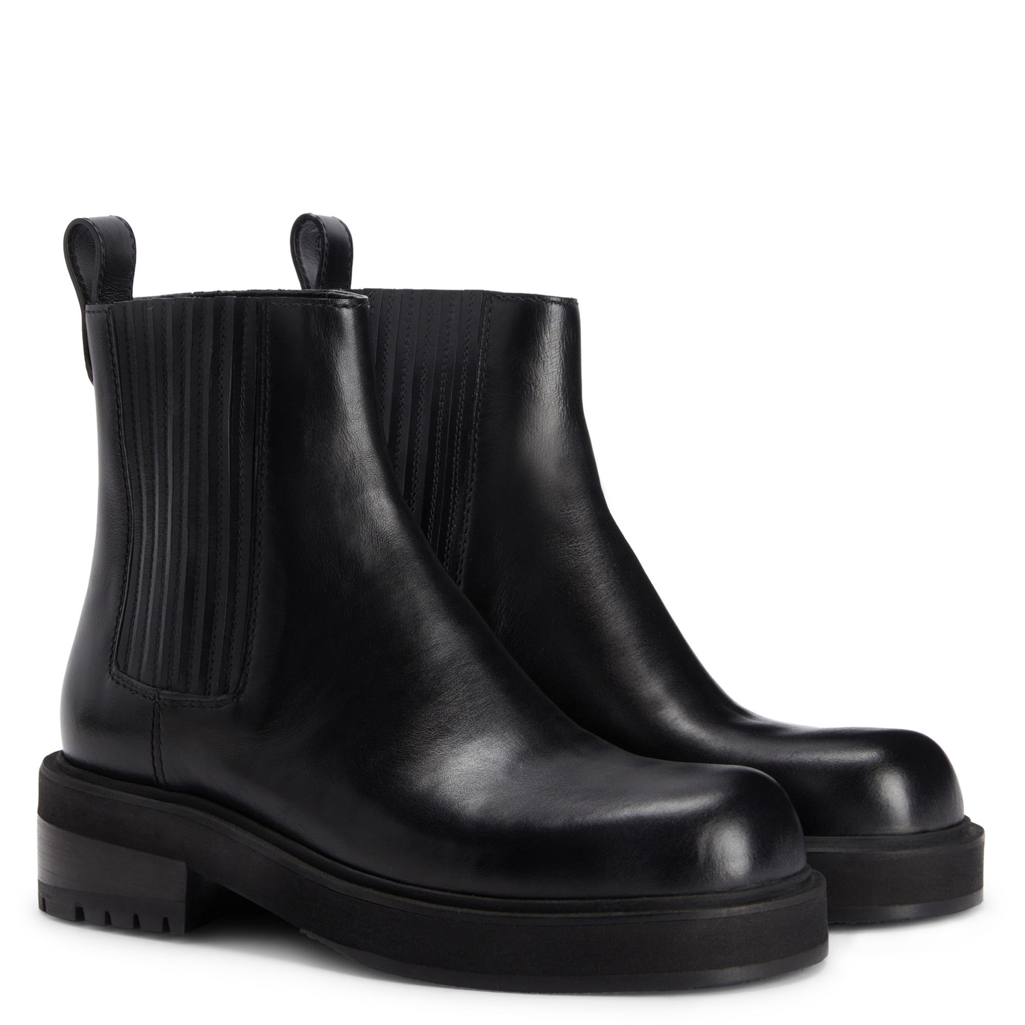 Leather Chelsea boots with leather-covered elastic insert on either side, metal detail and one-piece sole.