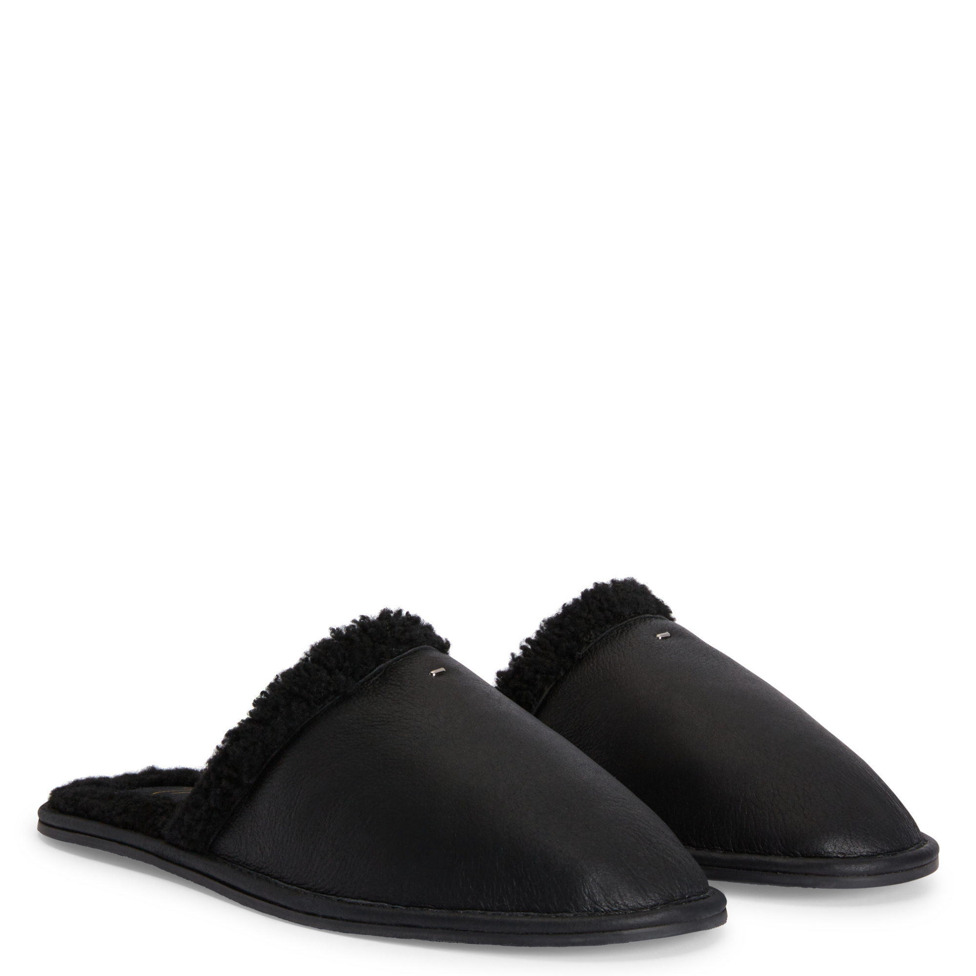 Men's leather Sleepers with a shearling lining and metallic detail.