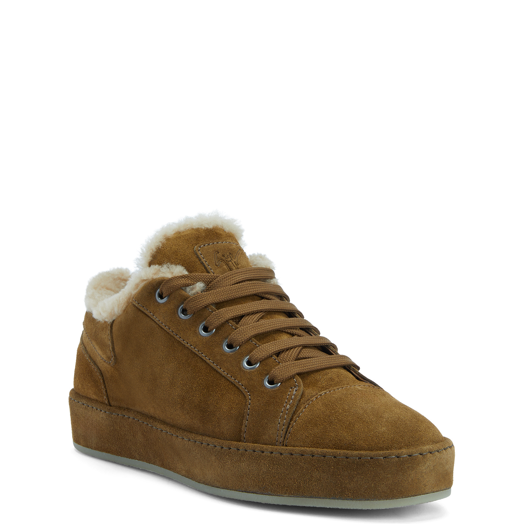 Suede lace-up low-top sneakers with sheepskin inner lining and tone-on-tone coated rubber sole.