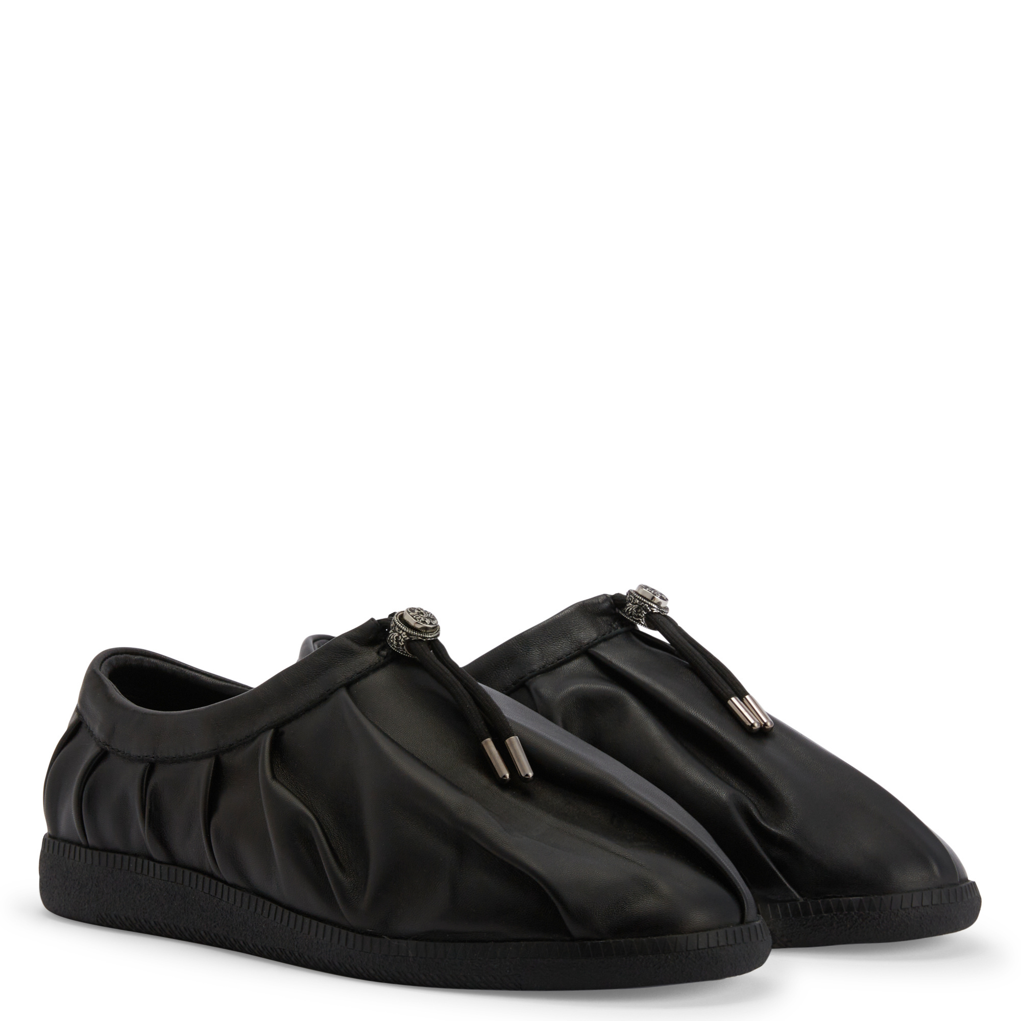 Leather low-top sneakers with a drawstring, metal aglets and stoppers, and a rubber sole.