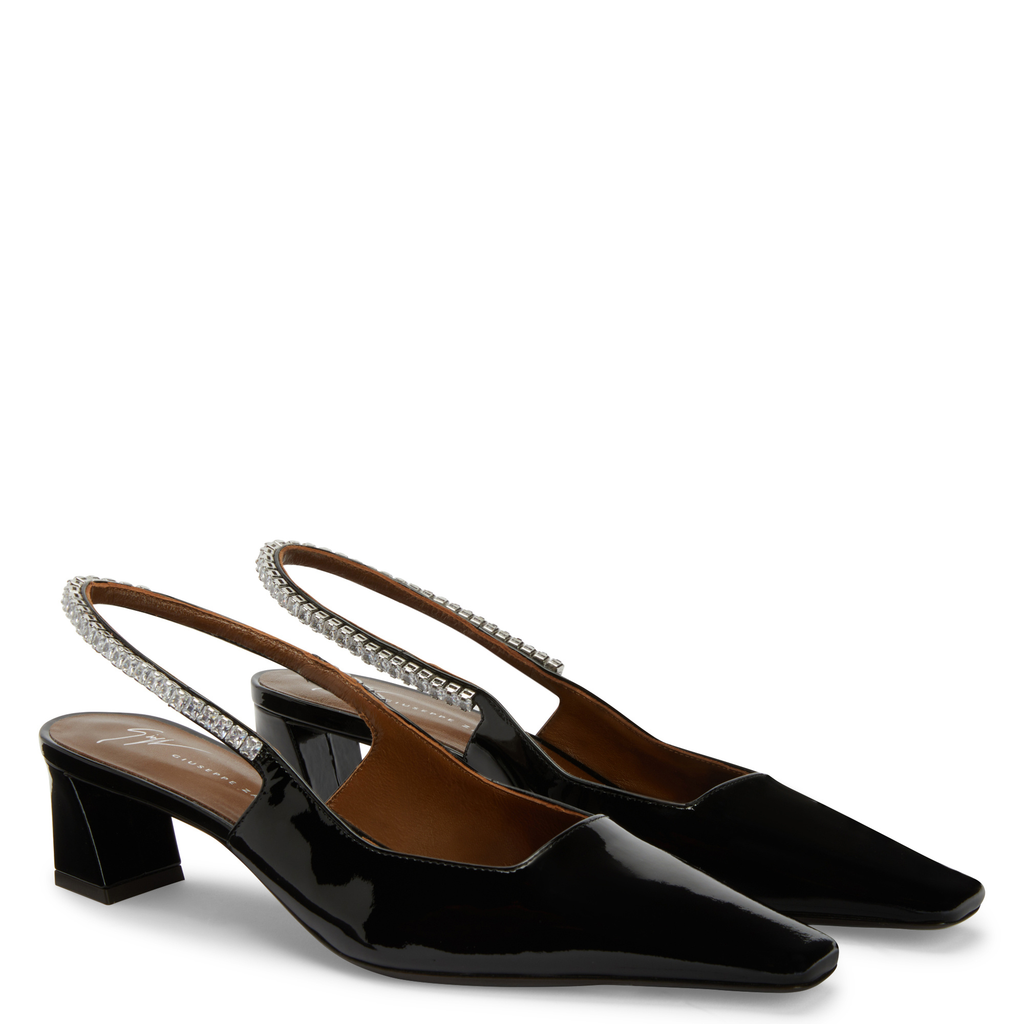 Patent leather slingbacks with square topline and toe, bejewelled rear strap and kitten heel.