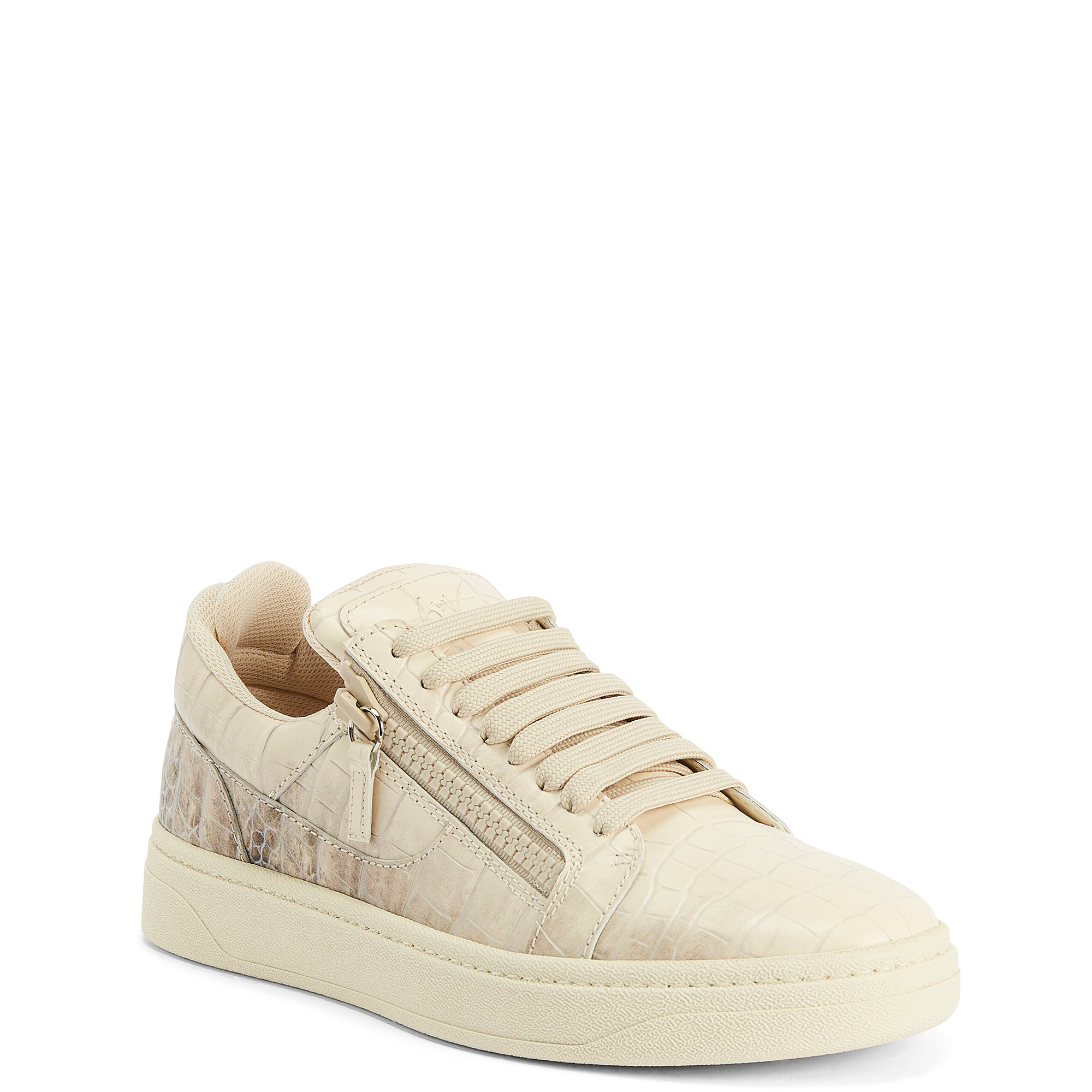Low-top lace-up sneakers in crocodile-print leather with two tonal side zips and rubber sole.