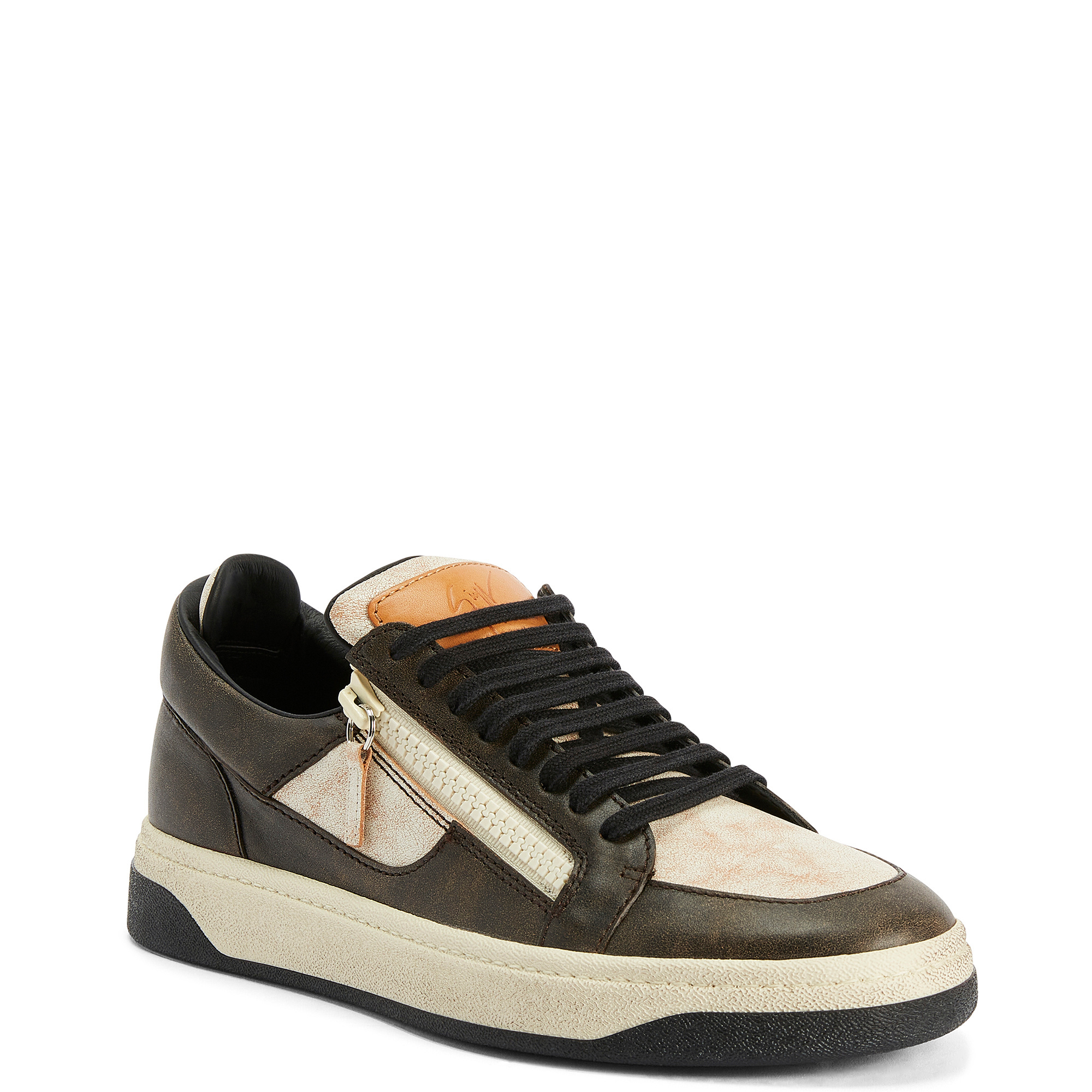 Low-top lace-up sneakers in leather with two side zips and two-tone rubber sole.
