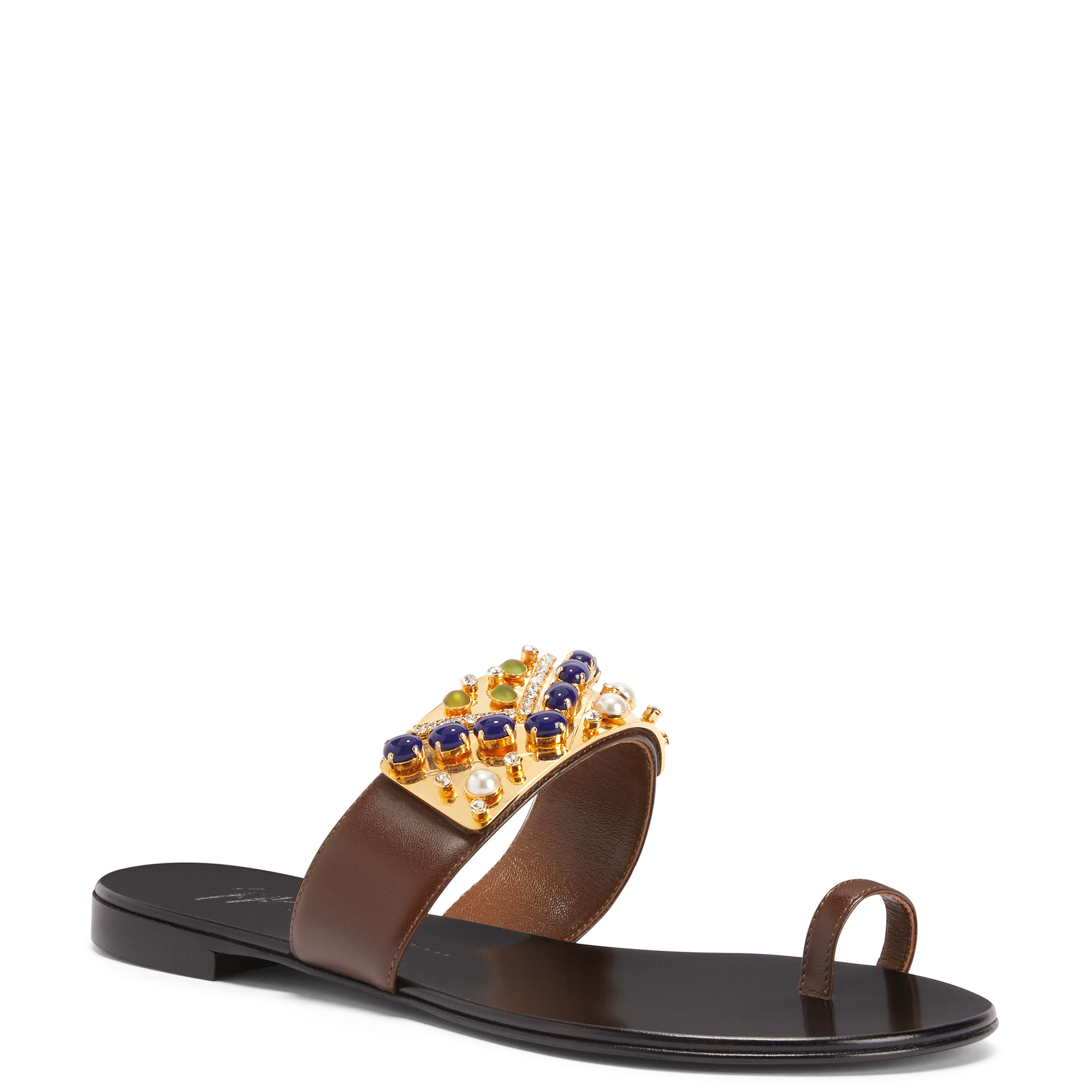 Flat leather thong sandals with metal appliqué embellished with rhinestones and cabochon stones, and leather sole.