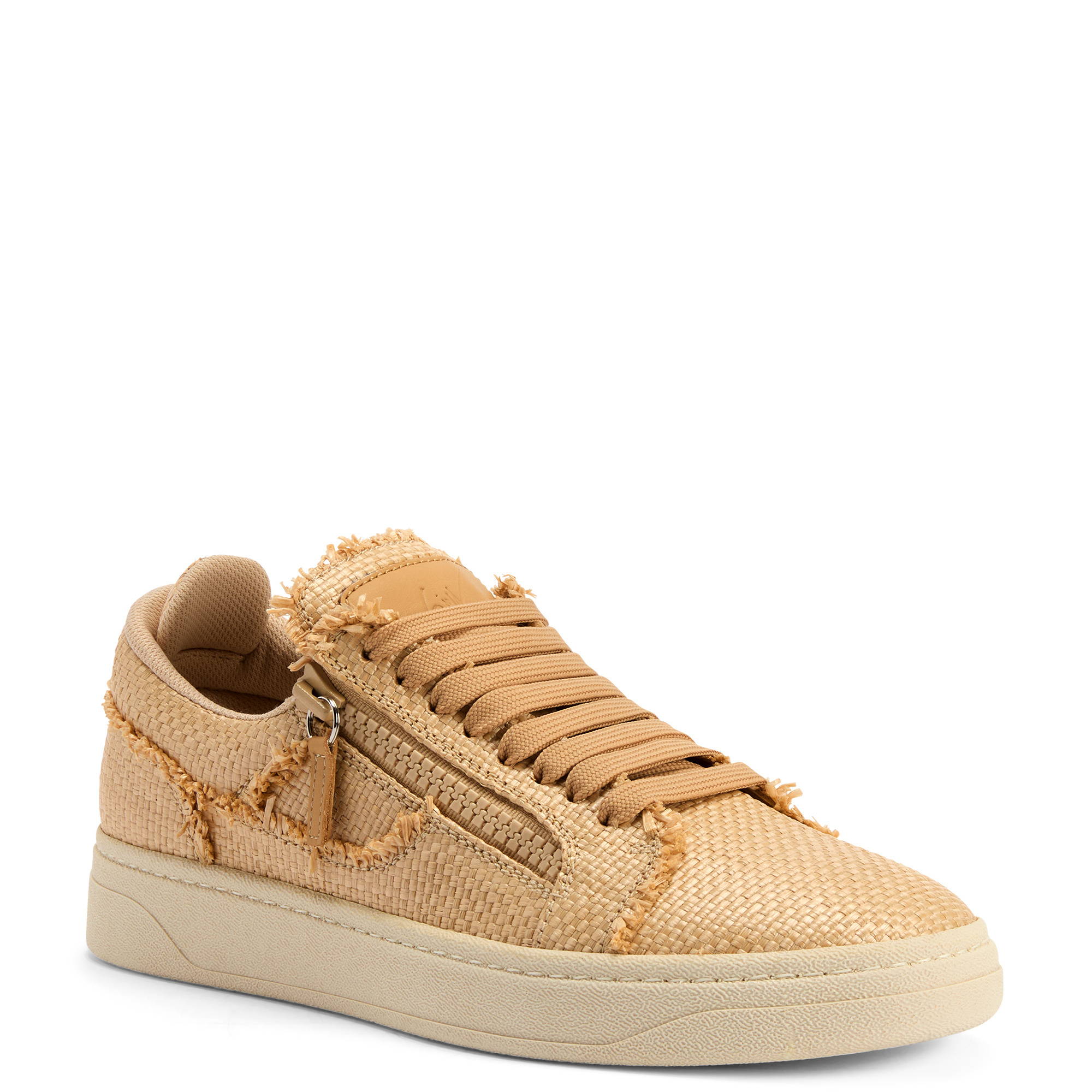 Low-top lace-up sneakers in raffia and leather with two tonal side zips and rubber sole.