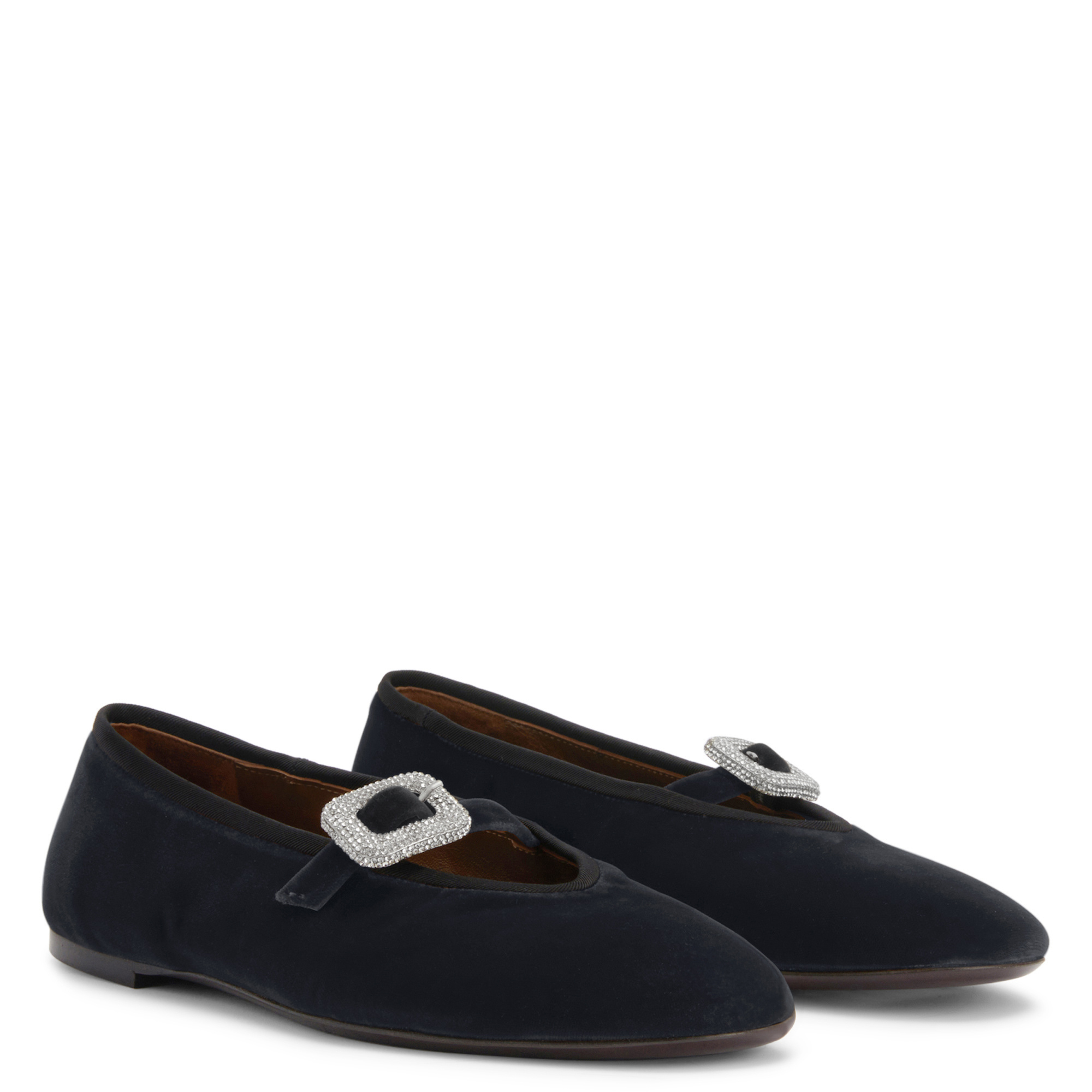 Velvet Mary Jane ballet flats with grosgrain edging and rhinestoned buckle on the strap.