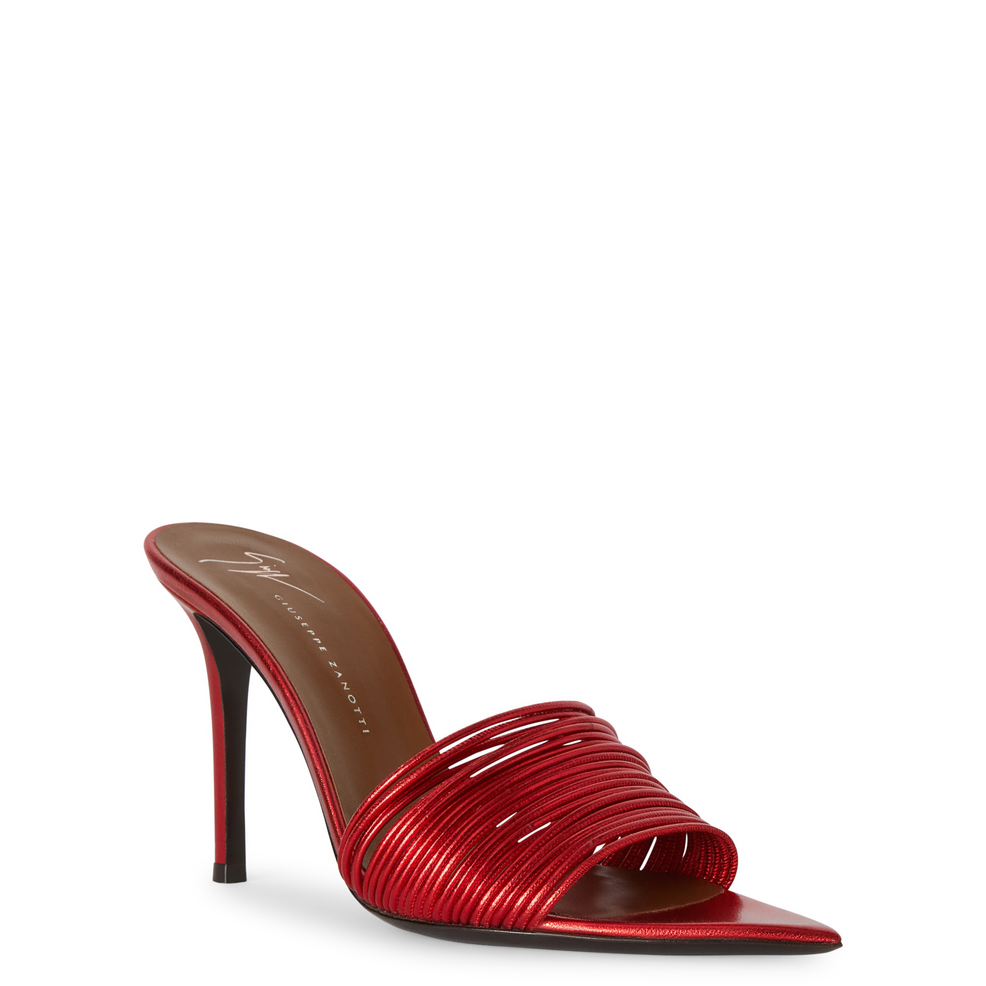 Pointed open-toe mule sandals with thin strips in laminated leather and leather-covered stiletto heel.