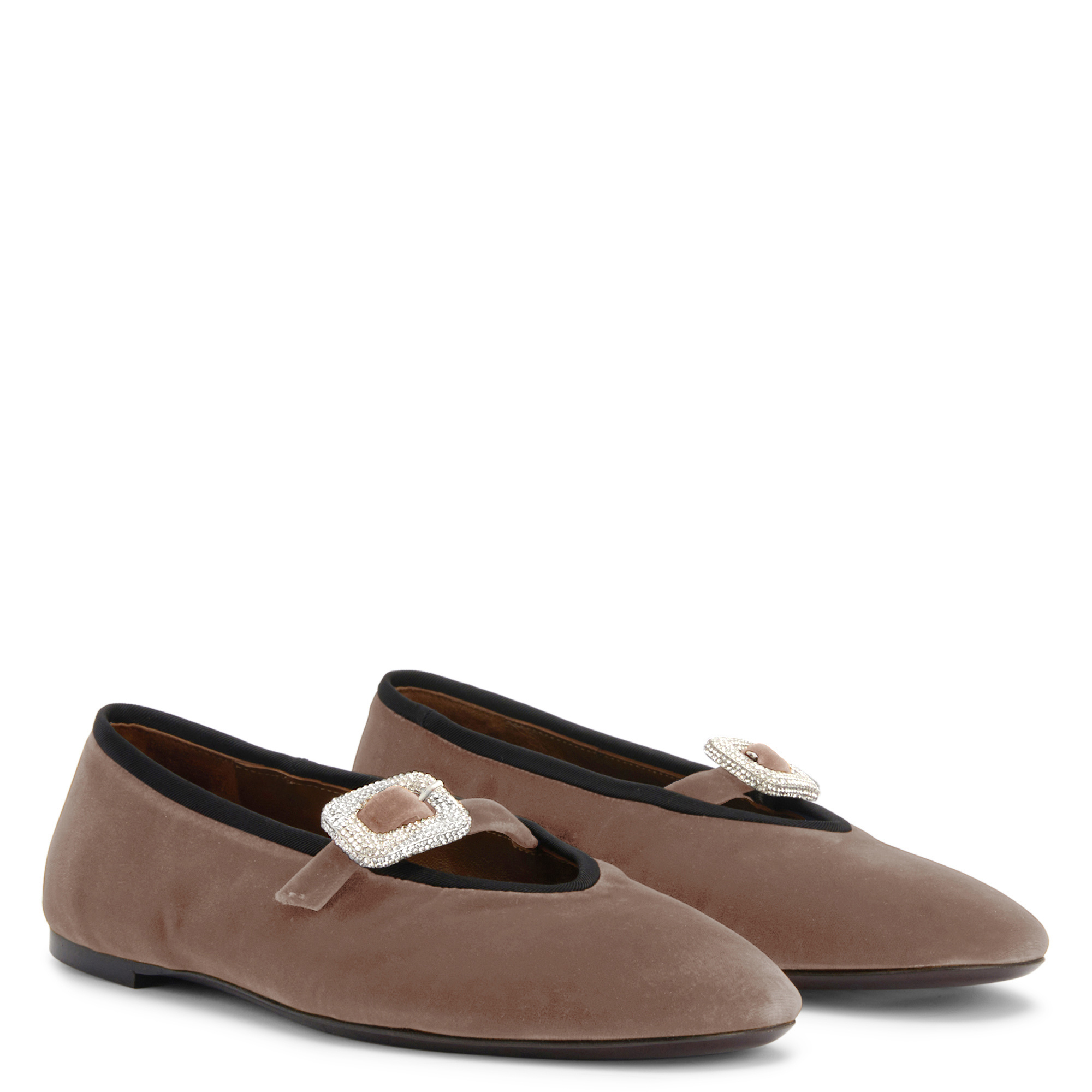 Velvet Mary Jane ballet flats with grosgrain edging and rhinestoned buckle on the strap.