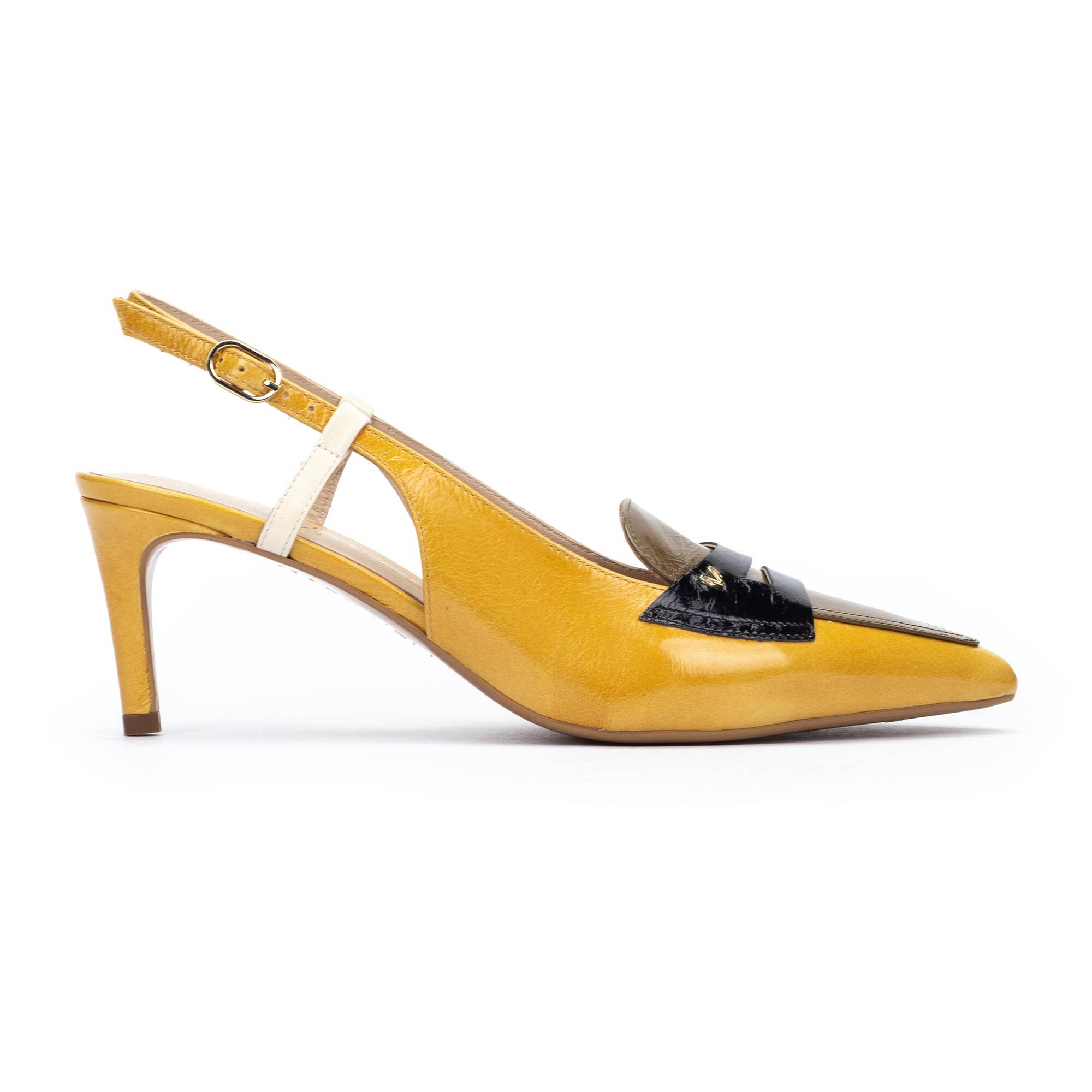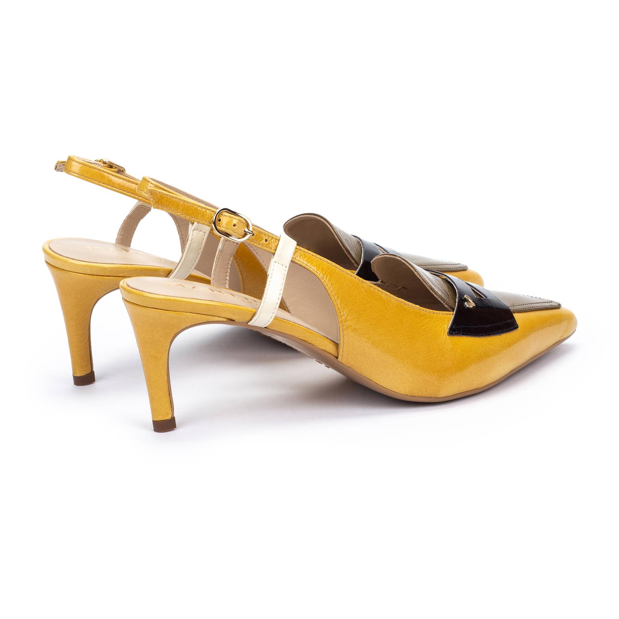 Confeccionado en piel charol, tacón de 7 cm y punta fina.