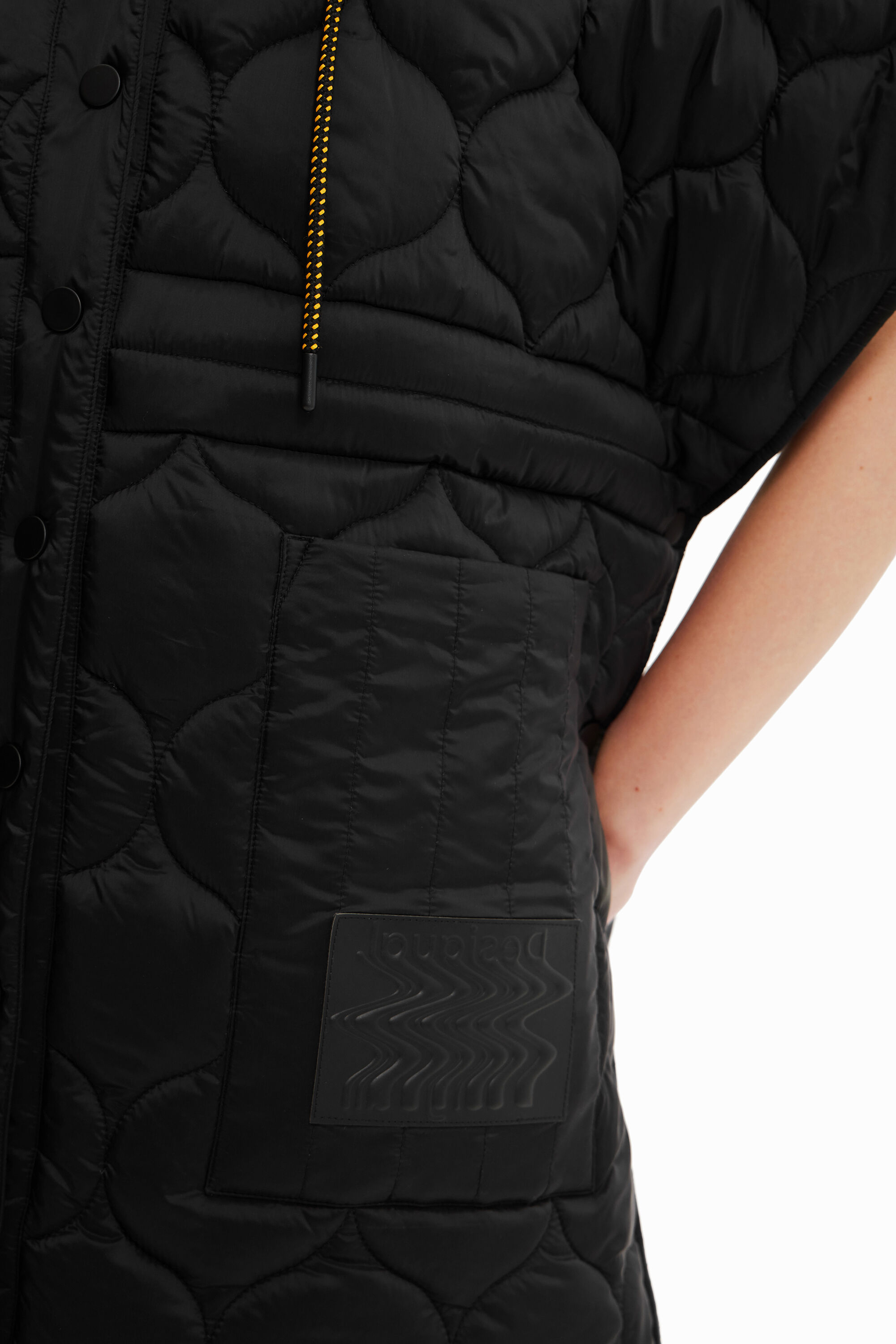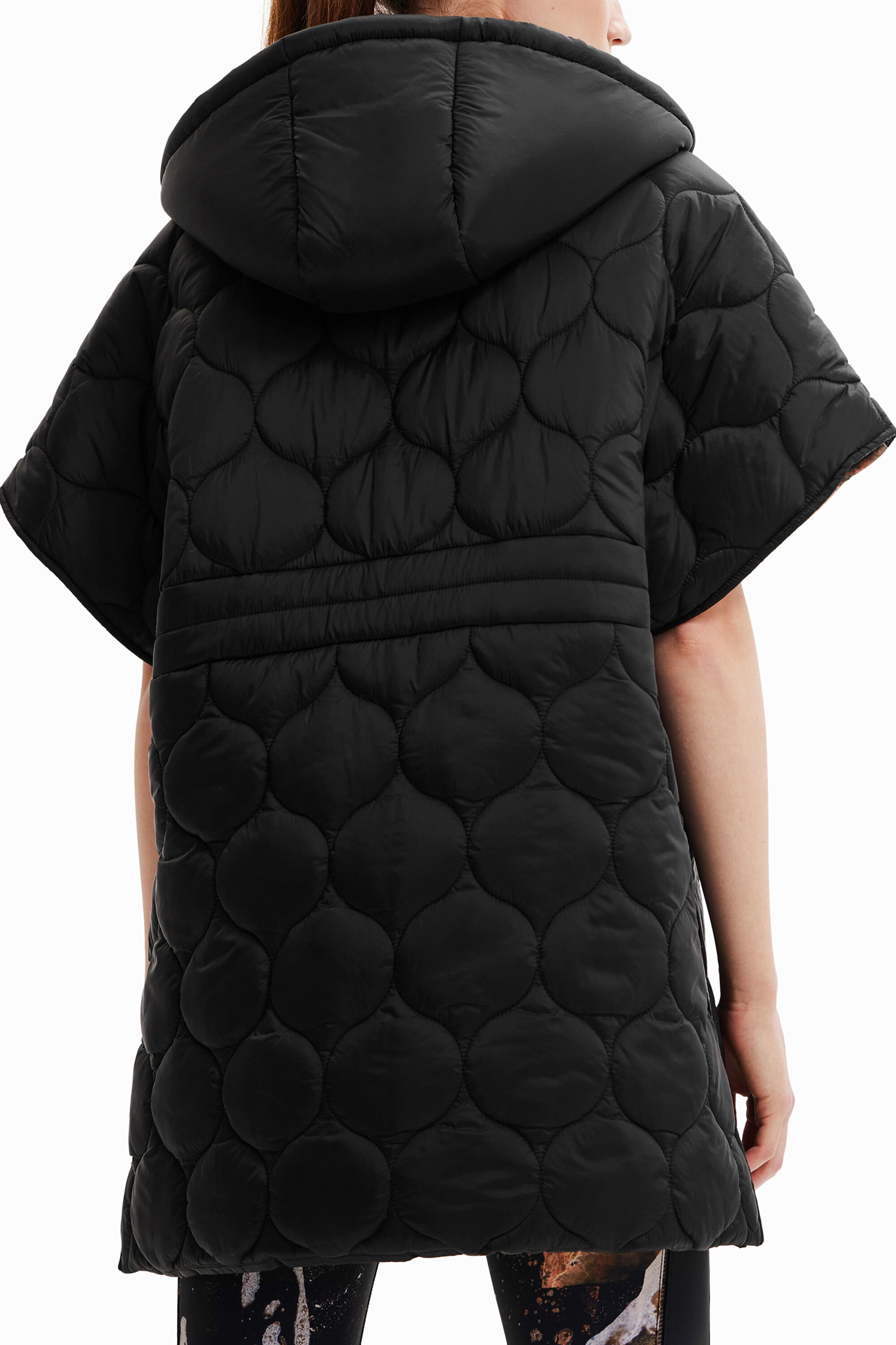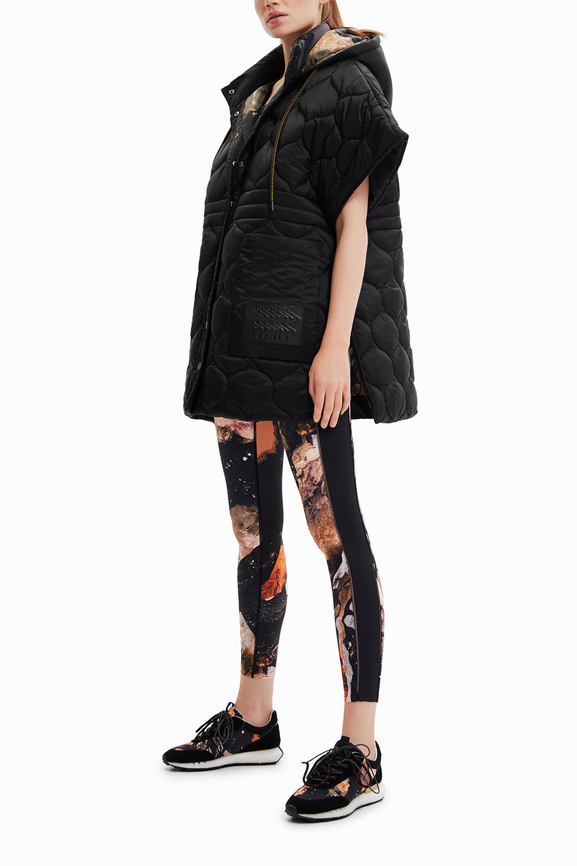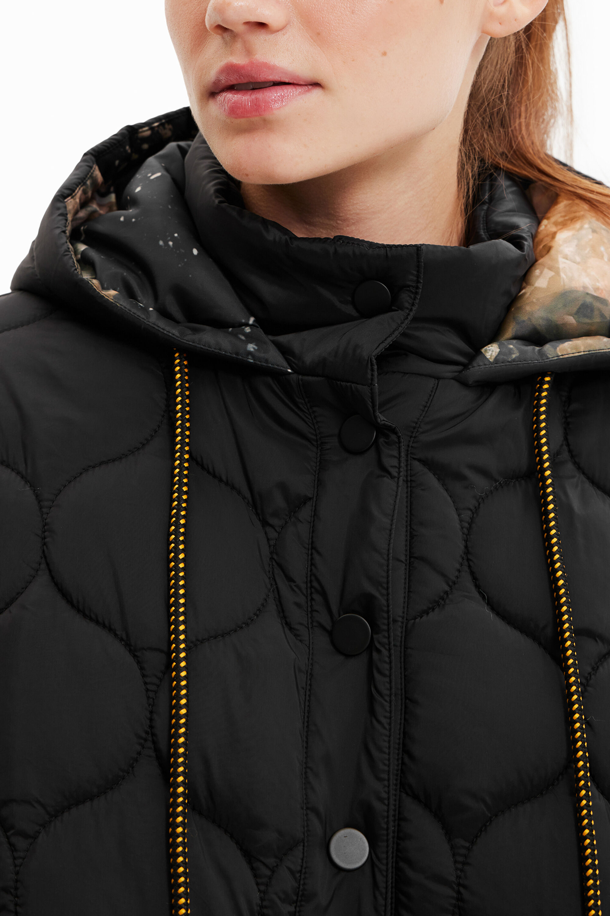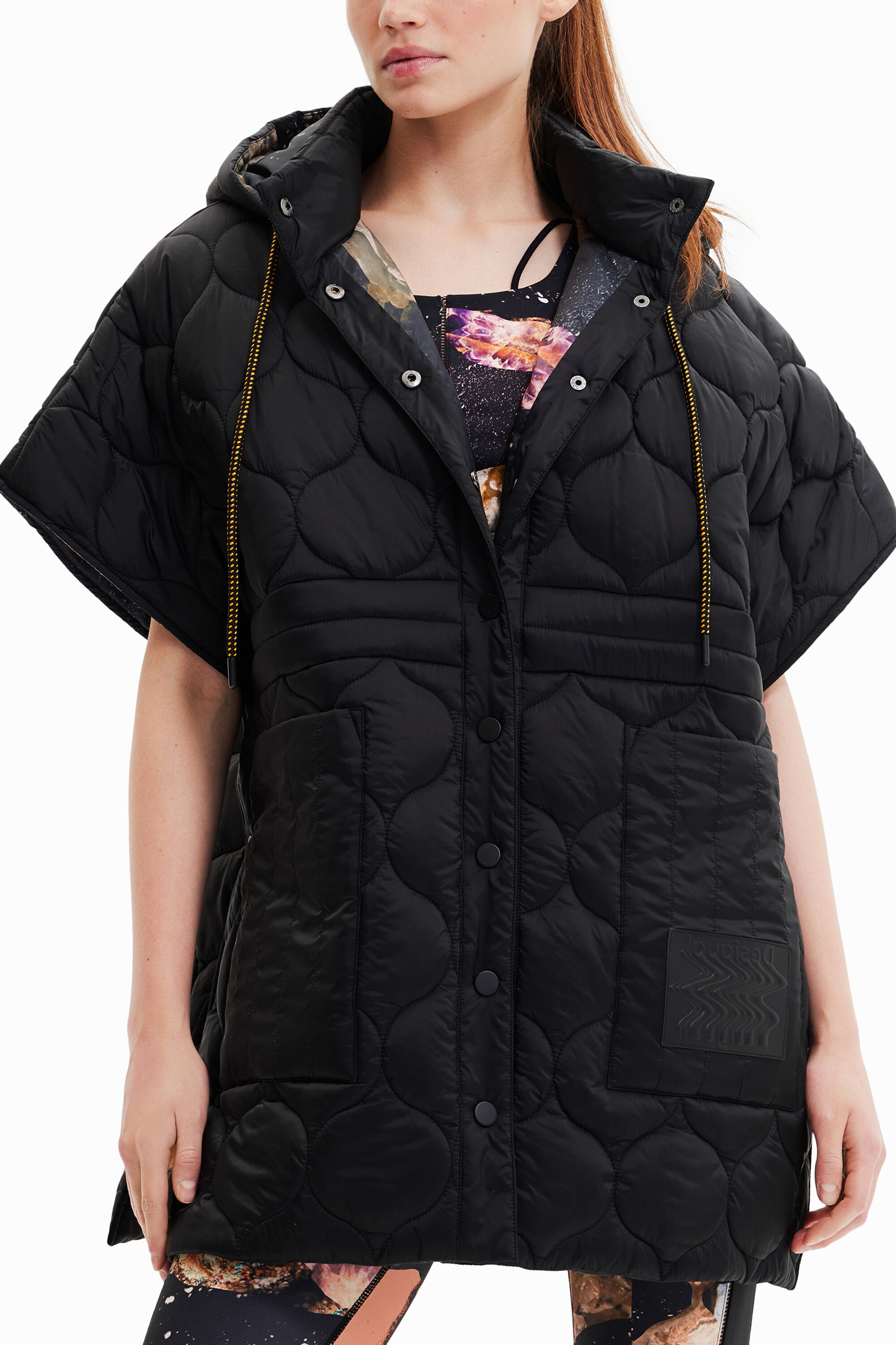 The quilting of different tops and checks displays brand identity on the outside while the inside stands out for its full-colour print.Button fasteningLarge pocketsHoodedQuilting patchwork in various shapesFull-colour printing insideDrawstring at the neck for adjustmentSide zip