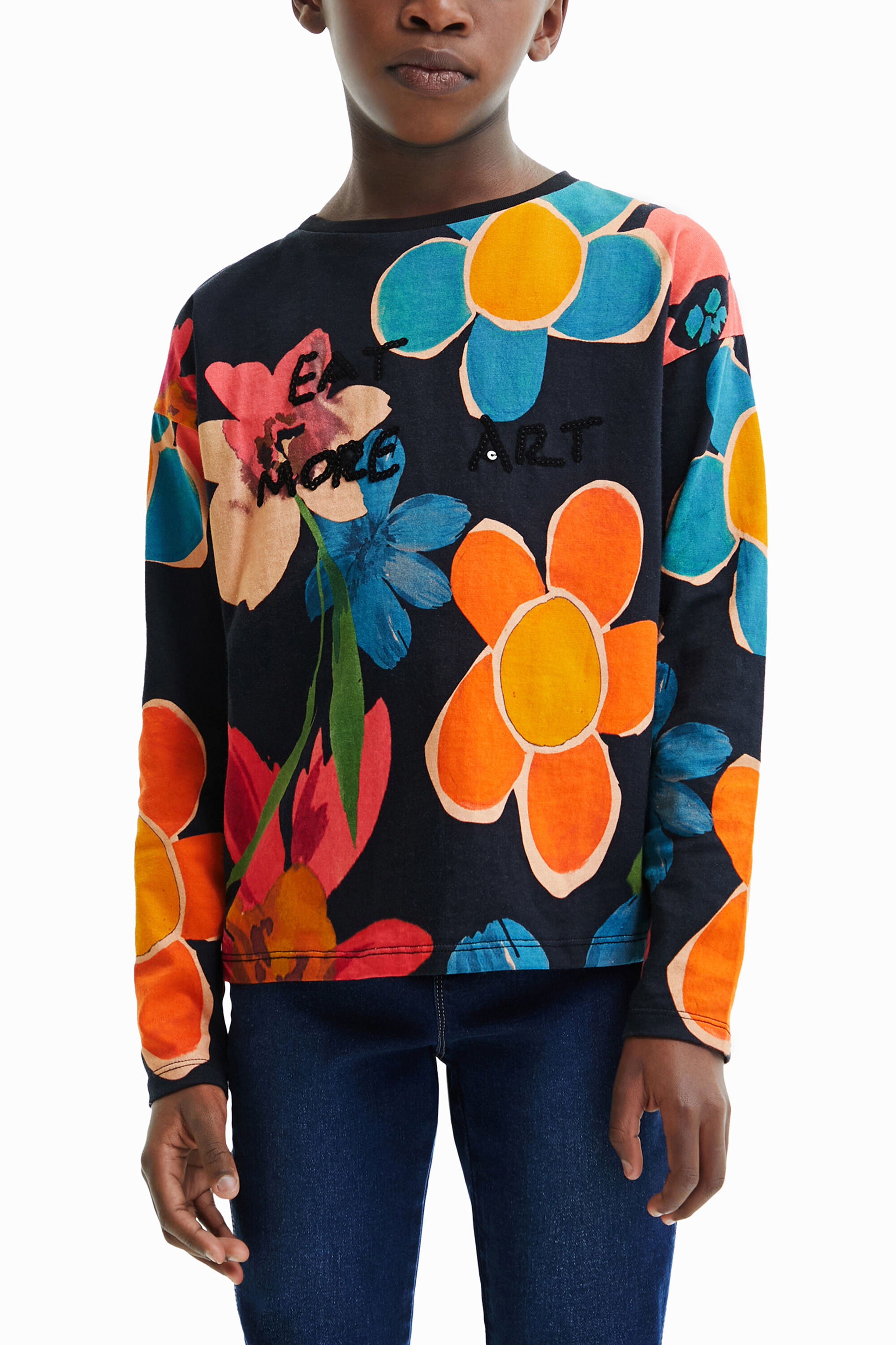 A cheerful long-sleeve T-shirt with an all-over floral print and the message “Eat More Art” embroidered in sequins on the chest.Crew neckAll-over floral print“Eat More Art” message embroidered in sequinsWe are a proud member of the Better Cotton Initiative.