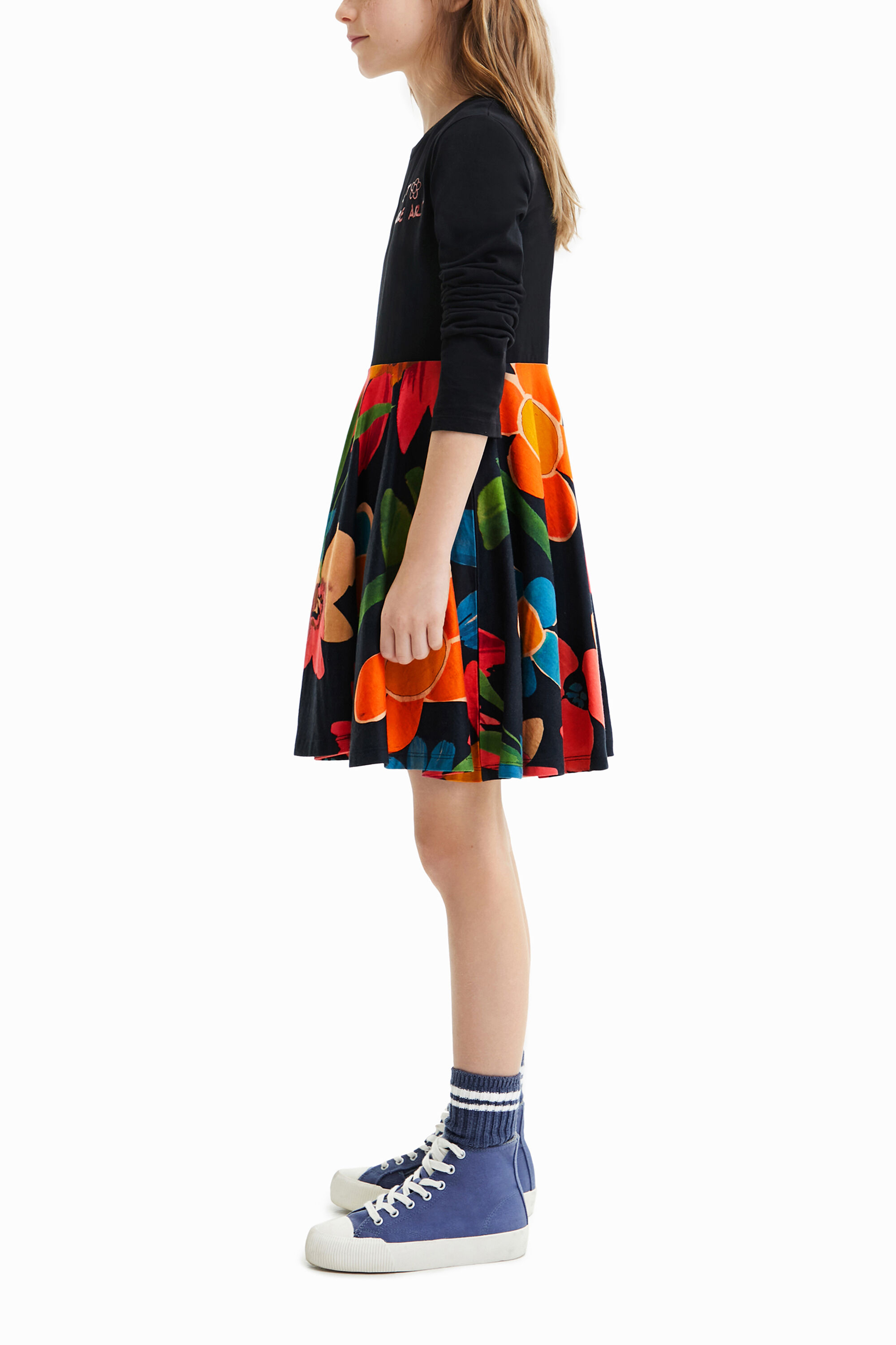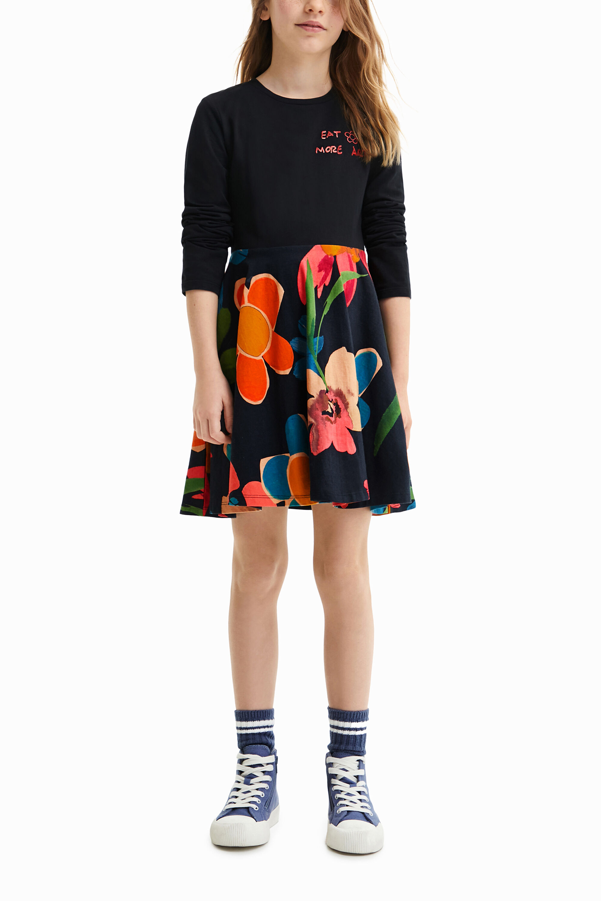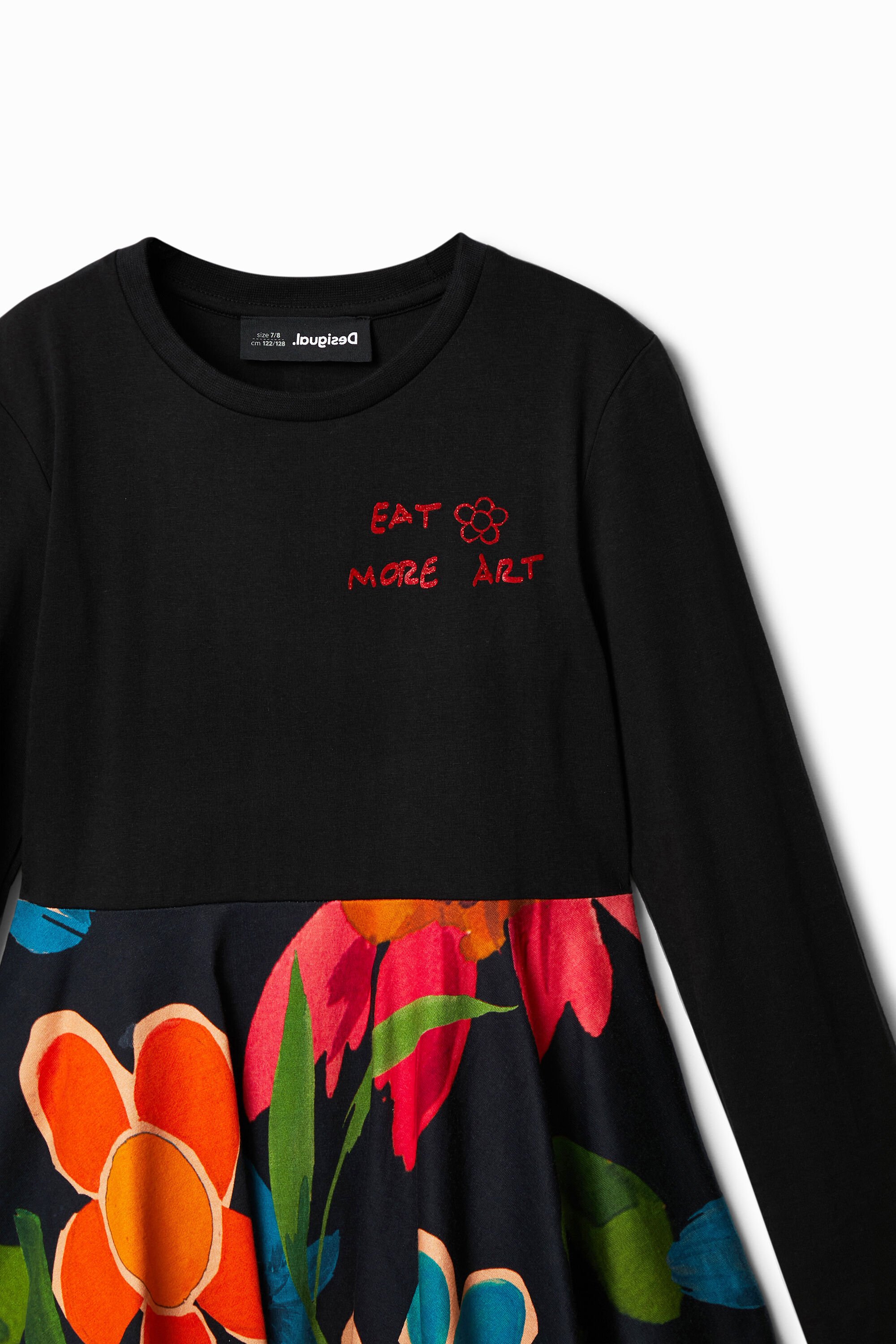 A two-in-one long-sleeve dress where the top is in a plain colour with “Eat More Art” text and the bottom is a floral print tulle skirt.Crew neckFloral print“Eat More Art” text in glitter effect on the front sideRibbed fabric on the topWe are a proud member of the Better Cotton Initiative.