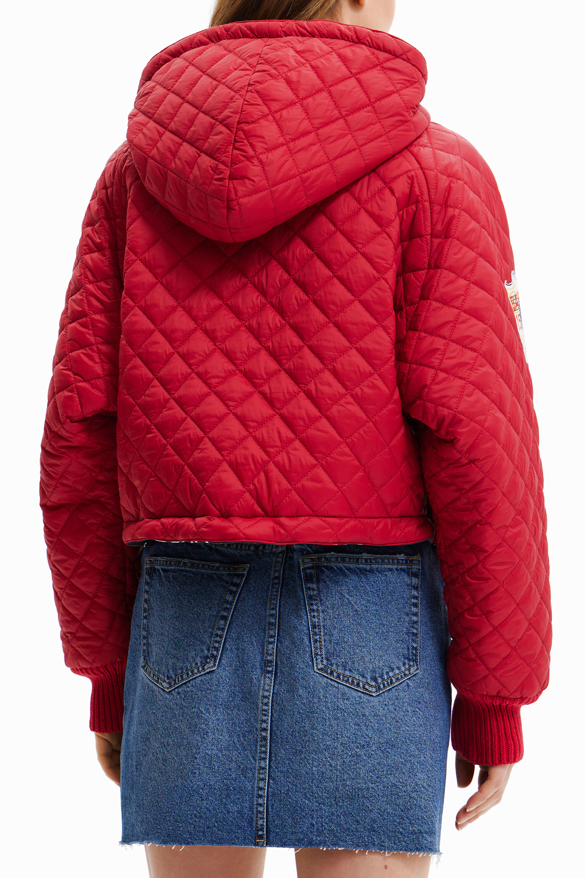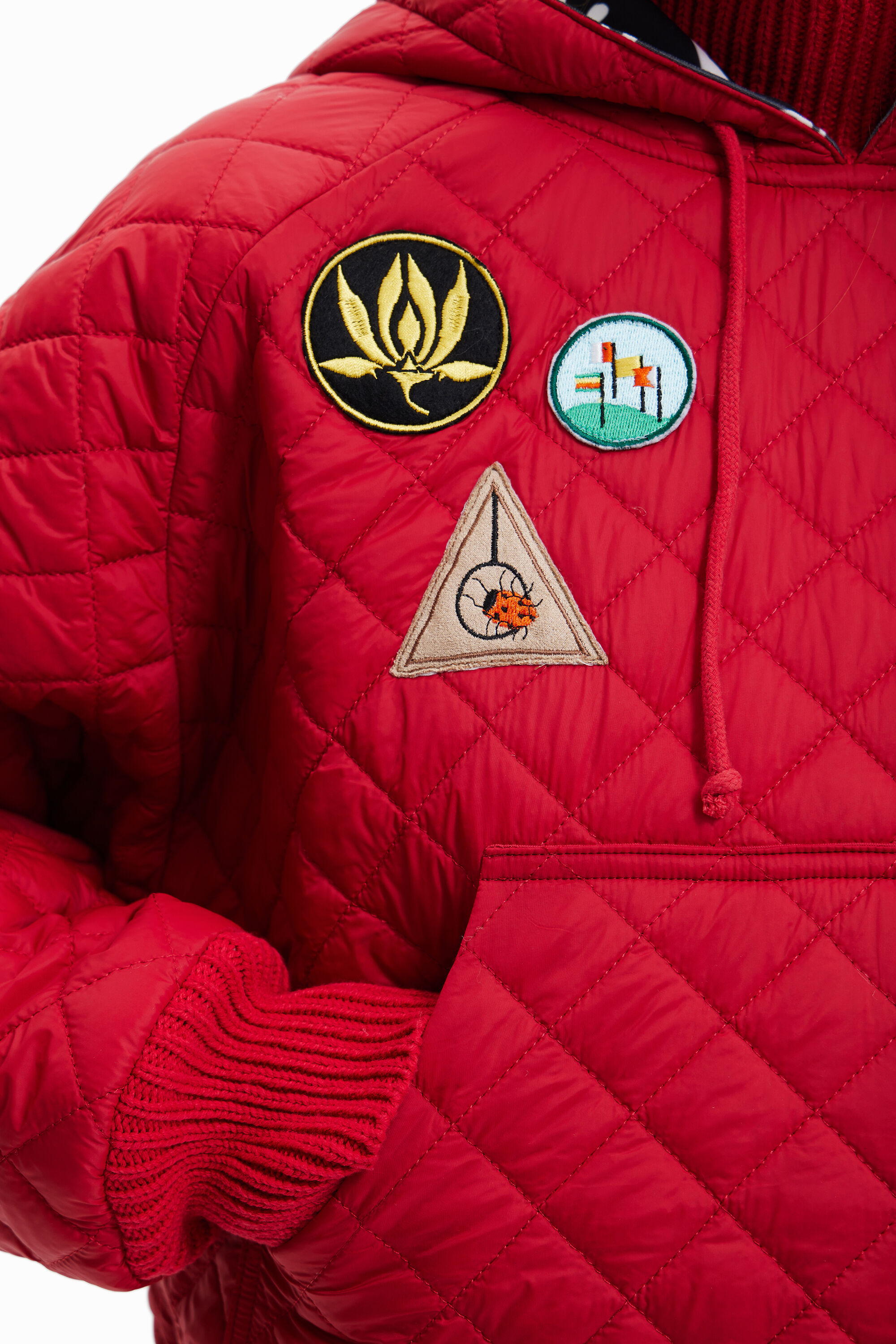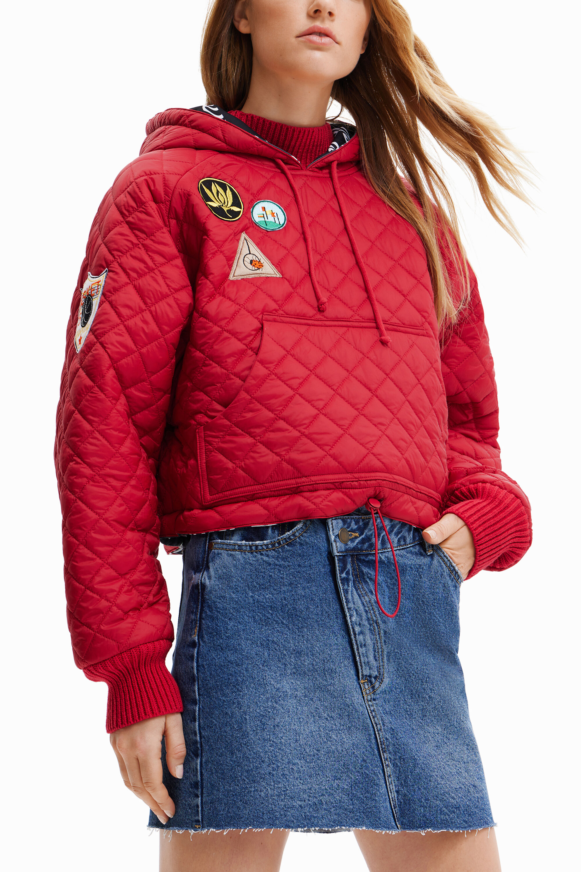 Made from recycled fibres.Crew neckOne front pocketHood with printed liningPatch details on shoulder and chest.Adjustable waistSustainable fibres: Recycled polyesterLoose fitLength: CroppedLong sleeves