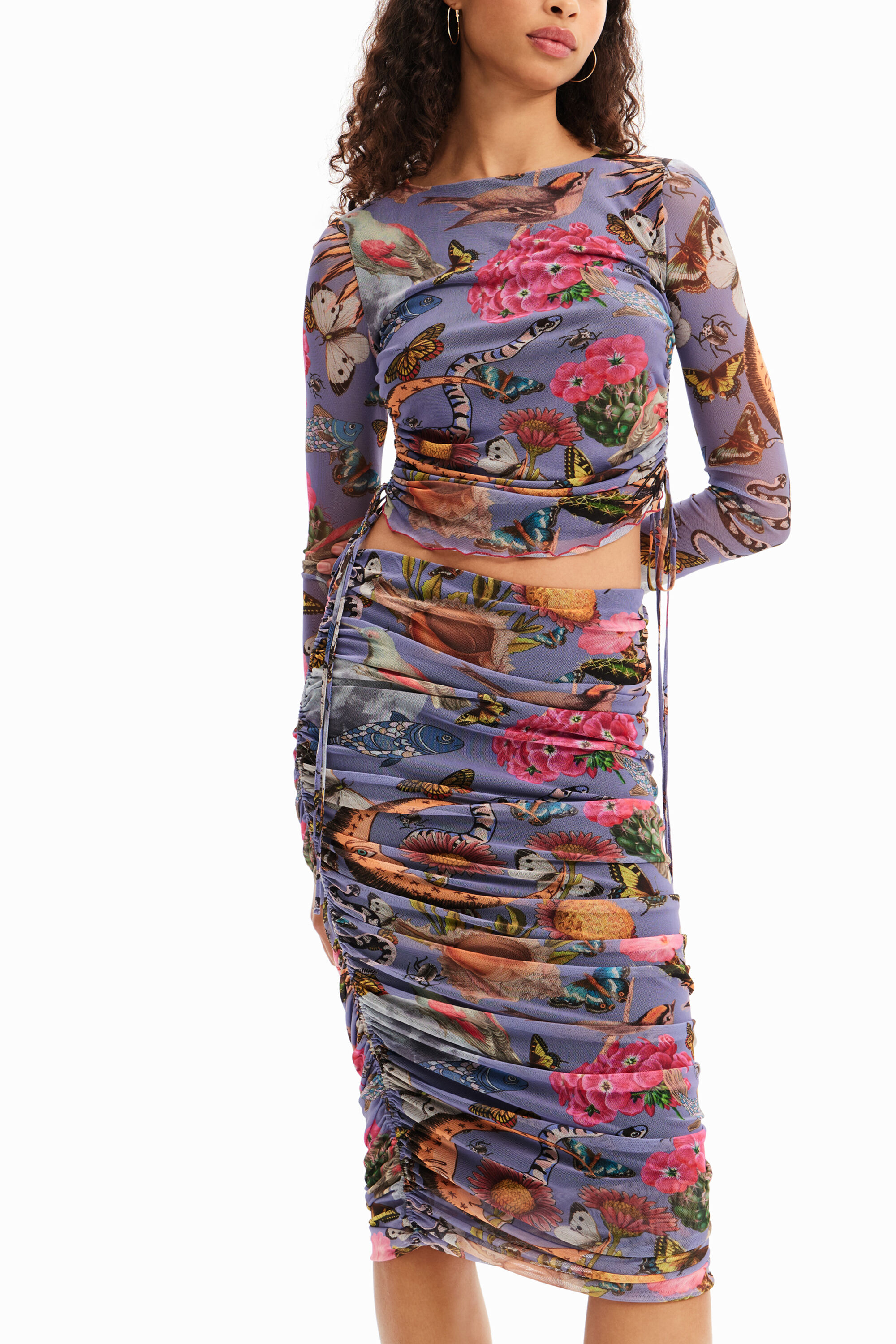 A fitted midi skirt in draped ruched tulle with an animal and plant print.Fit: