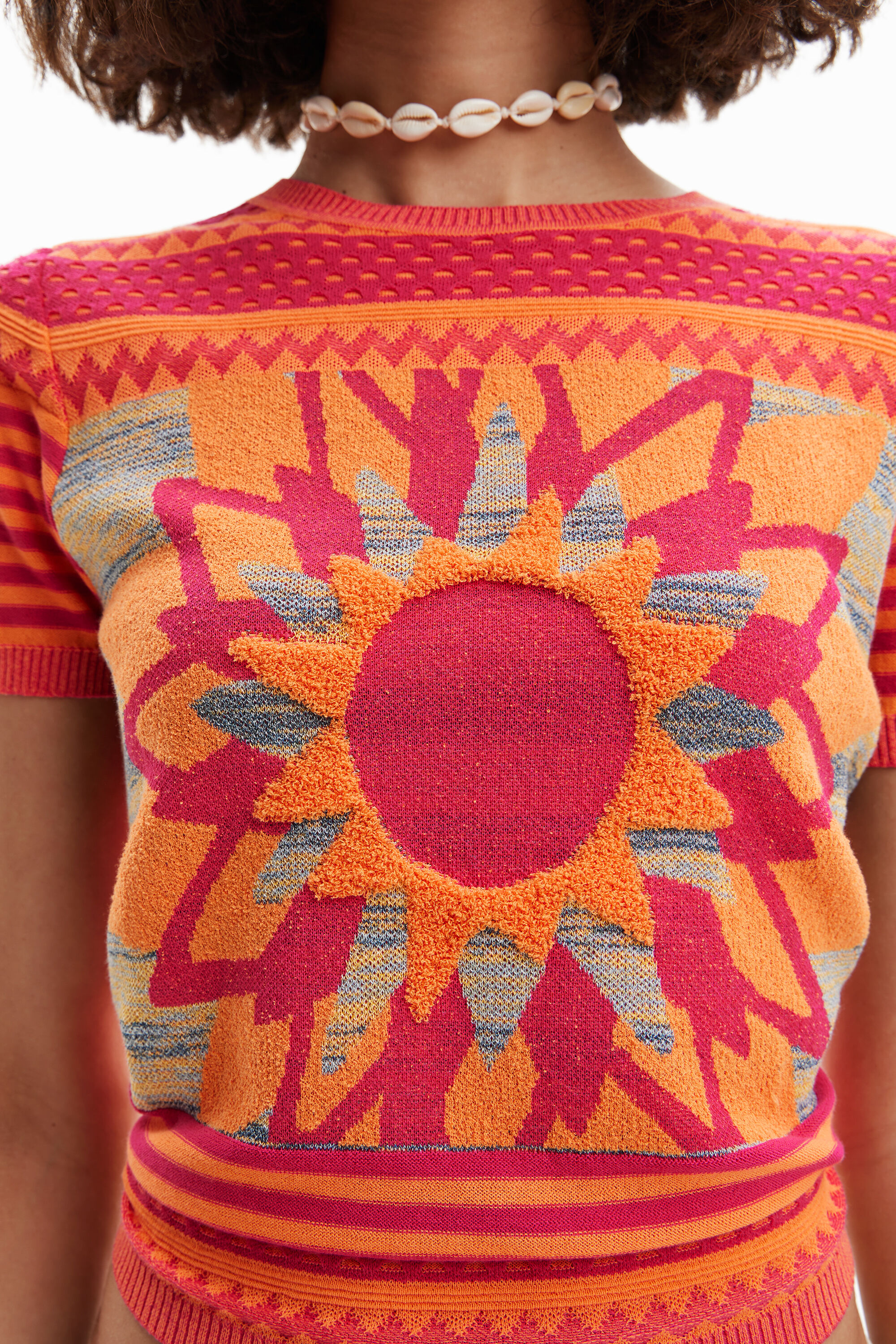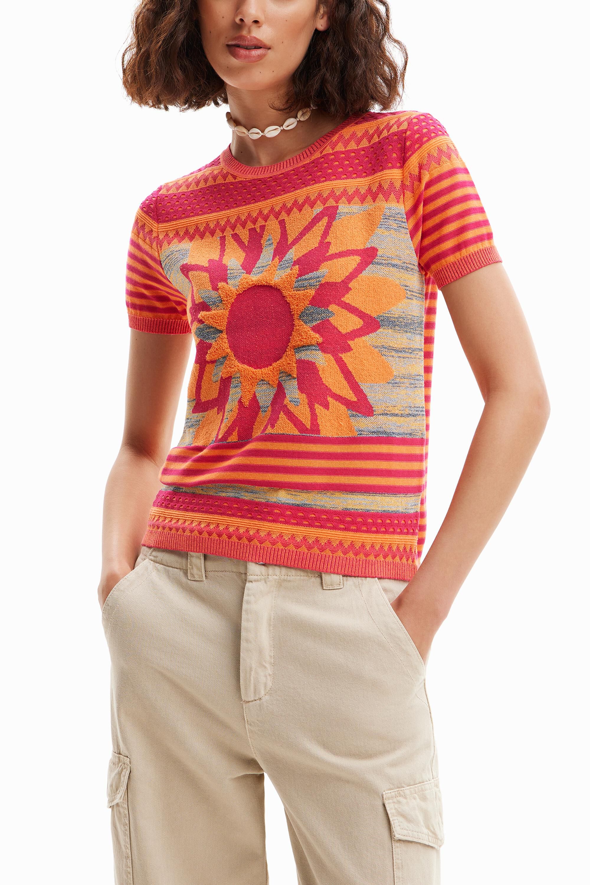 A short-sleeve T-shirt in multicolour knit with borders and a flower on the front.Fit: RegularKnit with front border and flower design in warm tonesRound neckShort sleevesSpace-dye gradient knitRibbed-finish collar, sleeves and hemBy buying cotton products from Desigual, you’re supporting our investment in Better Cotton.