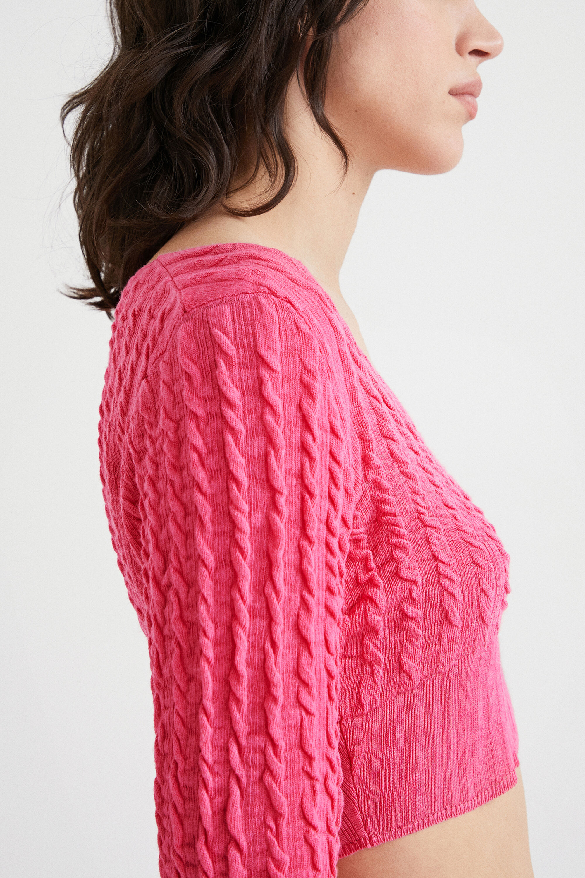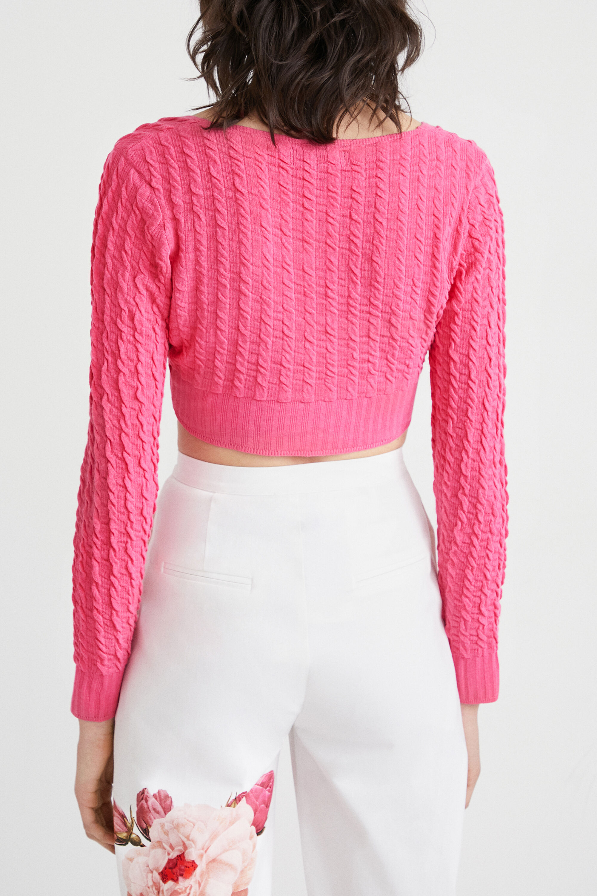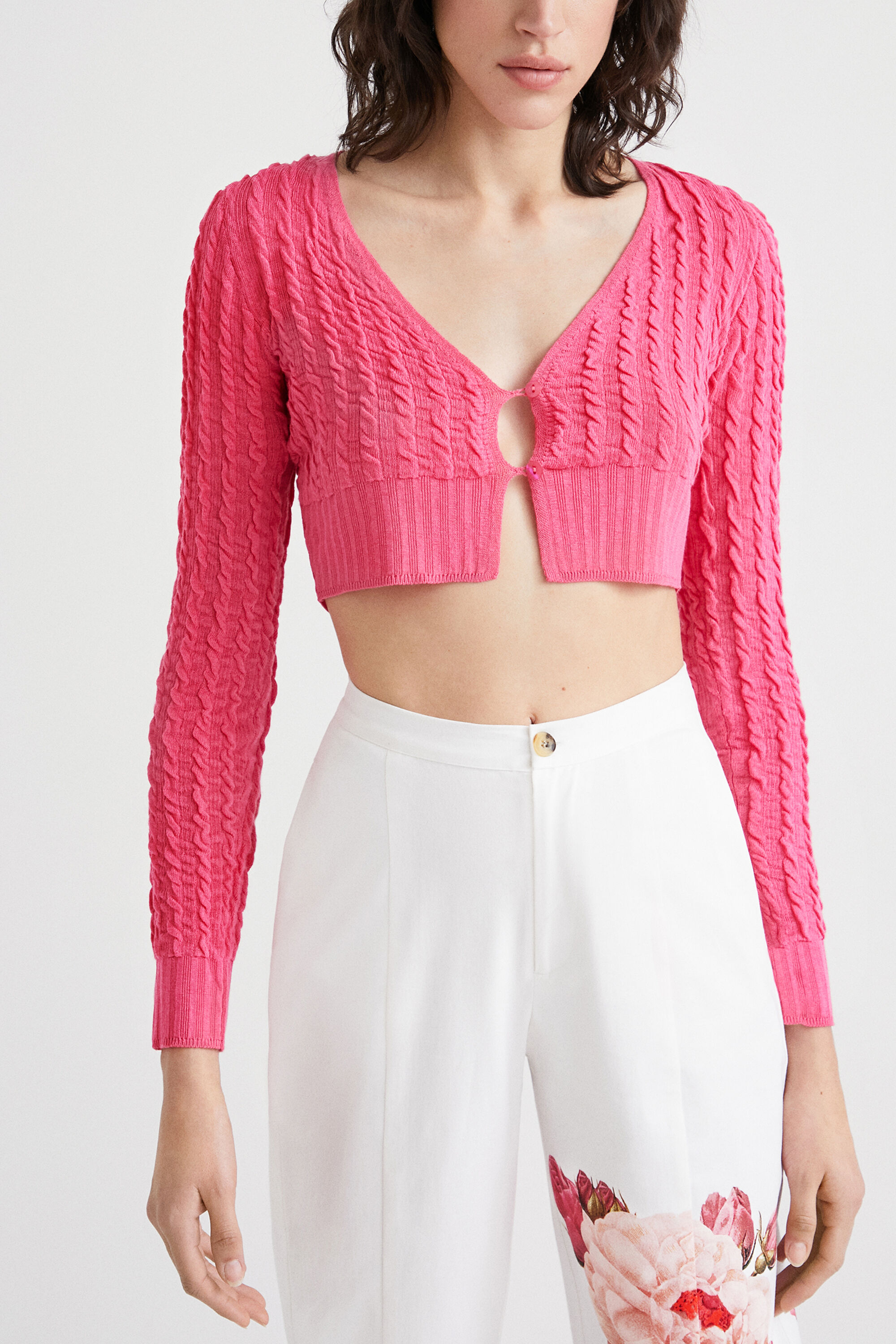 the silhouette of this eco-friendly knit cardigan is very flattering.V-neckButton fasteningCropped waistCable knit fabricRegular fitFitted long sleevesEco-friendly fabric