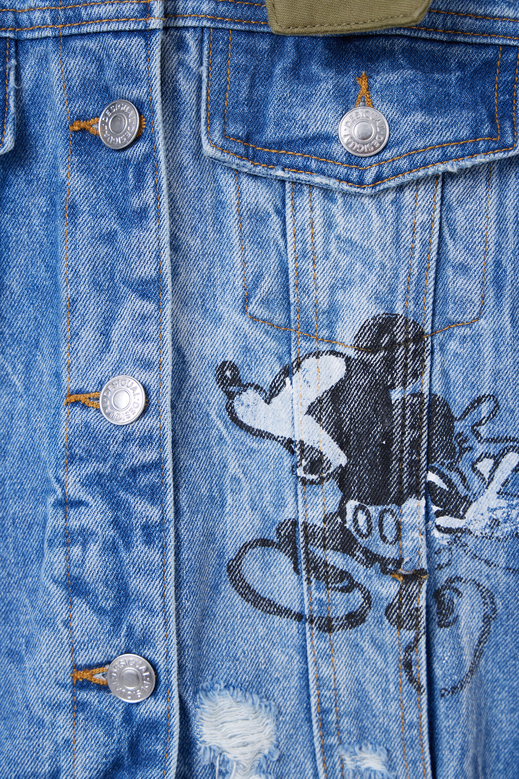 A hybrid garment that combines a denim trucker jacket at the front with a parka at the back featuring a Disney's Mickey Mouse print interpreted by artist Pink Morro.Fit: RegularPrint of Disney's Mickey Mouse by artist Pink Morro with splatter on the backShirt collarDetachable hood with drawstringsLong sleevesFour front pocketsButton fasteningMini me version: jacket also available in the Woman collectionDistressed details and ripsBy buying cotton products from Desigual, you’re supporting our investment in Better Cotton.