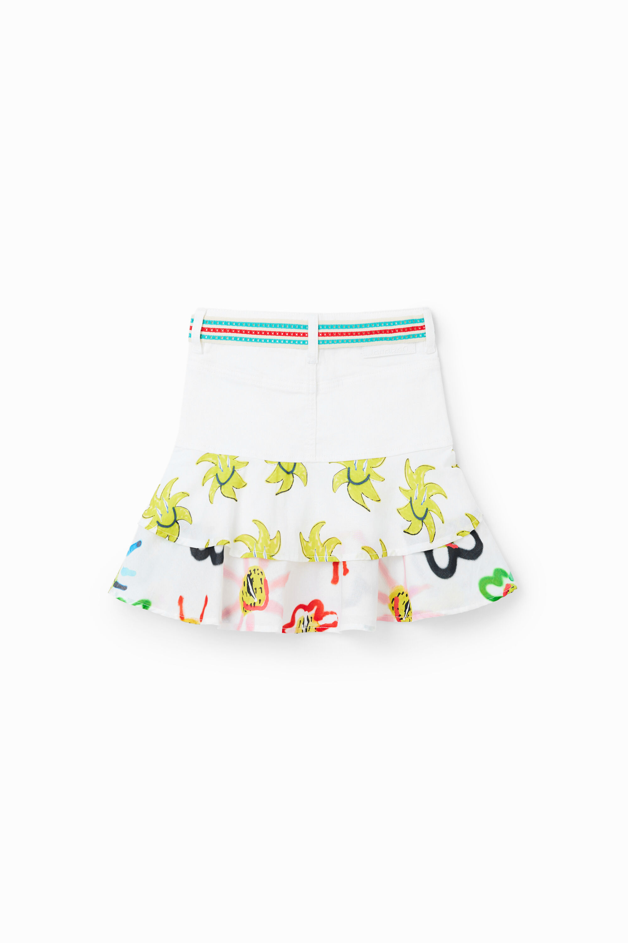 A combination denim short skirt with printed double ruffles.Fit: A-lineLength: ShortSun and flower print in hand-painted effectDetachable tie beltFive pocketsButton and zip closureFabric with a hint of stretchBy buying cotton products from Desigual, you’re supporting our investment in Better Cotton.