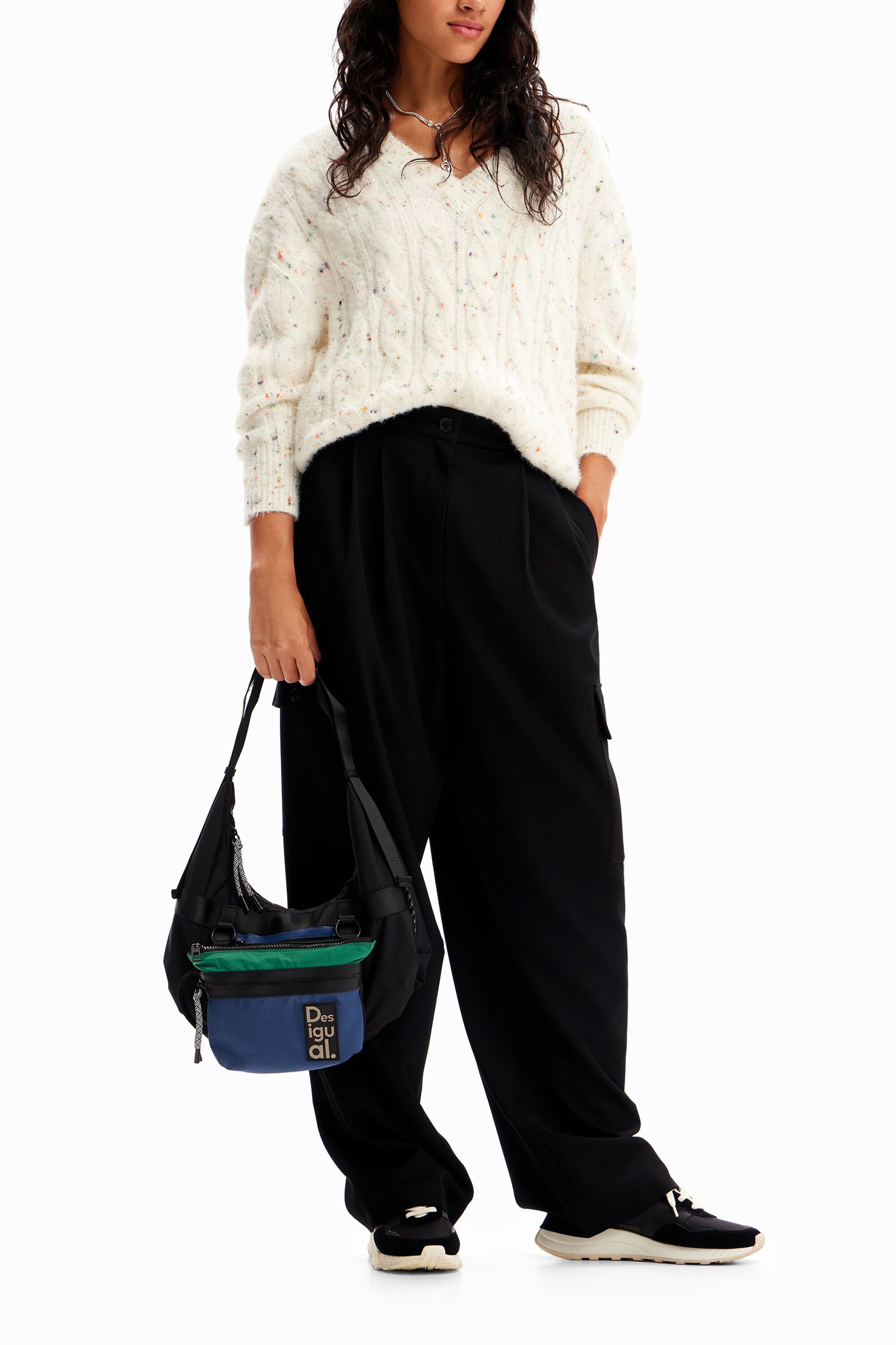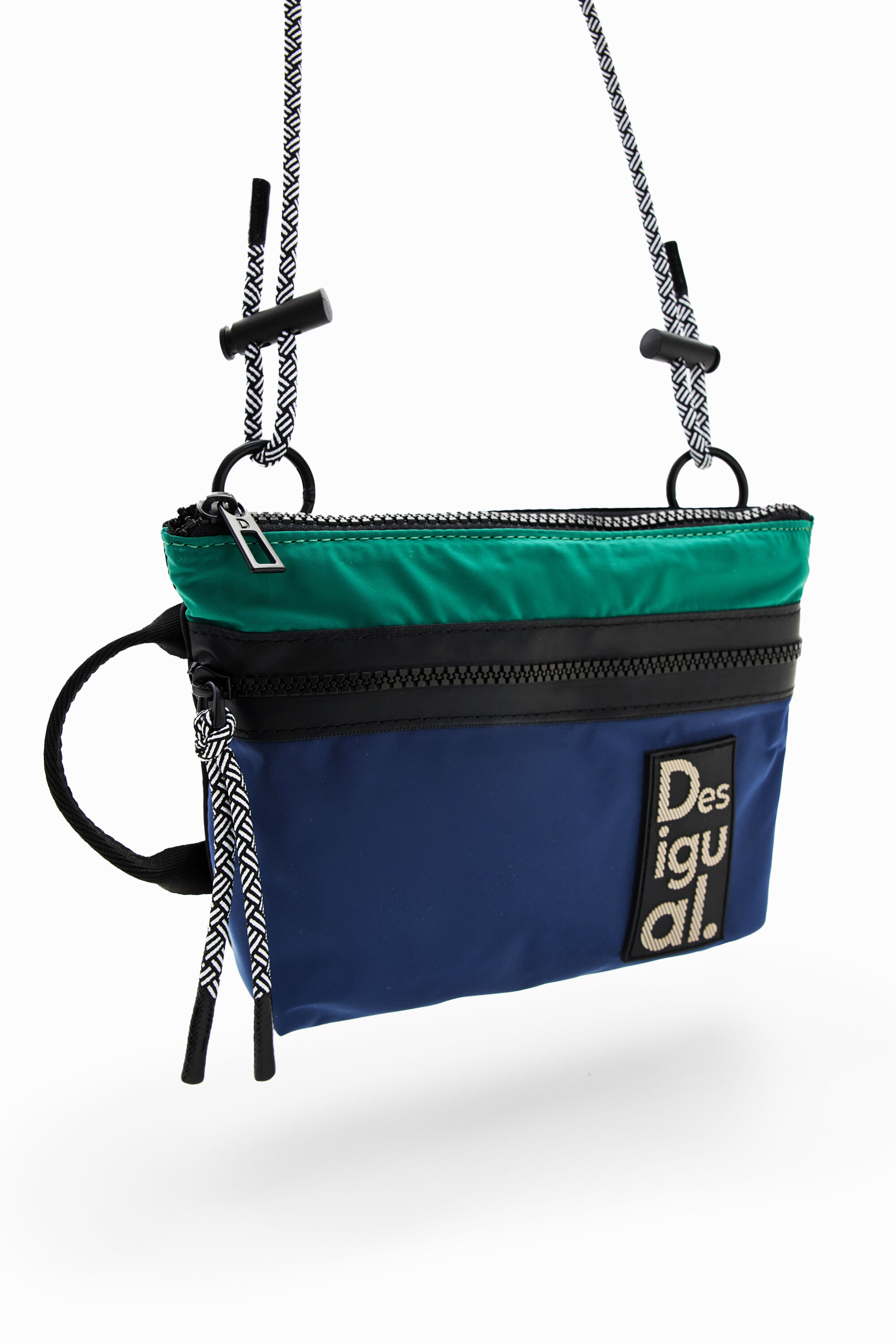 Includes a small removable bag and multiple pockets.Plain colour with details and contrasting trekking-style cordsMultiple inside and outside pocketsZip closureTwo compartmentsLong fixed strap with double adjusterDetachable mini bag with handle and cord for wearing across the bodyRecycled polyester32 x 8 x 24.2 cm