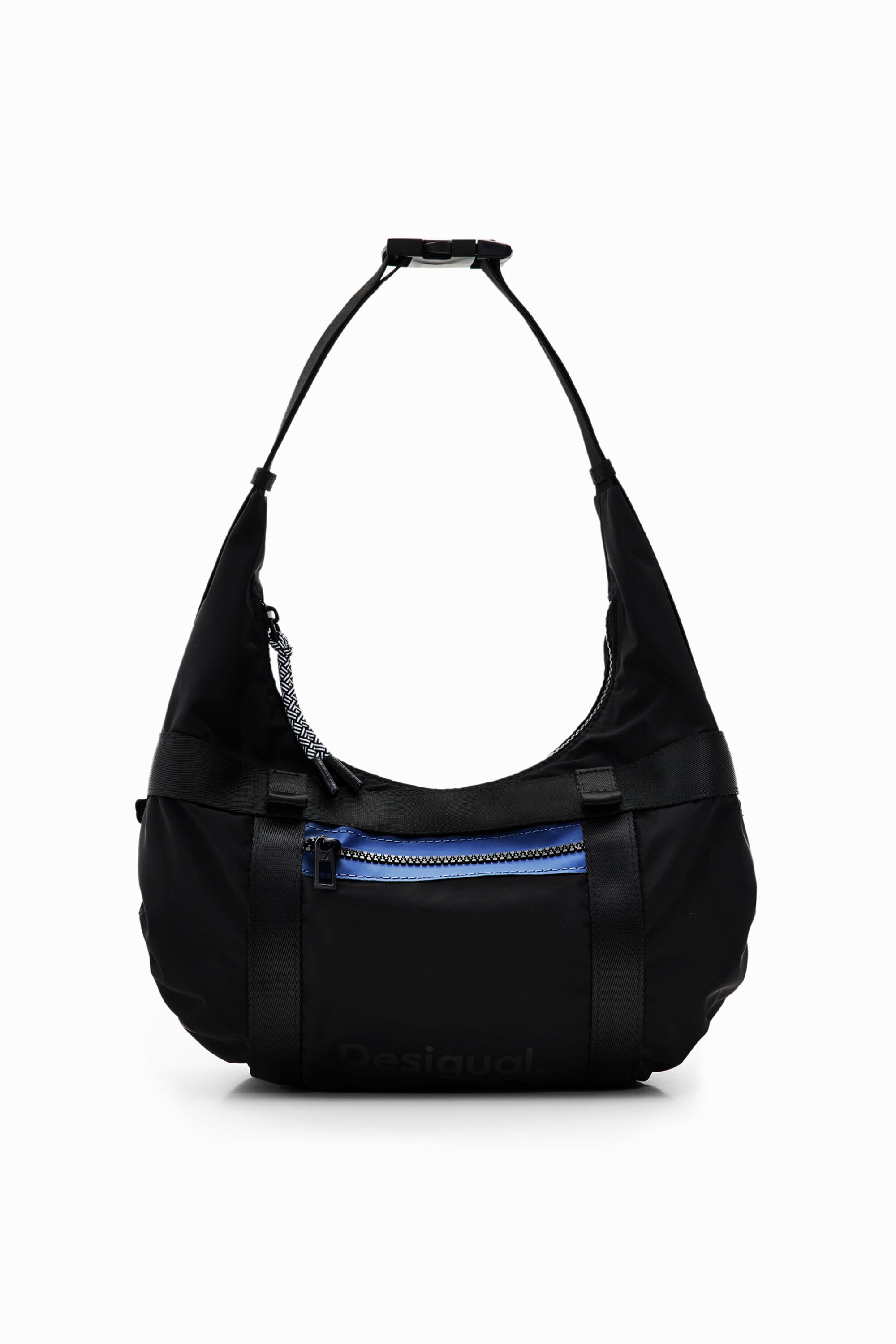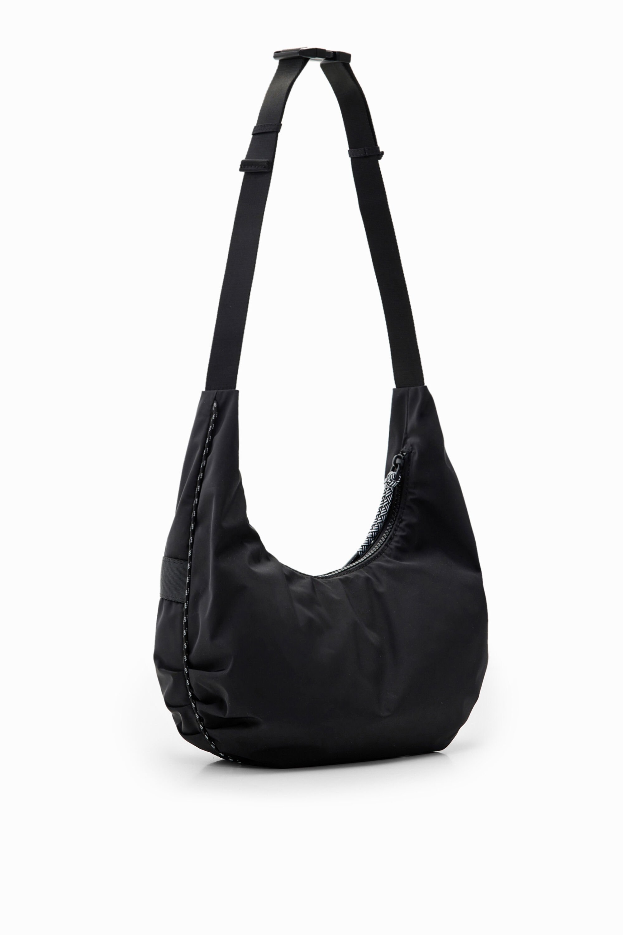 A multi-position nylon shoulder bag that can be worn as crossbody bag.