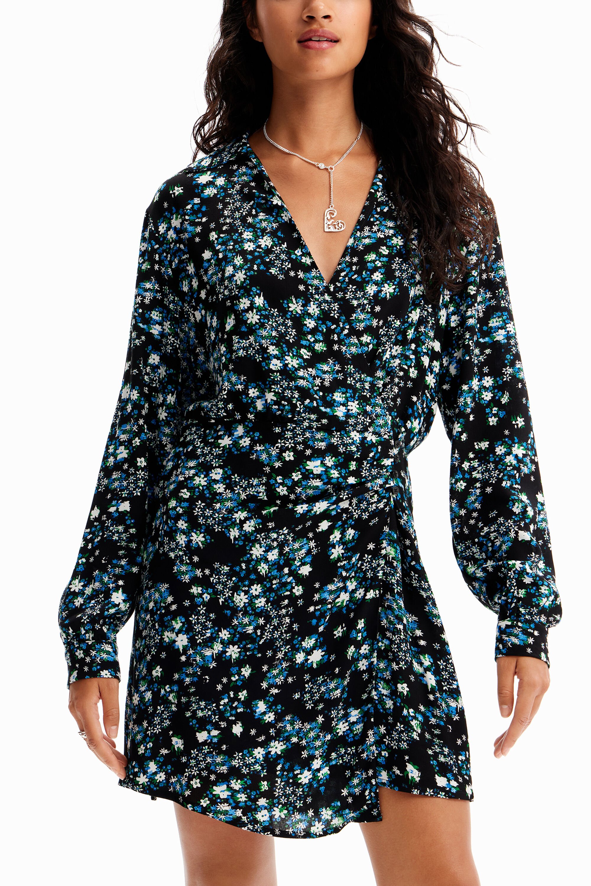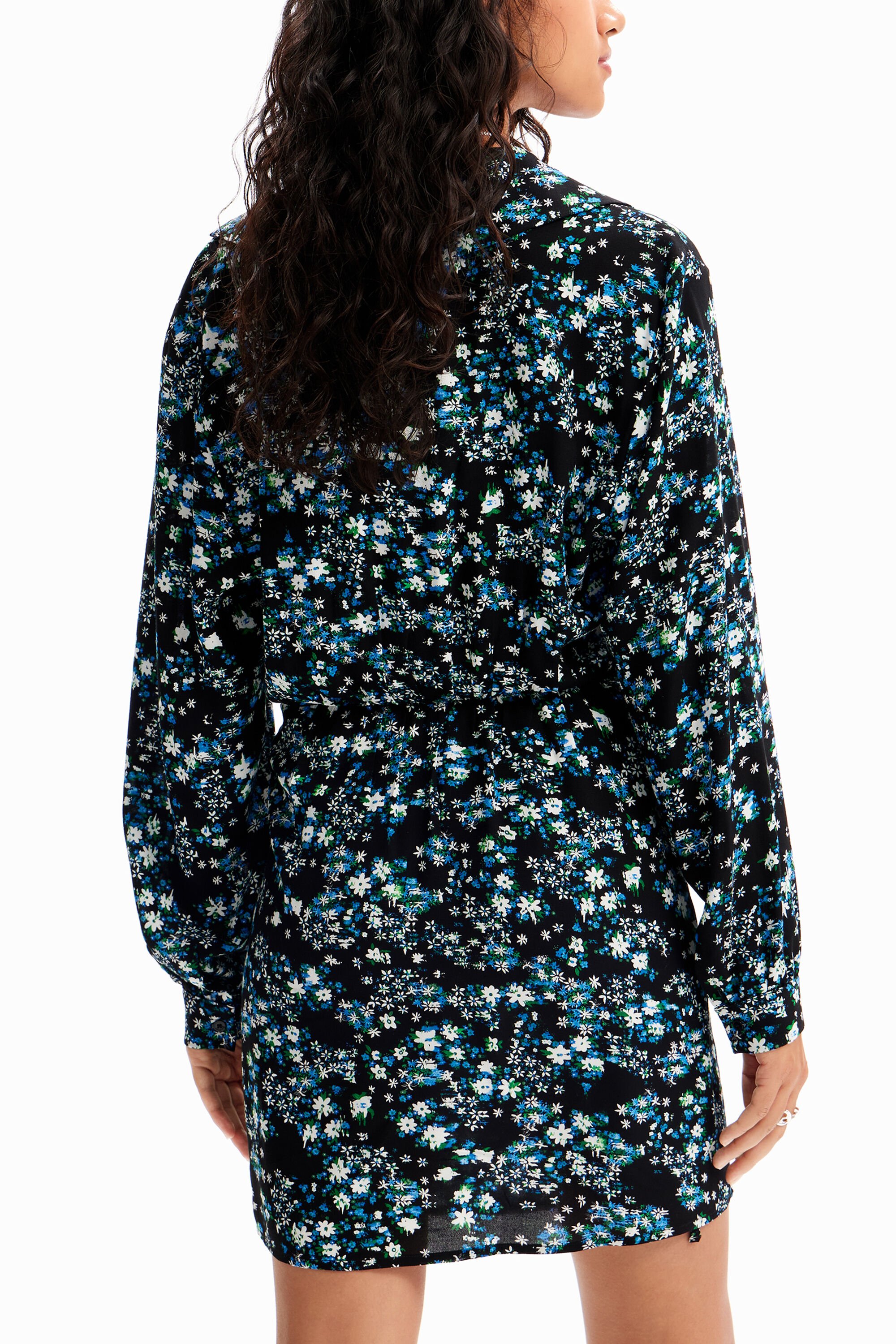 A short wrap dress with long sleeves and drop shoulders featuring a floral print.Fit: RegularLength: ShortSmall-flower printV-neck shirt collarLong sleeves with button cuffsButton and tie fasteningEvery garment is unique: the position of the print may varySustainable fibres: Lenzing™ Ecovero™
