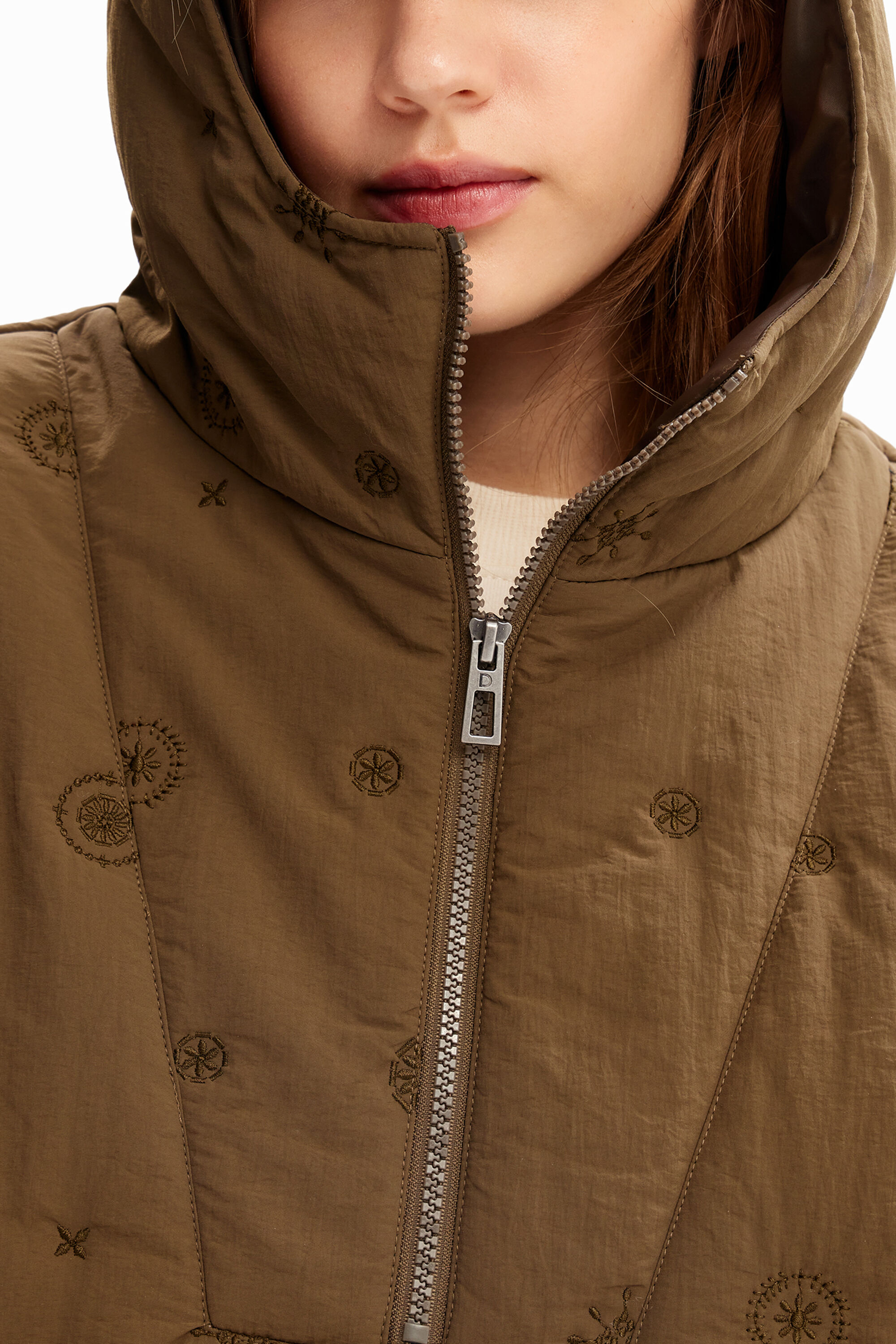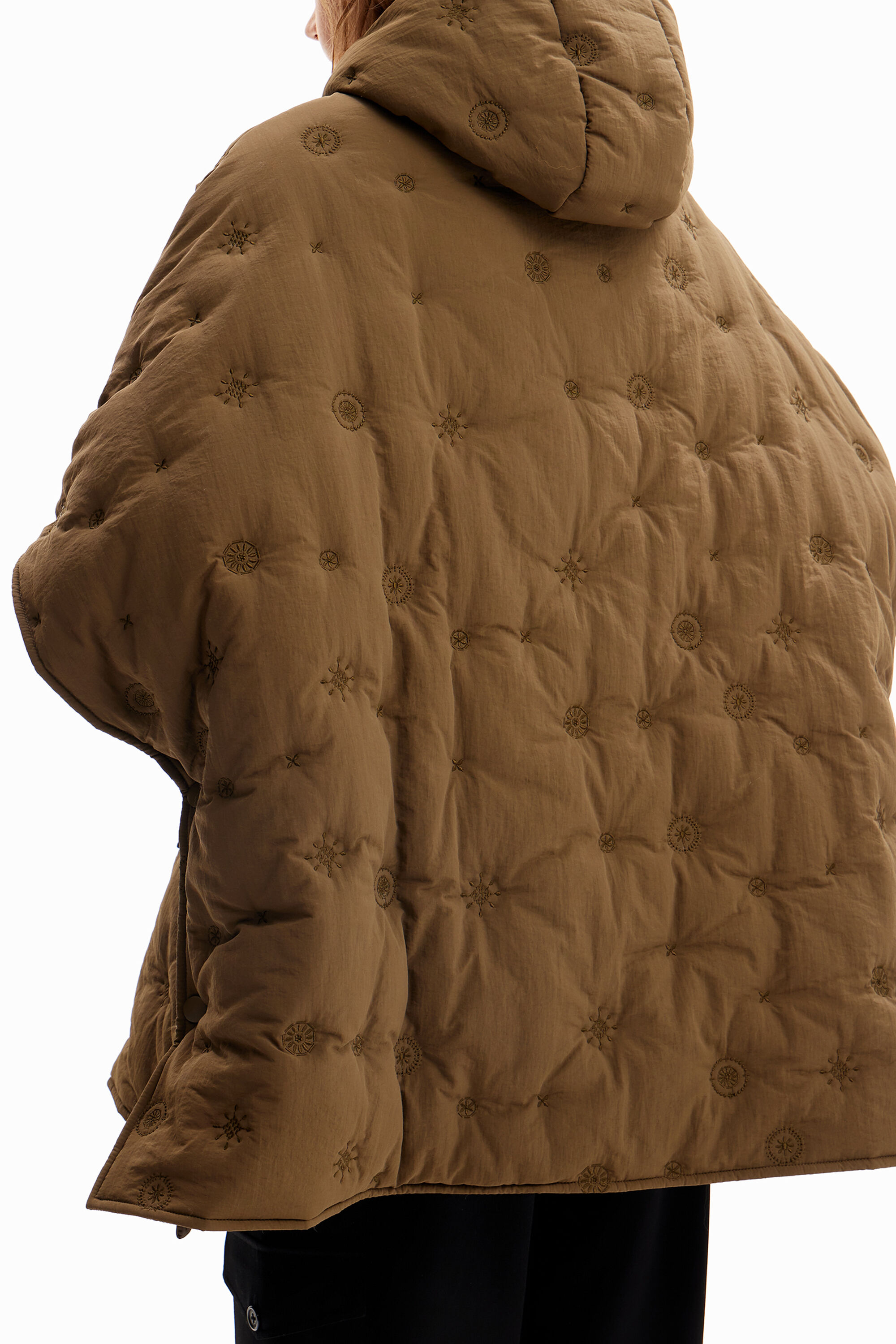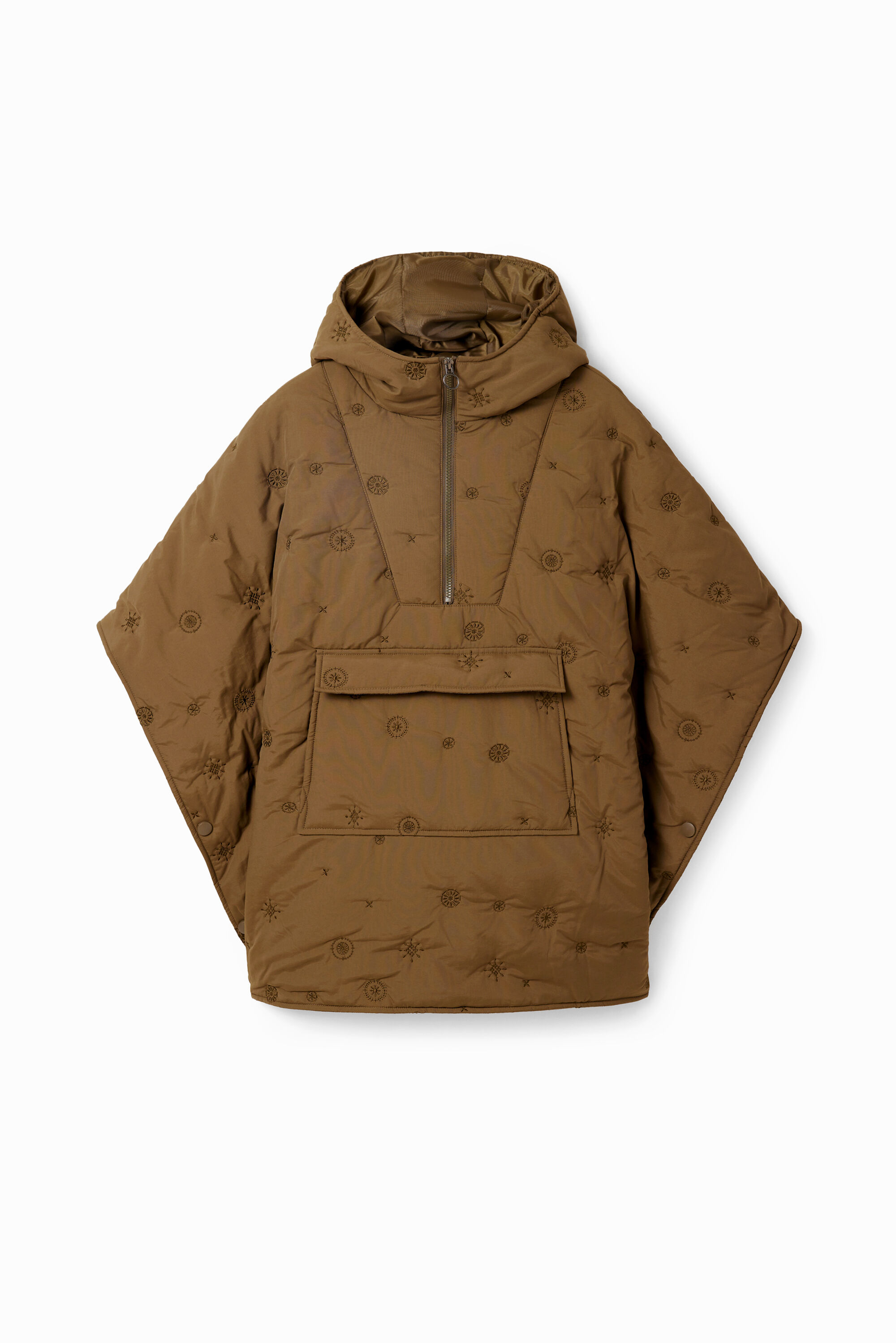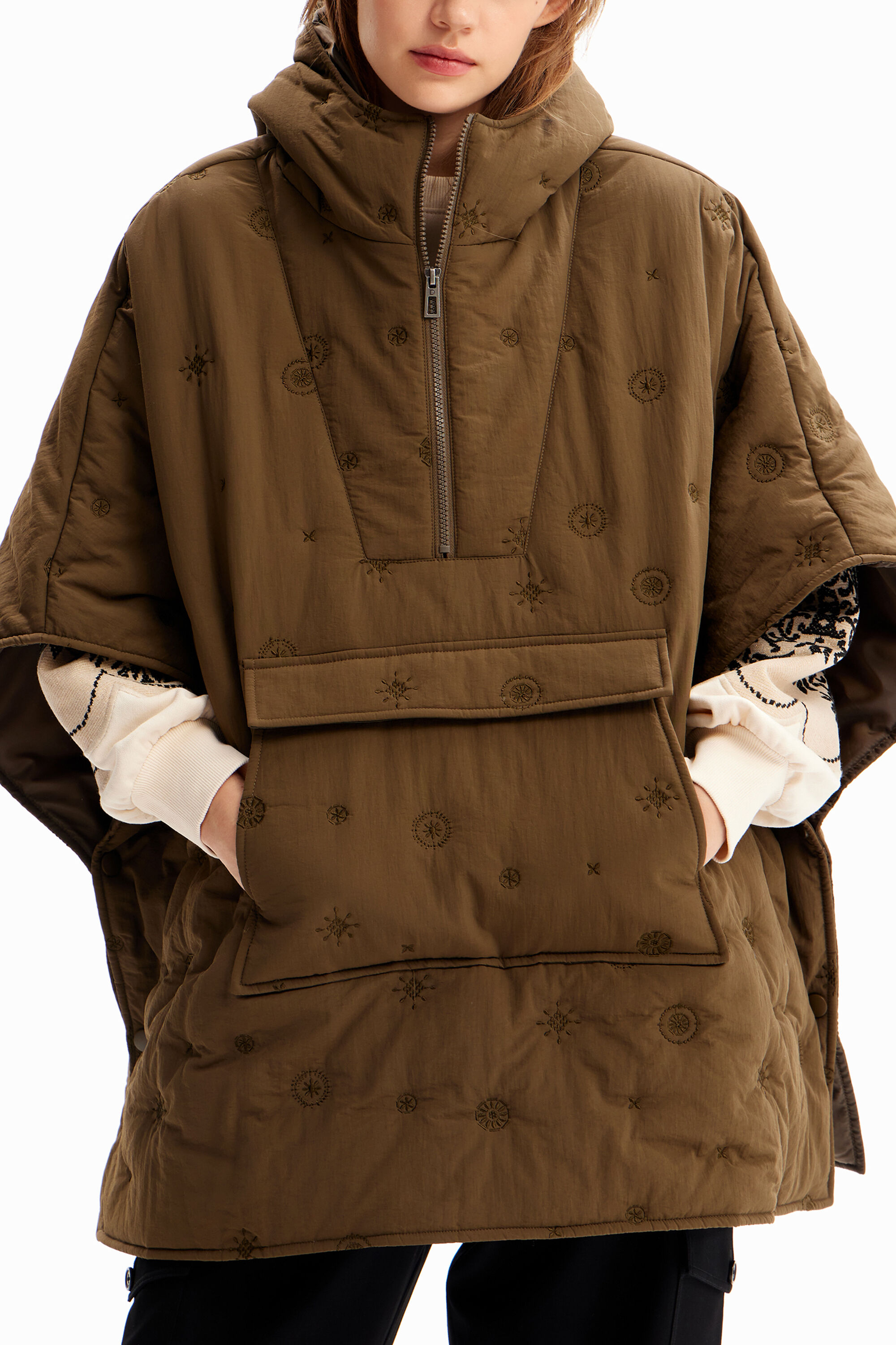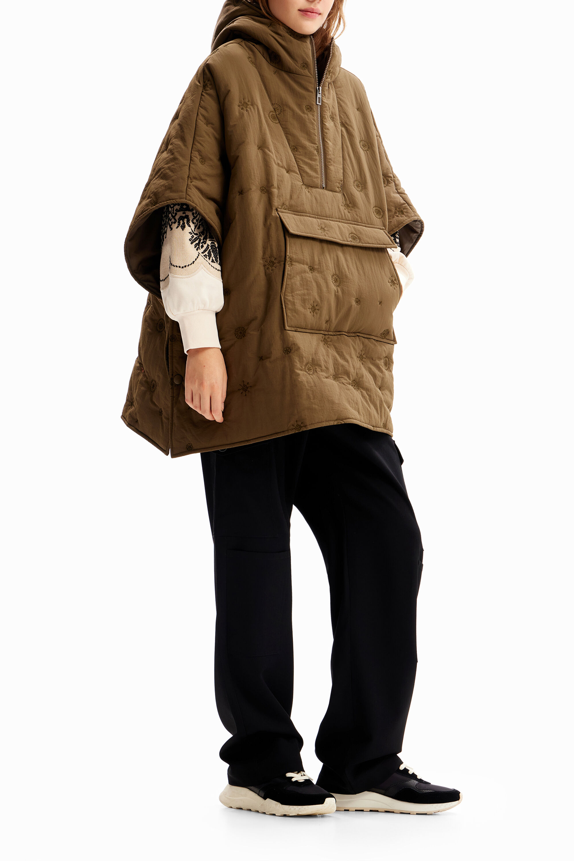 A lightweight oversize quilted poncho with a hood, maxi pocket and tone-on-tone geometric embroidery.Fit: OversizeLength: To the hipPlain colourHigh neckLined hood3/4 bat sleevesKangaroo pocket with decorative flapZip closure on the neck and buttons on the sidesWaterproof fabricInner liningRecycled polyester