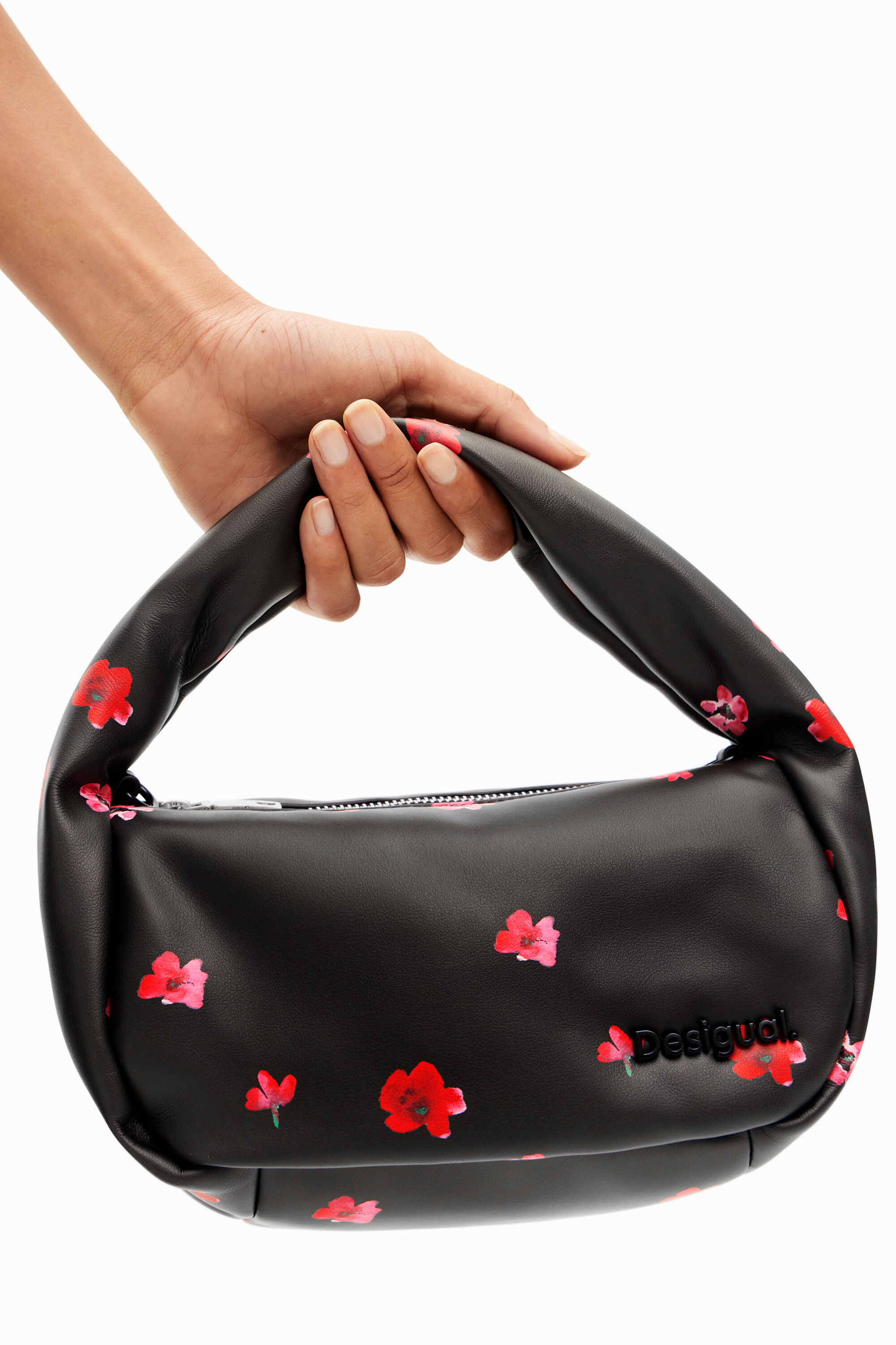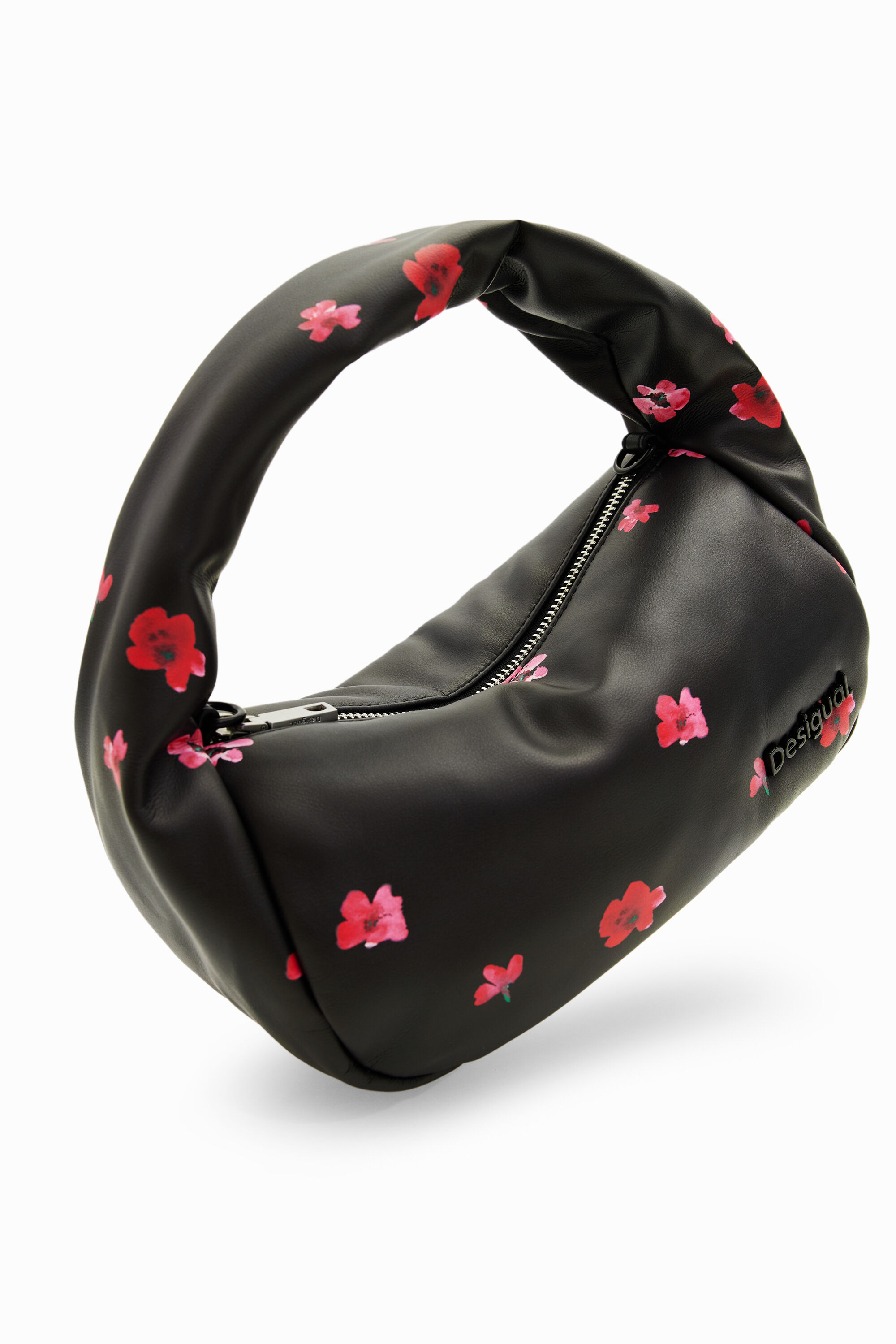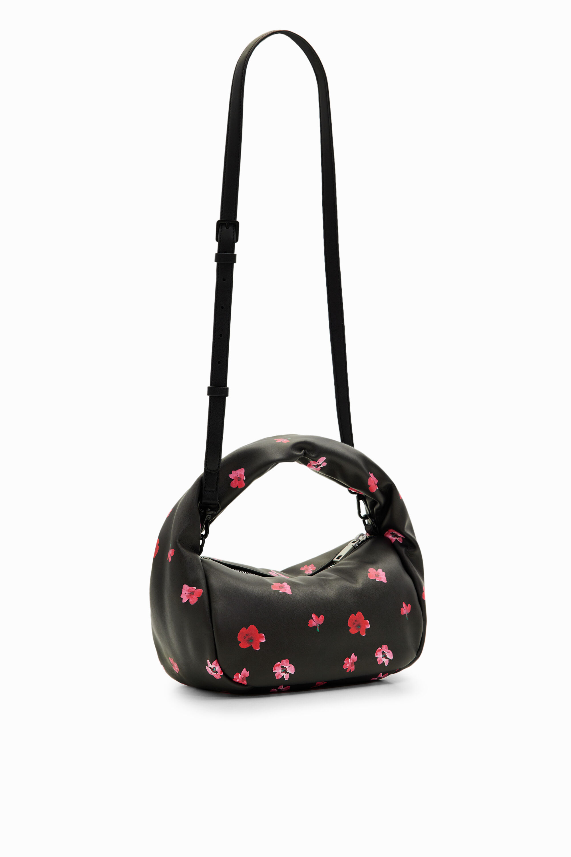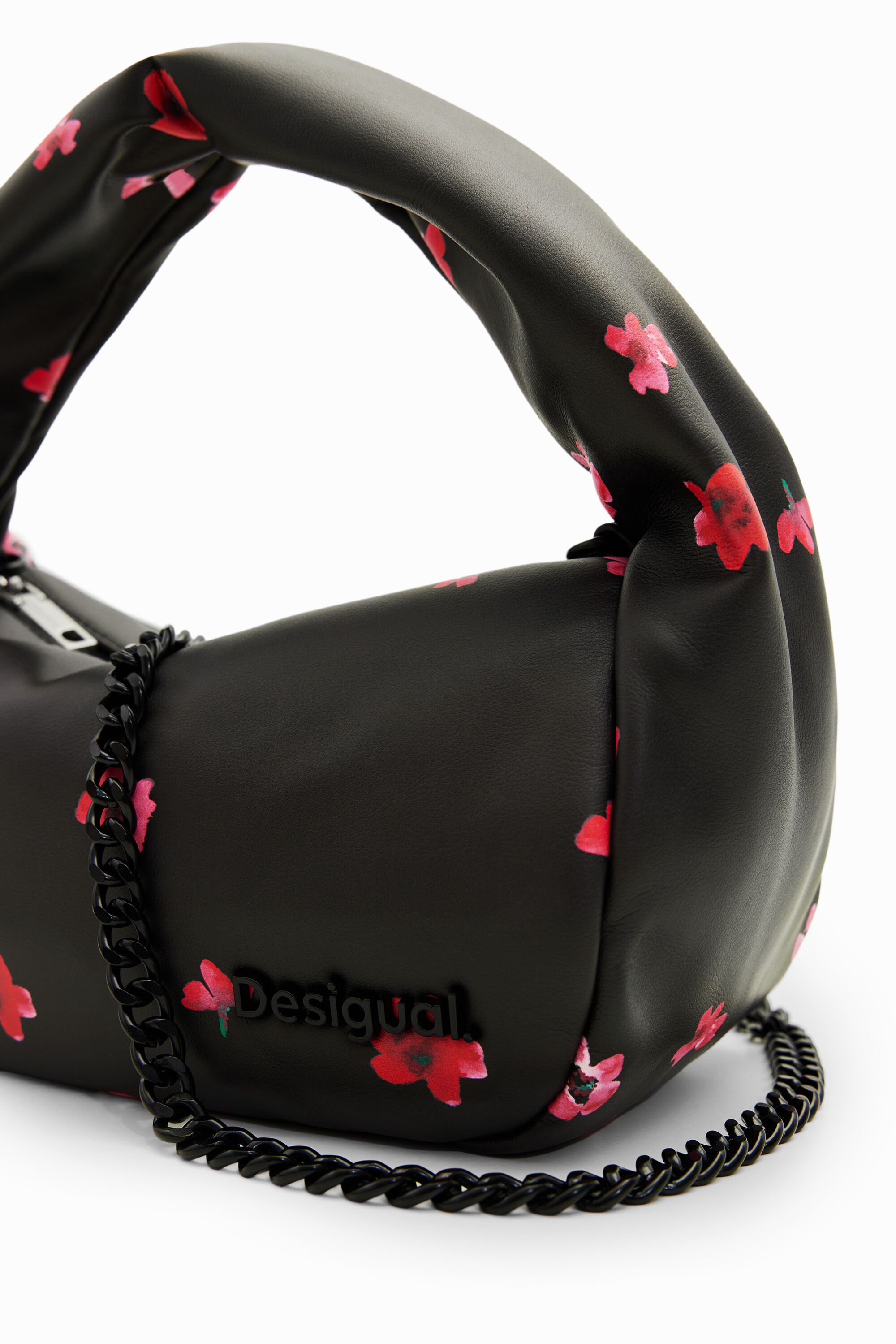 A small padded handbag in leather-effect fabric with a floral print and several straps.Watercolour-effect print of small flowersInside pocketZip closureOne compartmentThree straps: a short fixed handle, a chain shoulder strap and a long adjustable crossbody strap, both detachableVery lightSoft padded leather-effect fabric Soft24 x 12 x 14.8 cm