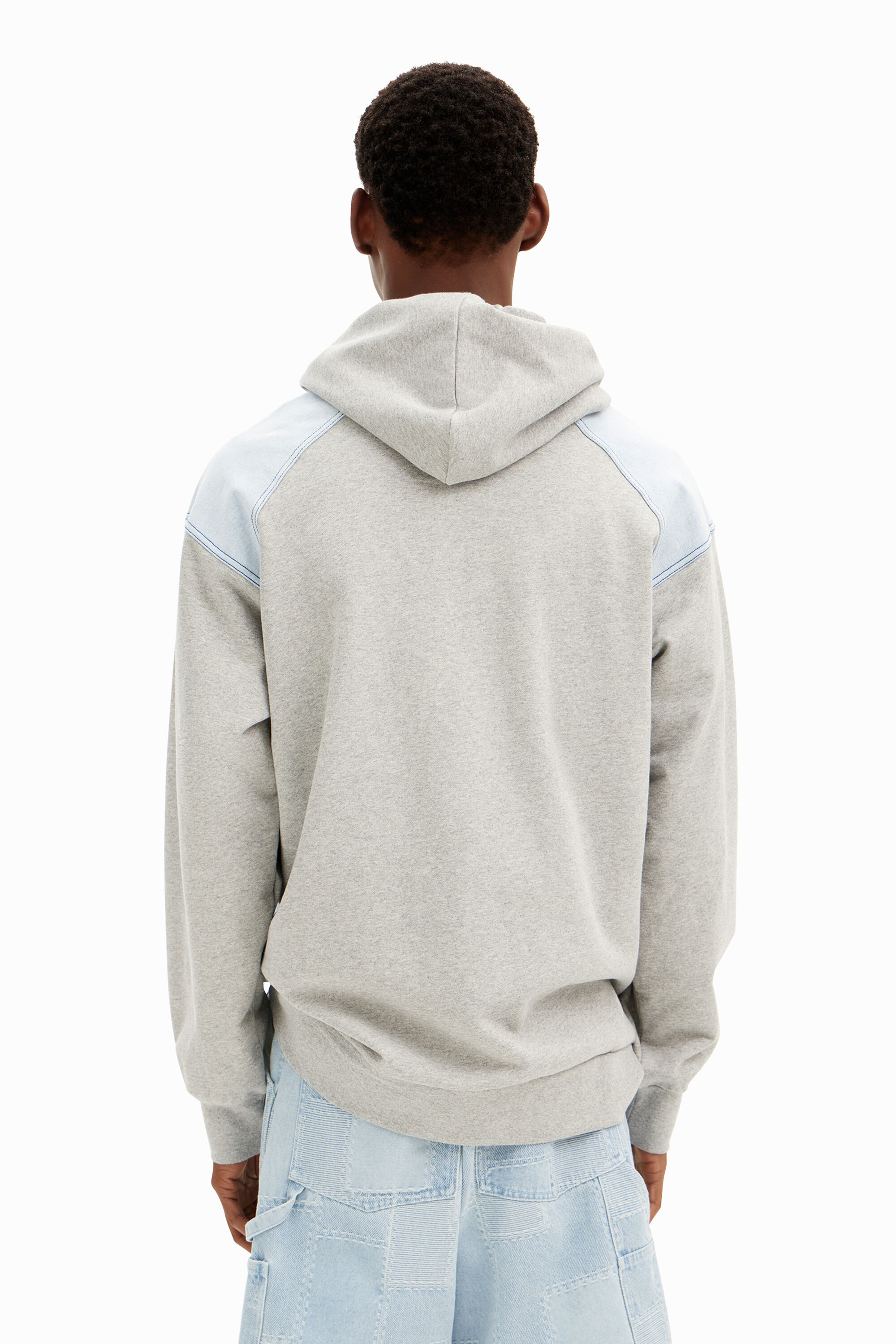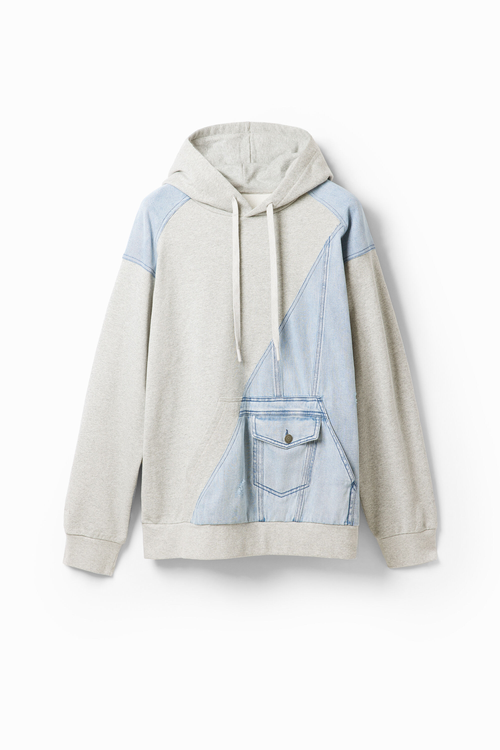 RegularPlain colour mixed with denim cut-outsDrawstring hoodLong sleevesPouch pocketStretch cuffs and hem