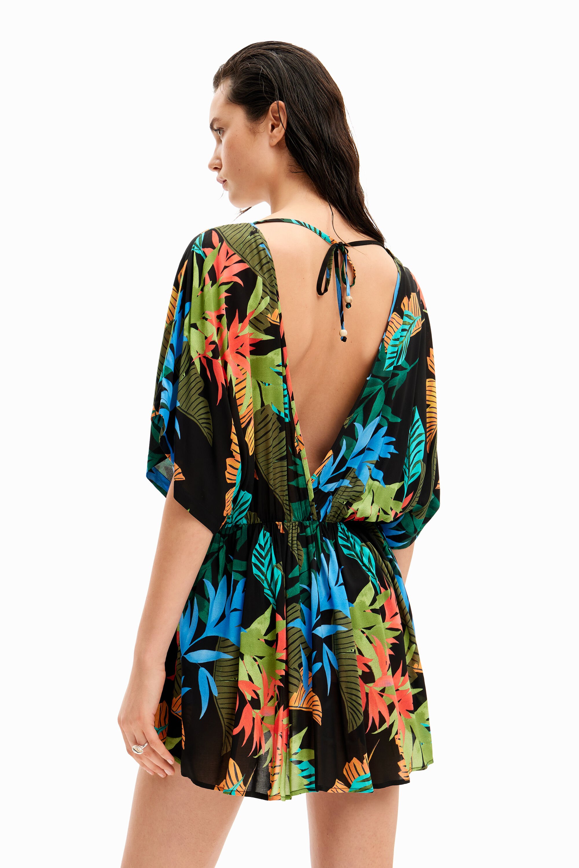 MiniWatercolour-effect tropical leaf printV-neckShort sleevesElasticated waist at the backAdjustable tie fasteningPlunging wrap backLightweight 100% viscose fabricLenzing™ Ecovero™