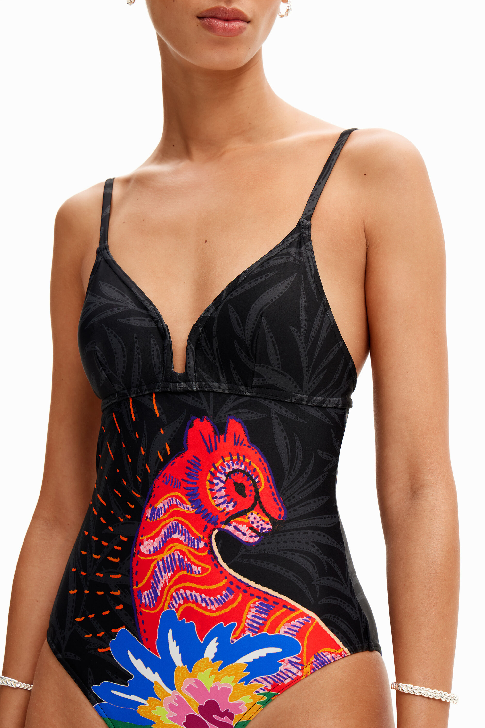 A triangle-style strappy swimsuit with a rigid piece in the neckline, removable cups, high legs and a cat print.Fit: SlimMulticolour tropical print in hand-painted effectV-neckDetachable straps on the back to tie at the neckRear clasp fastenerRemovable cupsLinedRecycled polyester