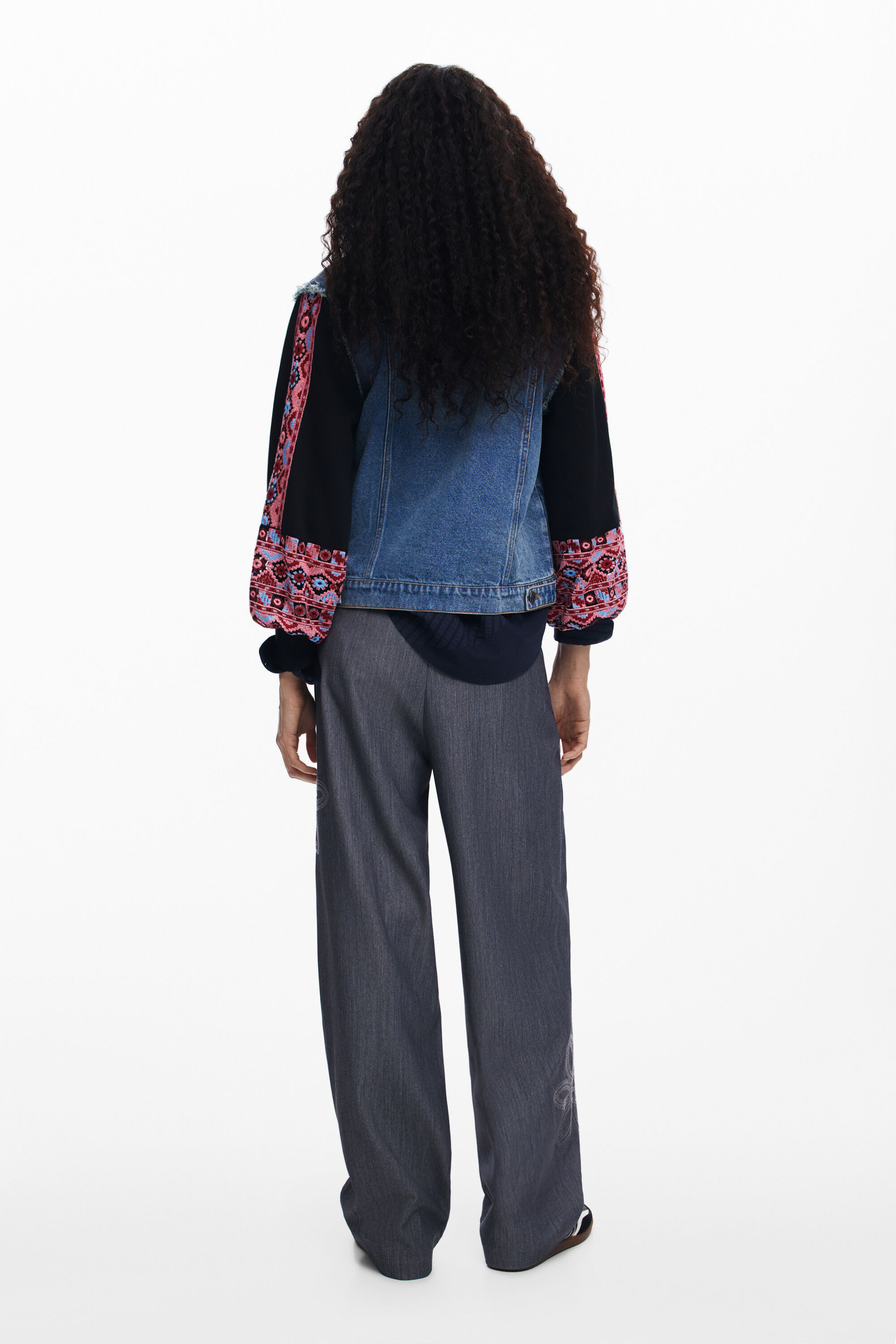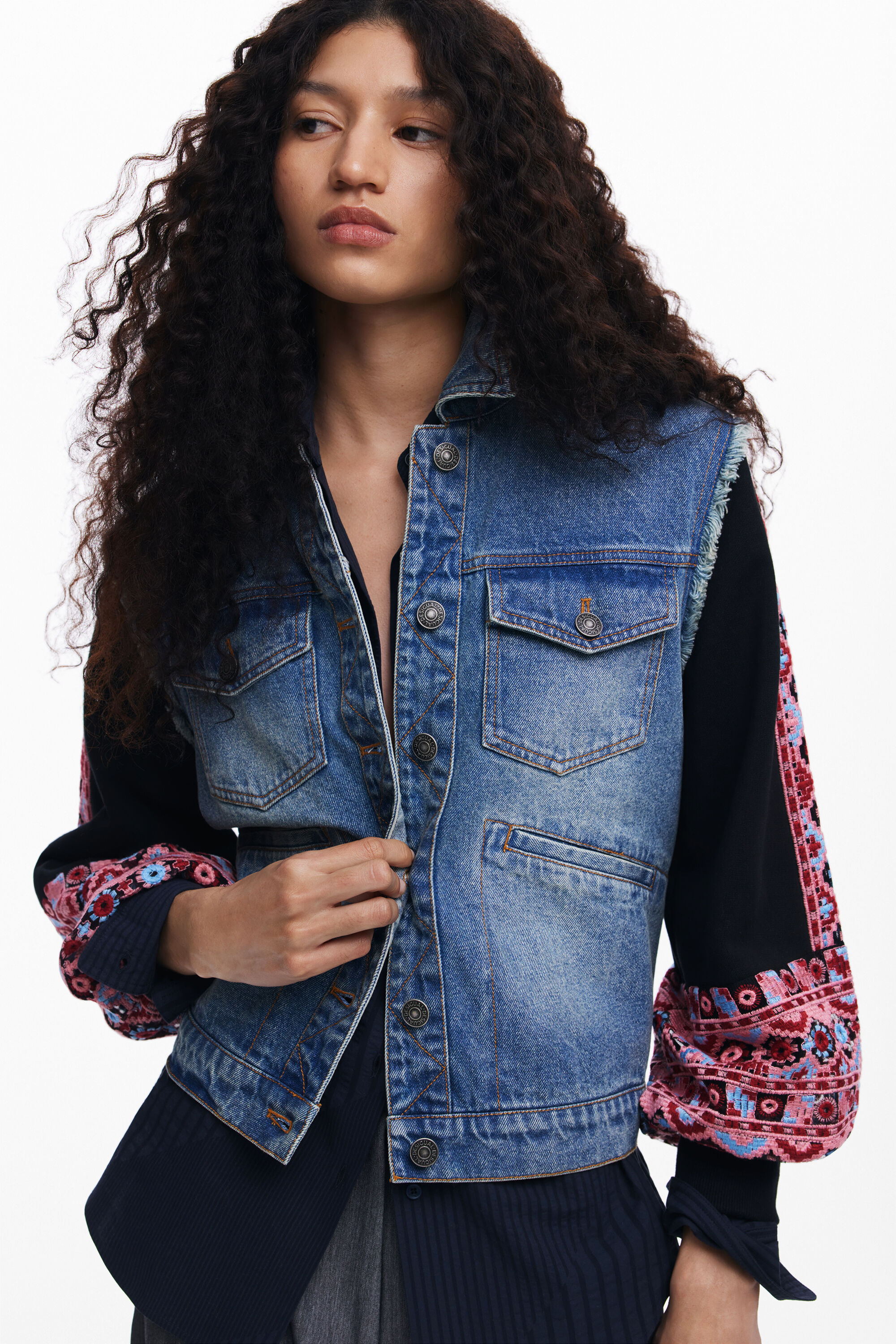 Two-piece trucker jacket, with denim body and jersey sleeves with mandala patterns.