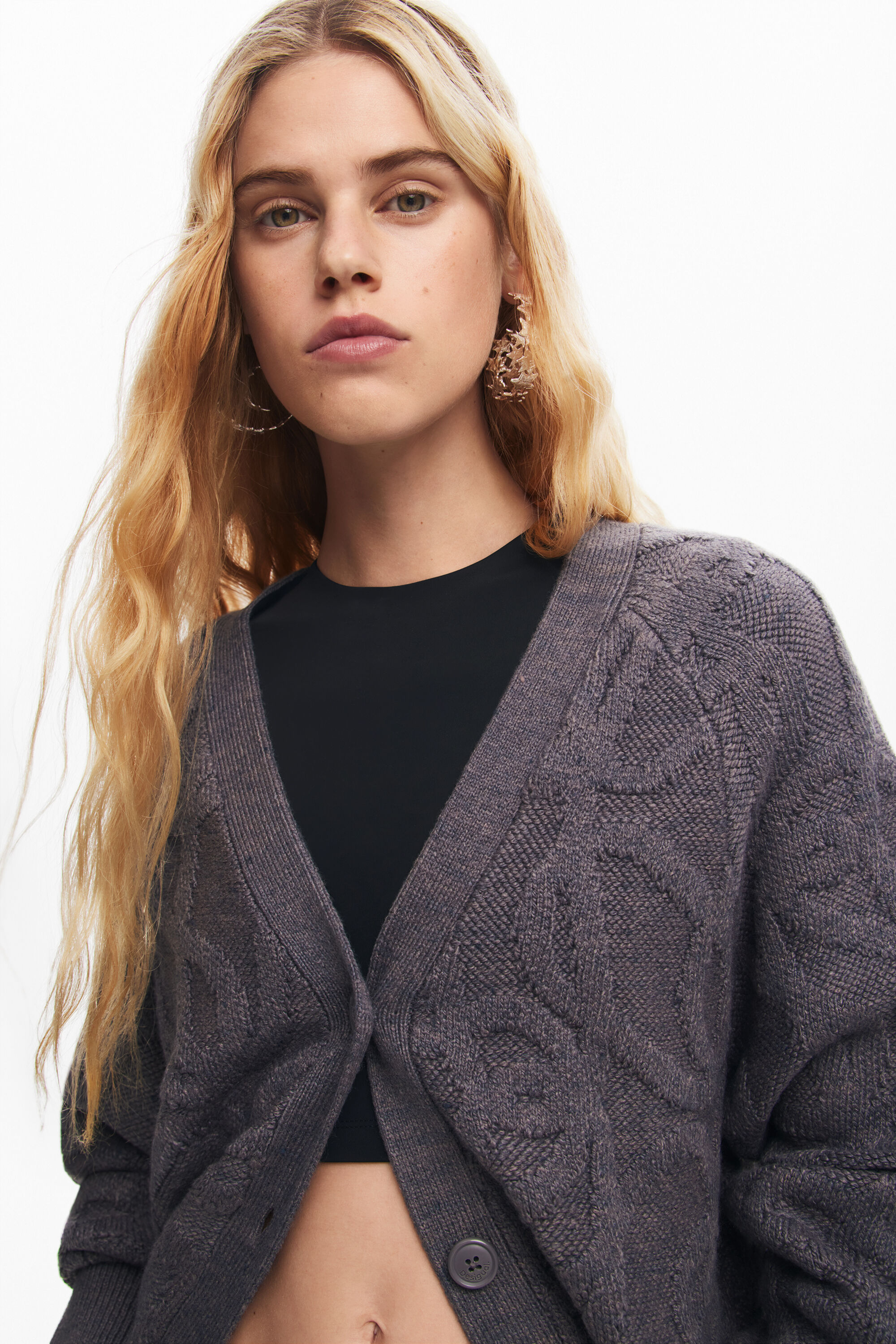 Oversized cable-knit cardigan with V-neck and button closureFit: