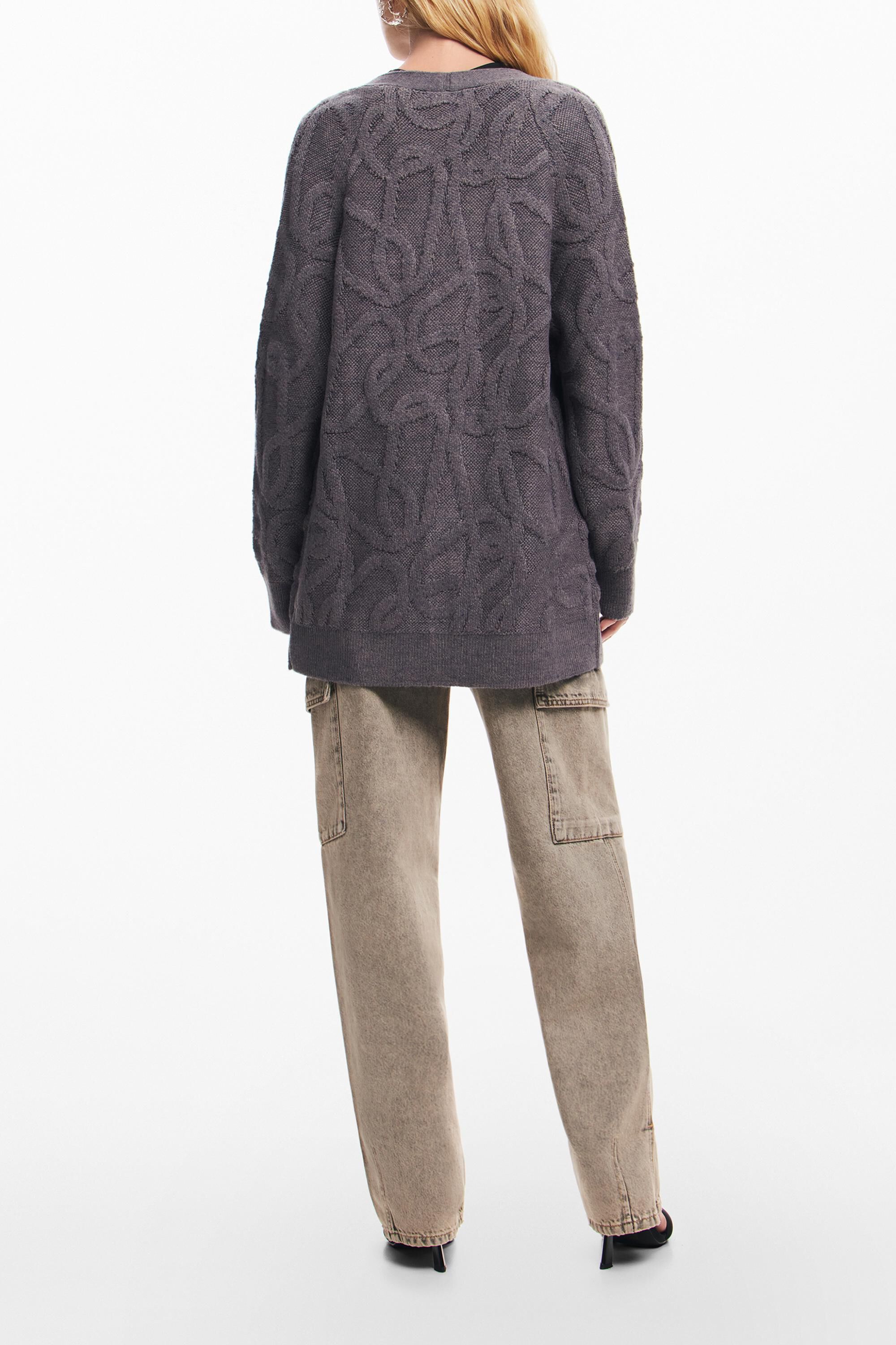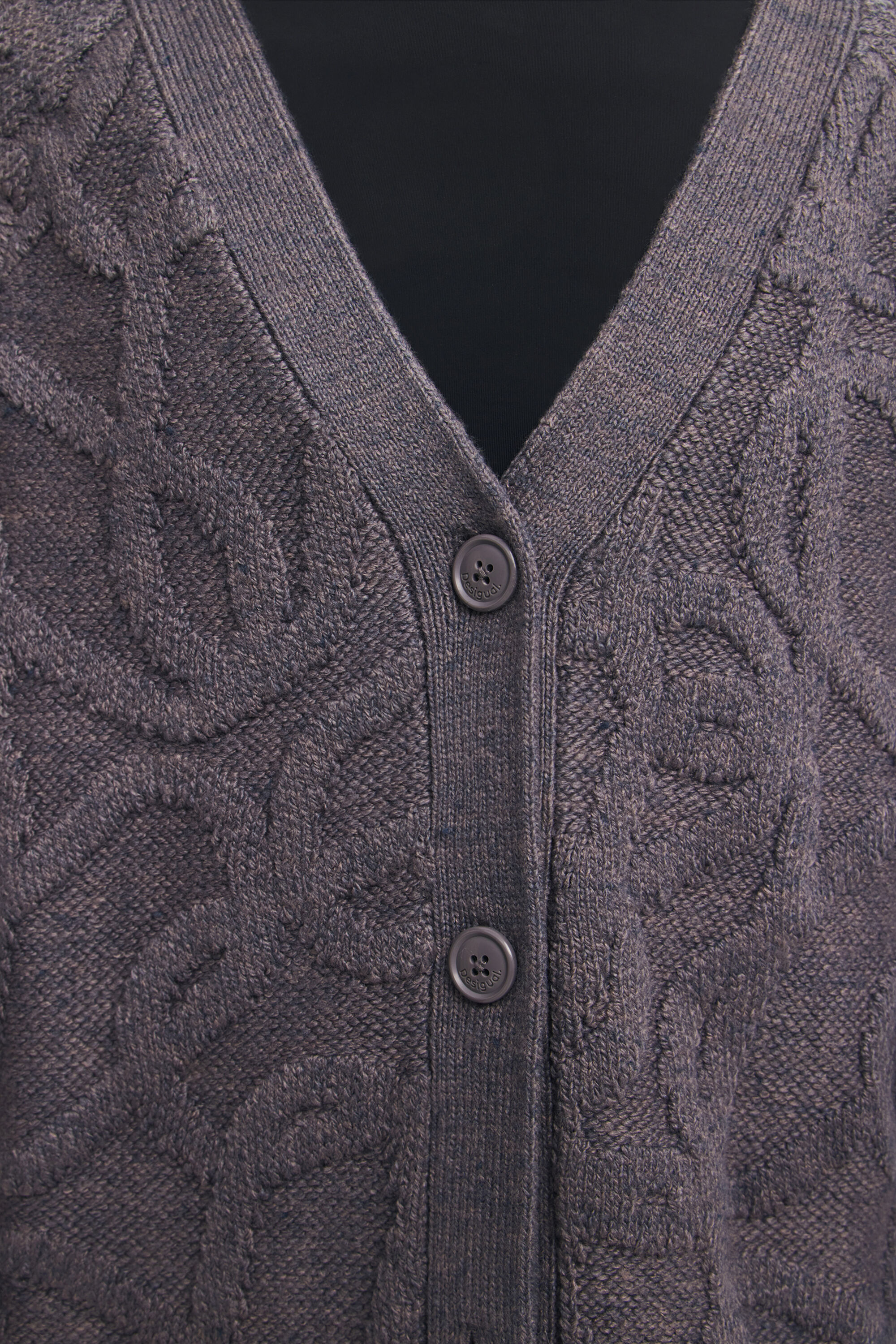 LooseEmbroidered reliefsV-neckLong sleeveButton closureRecycled acrylic