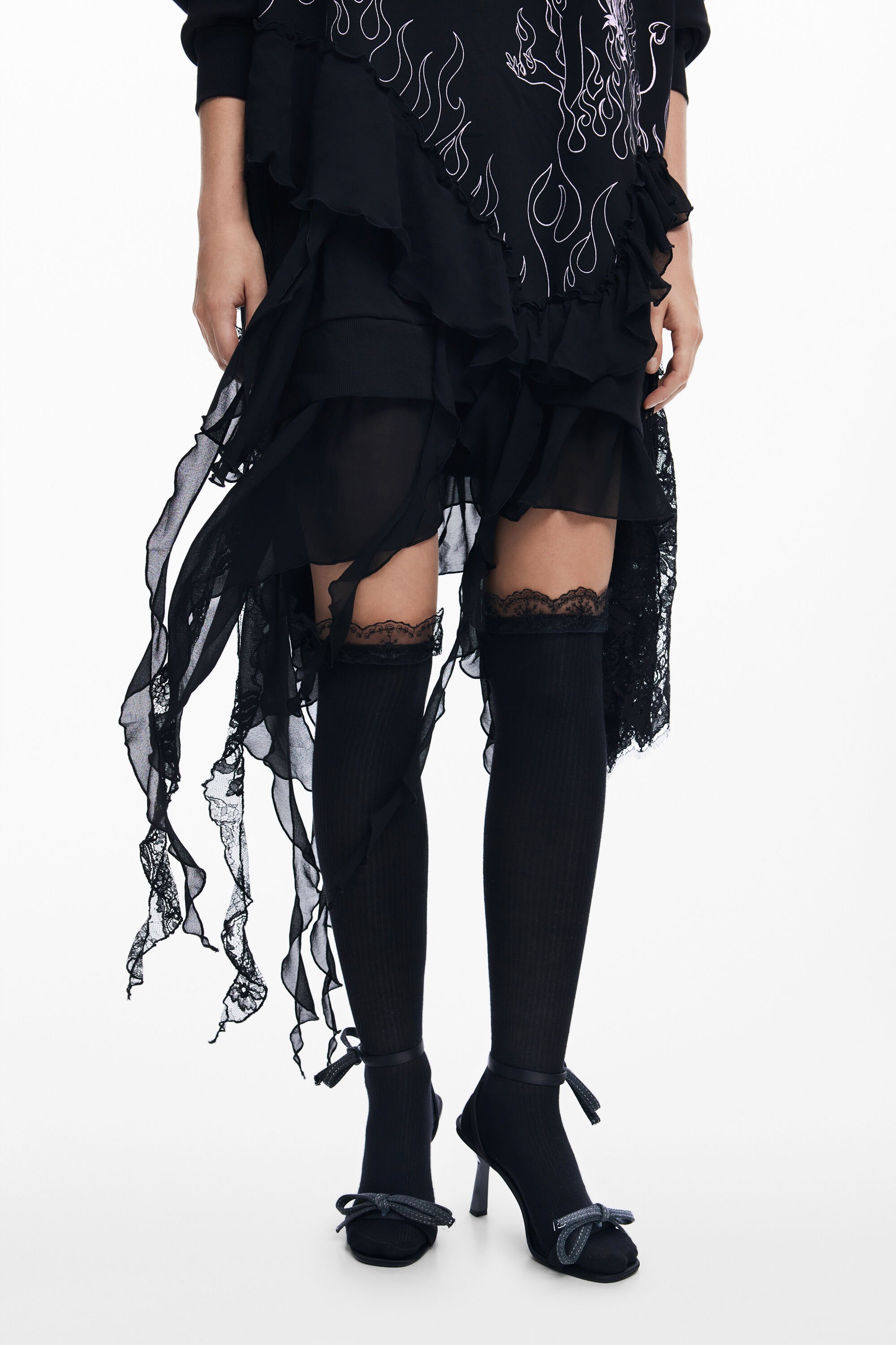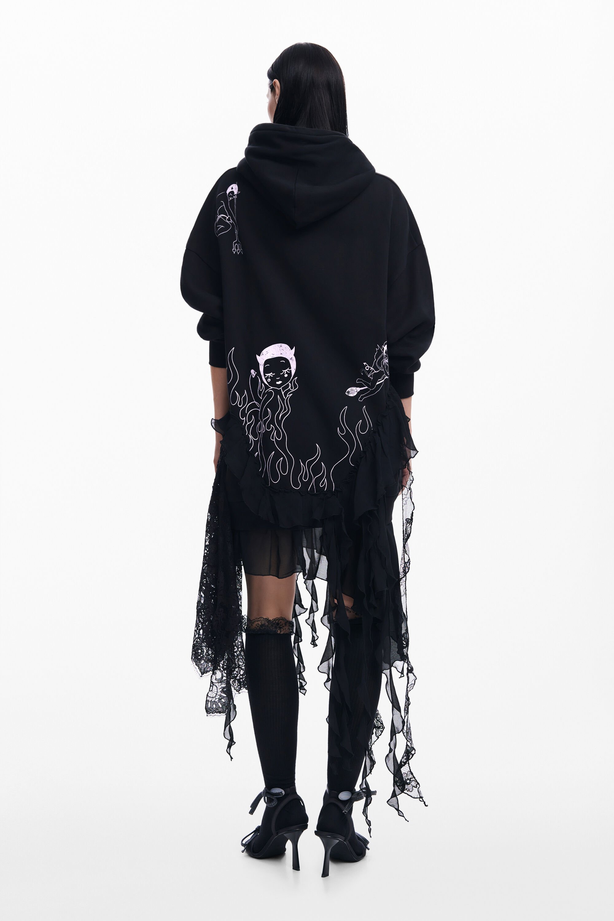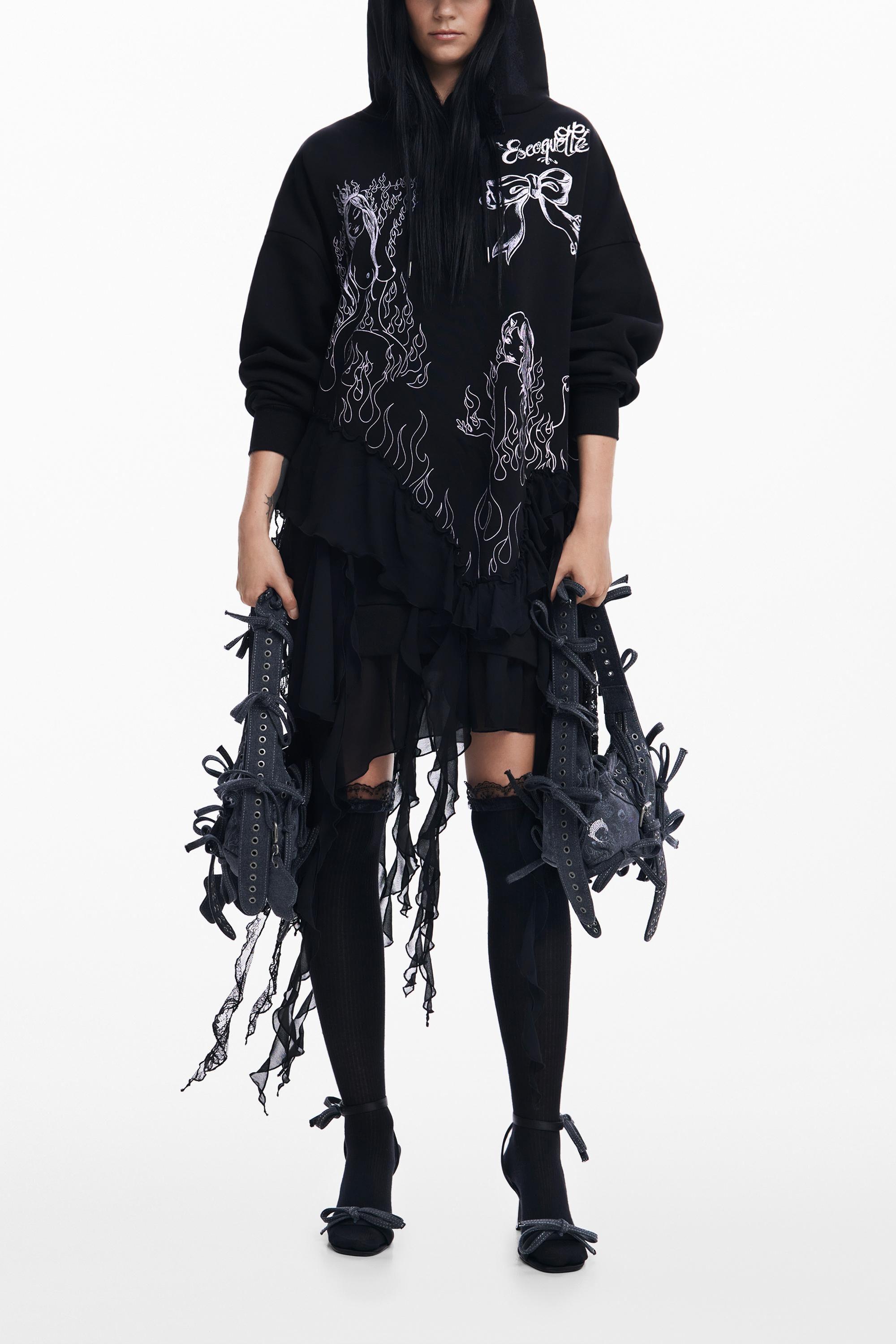 Short sweatshirt-style dress with an asymmetric hem and lace appliqués designed by María Escoté.