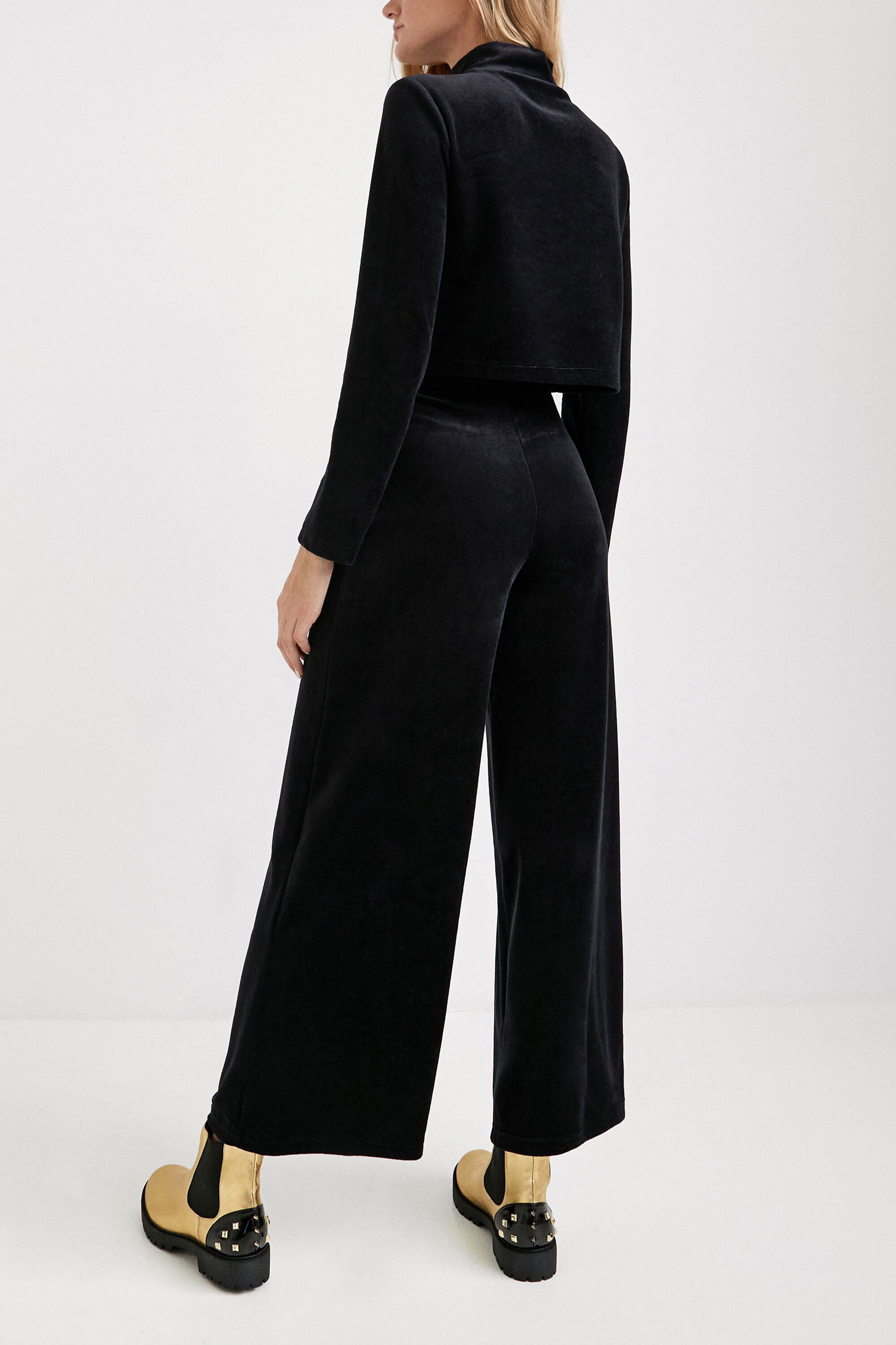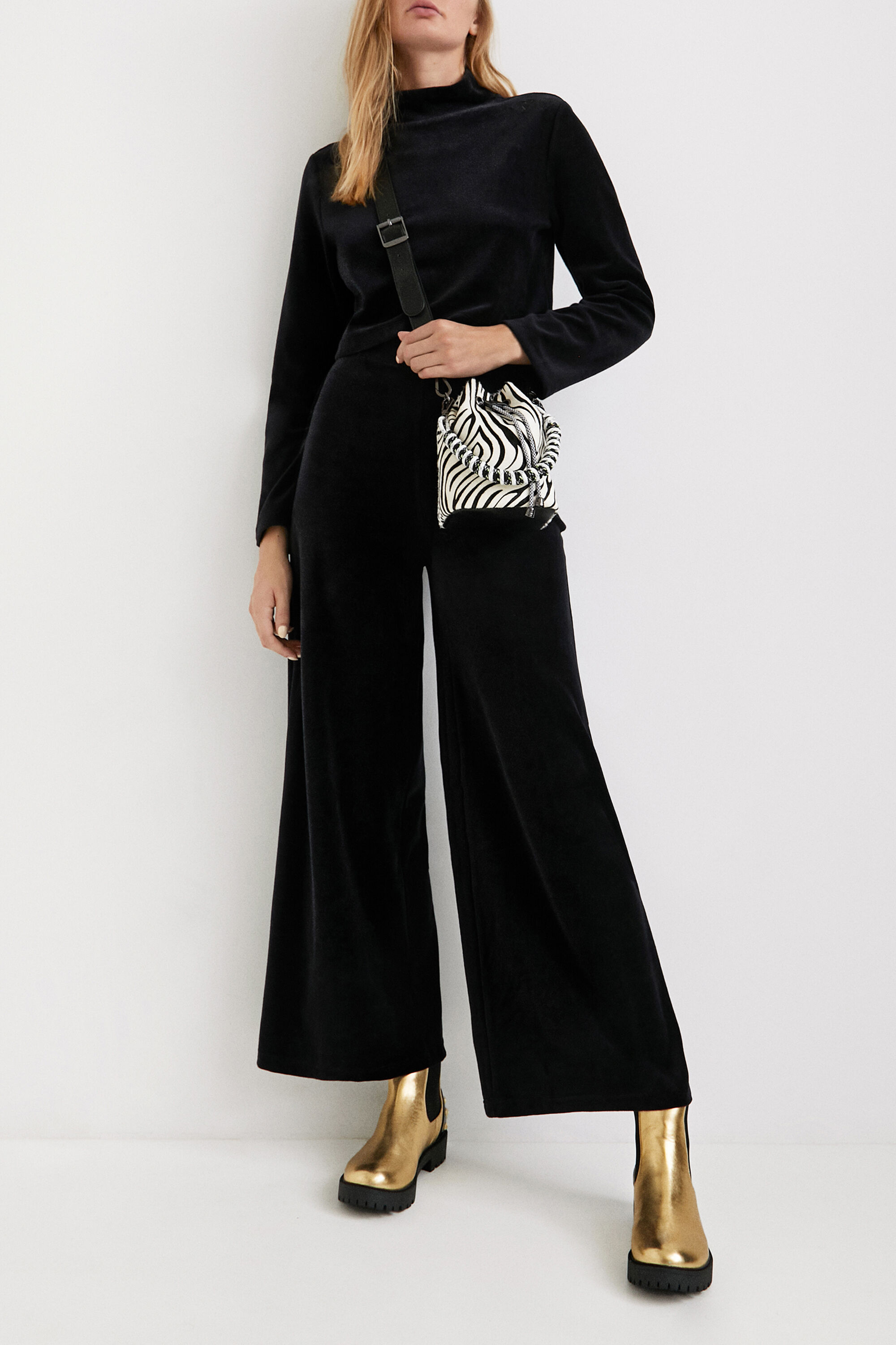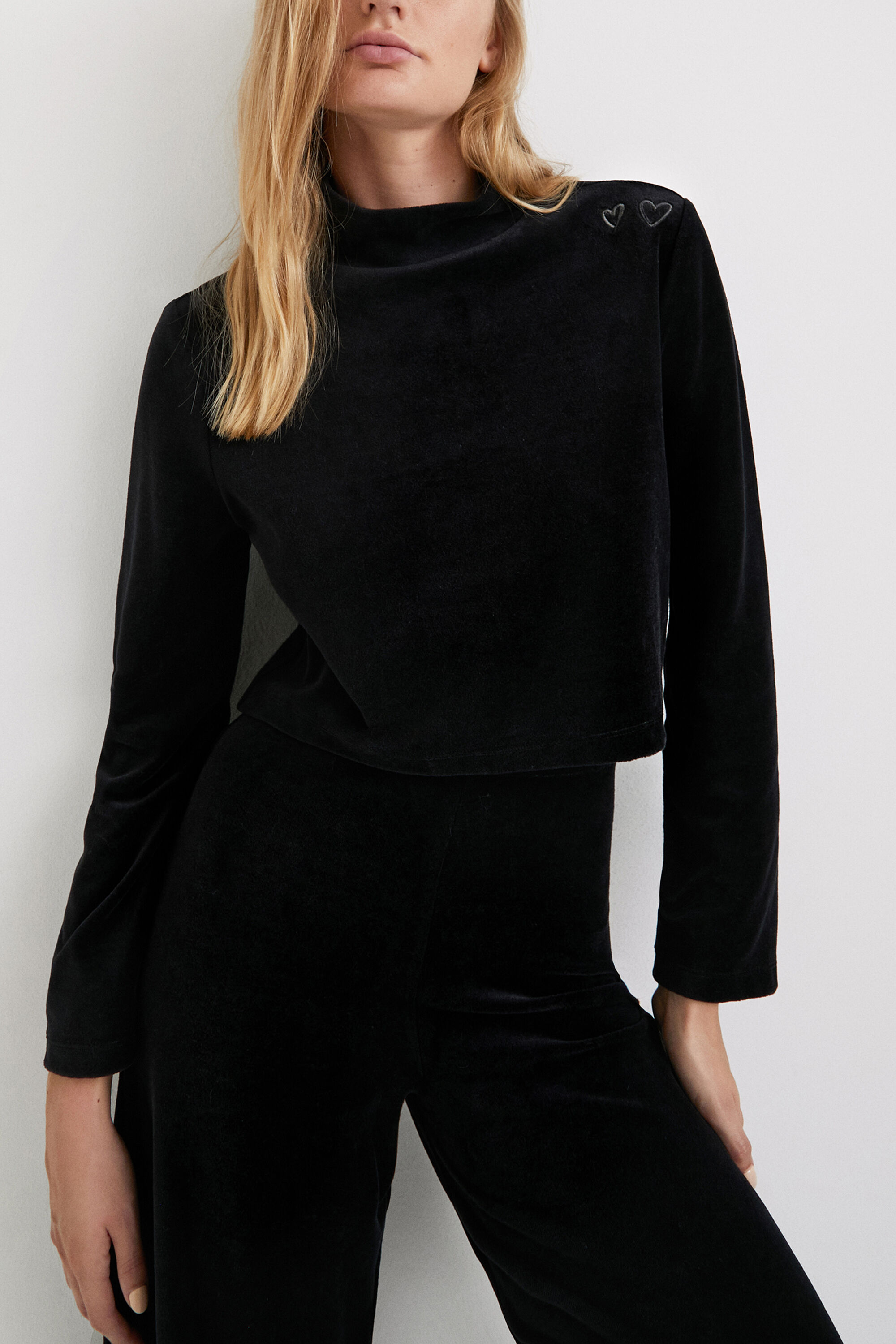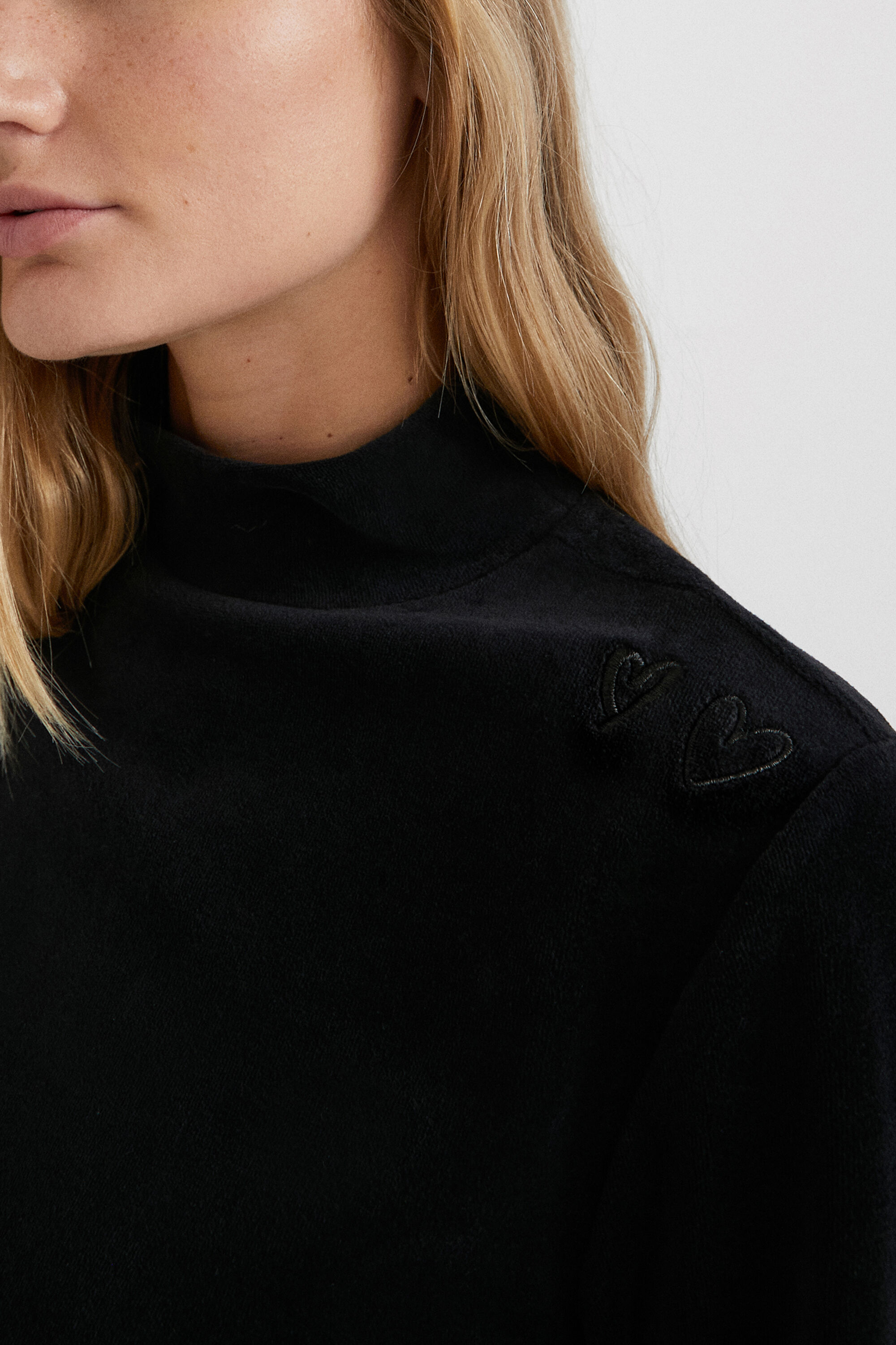 The comfortable silhouette of this plush sweatshirt is stylized by the contrast of the high neck and the wide waist.