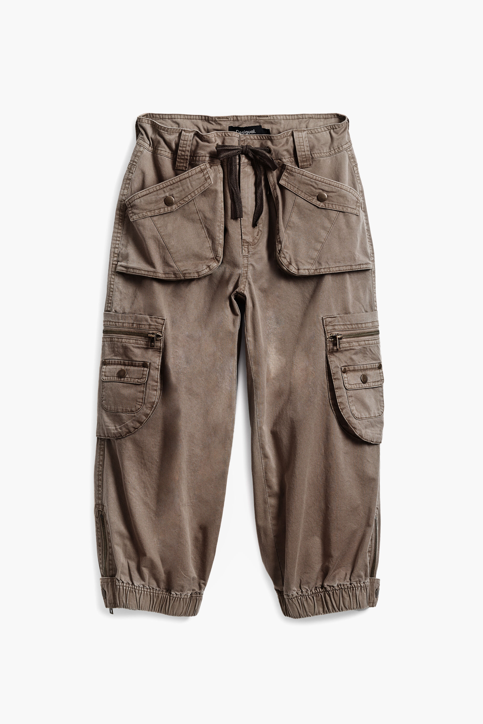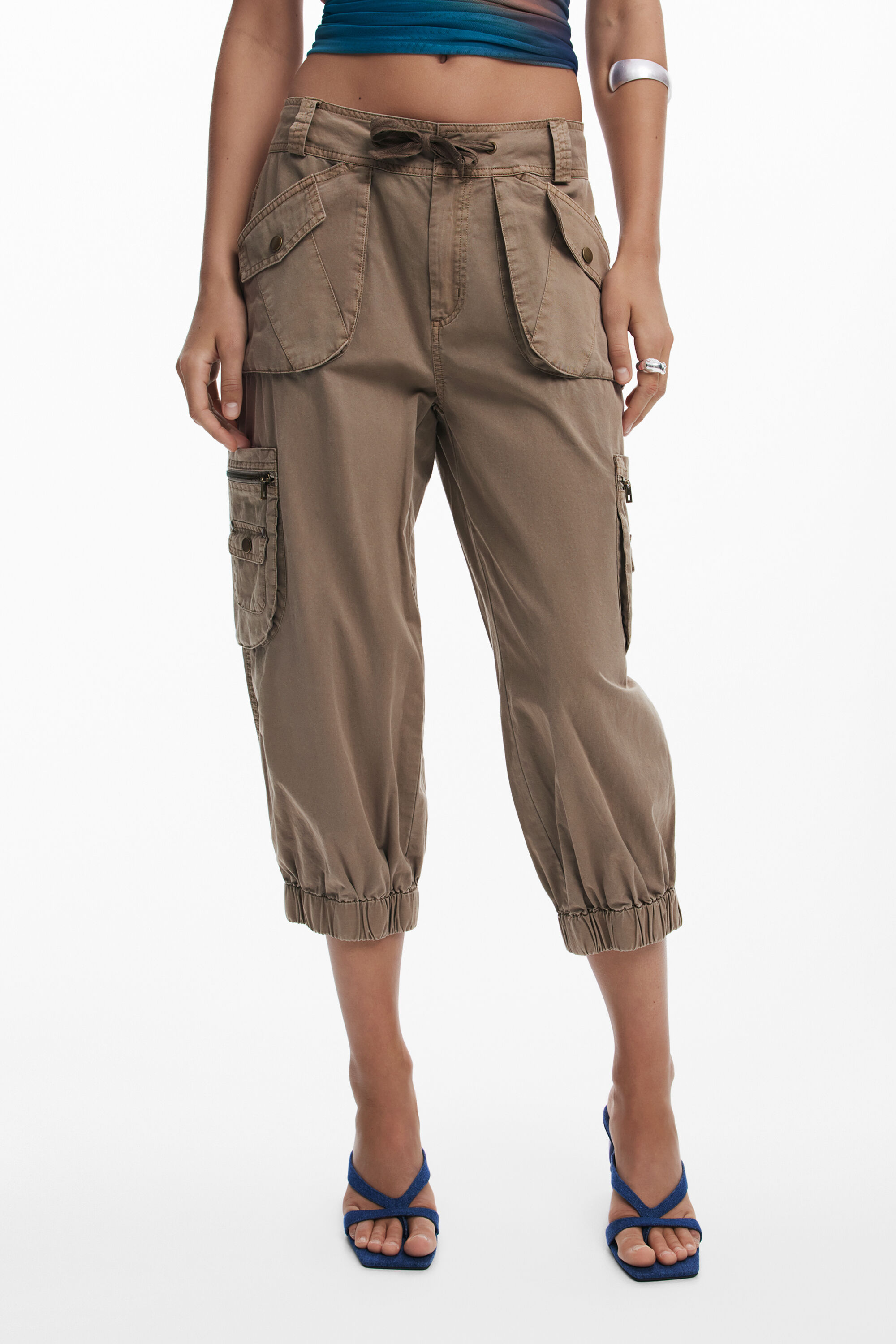 Cargo capri pants with multiple pockets, adjustable drawstring, elastic cuffs, and button and zipper closure