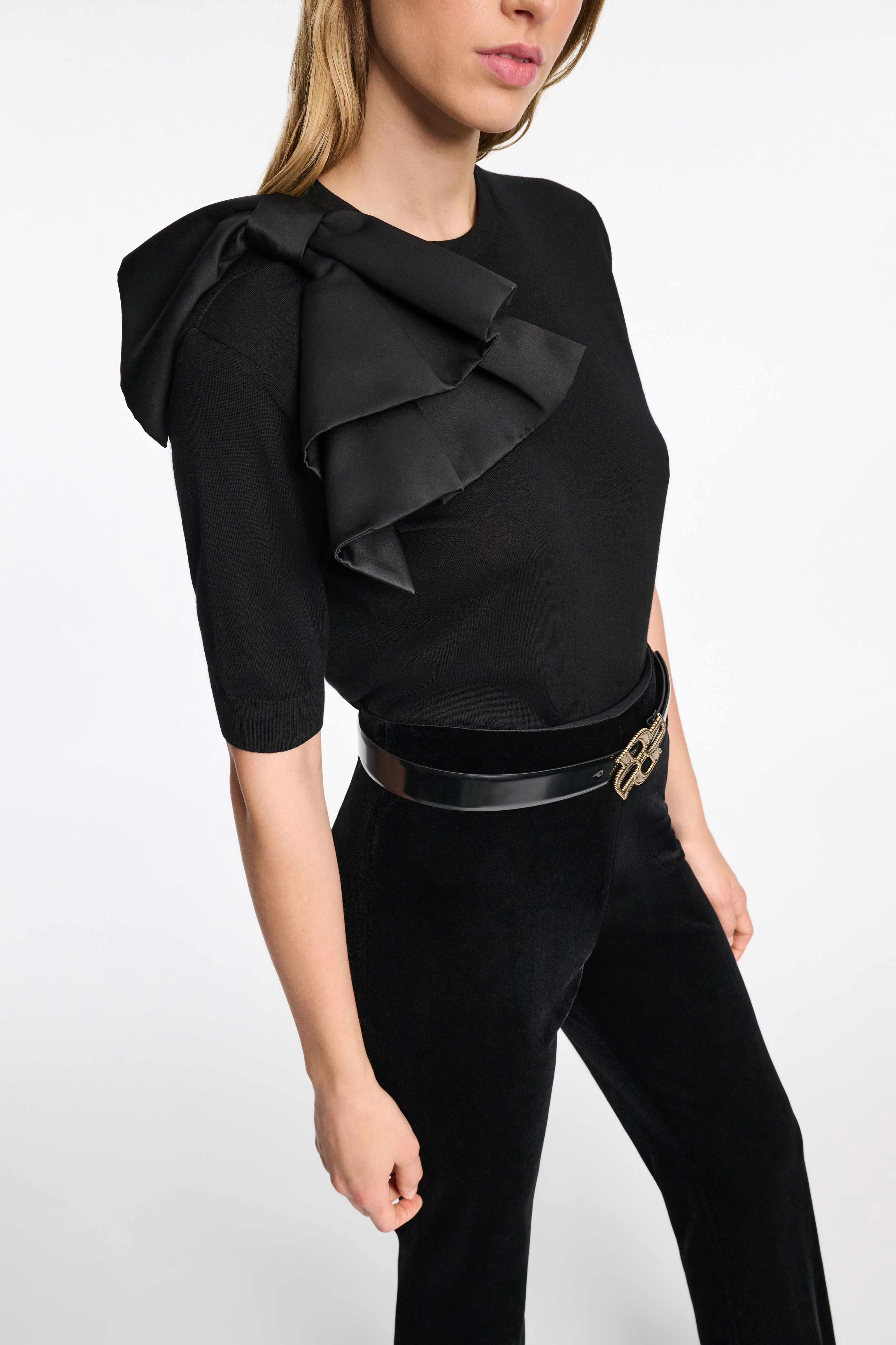 The short sleeve pullover is knit in soft virgin Merino wool and features an XL detachable satin duchesse bow on one shoulder.