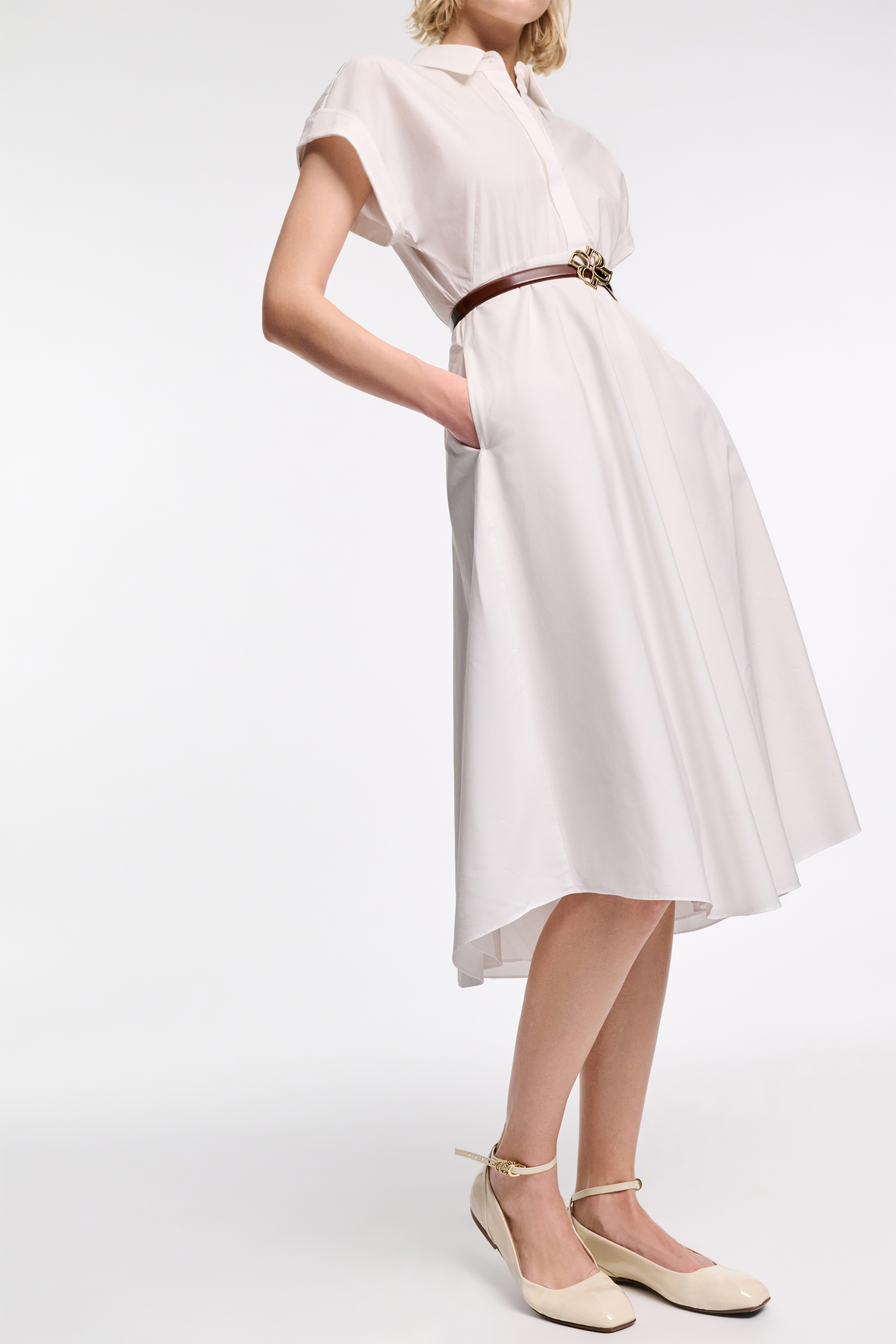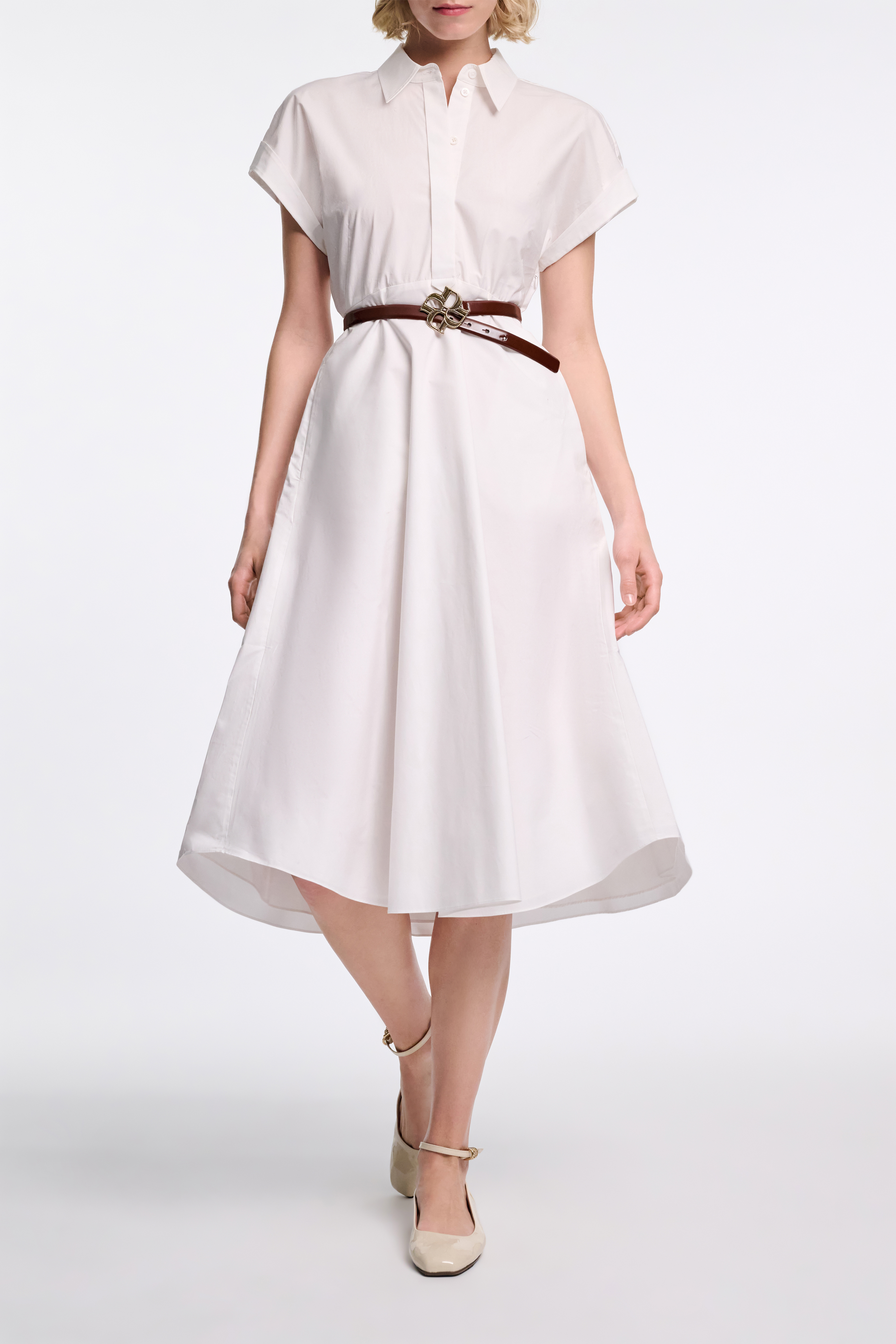 The cotton poplin shirtdress has a fit and flare silhouette with a tailored waist and fill swing skirt.