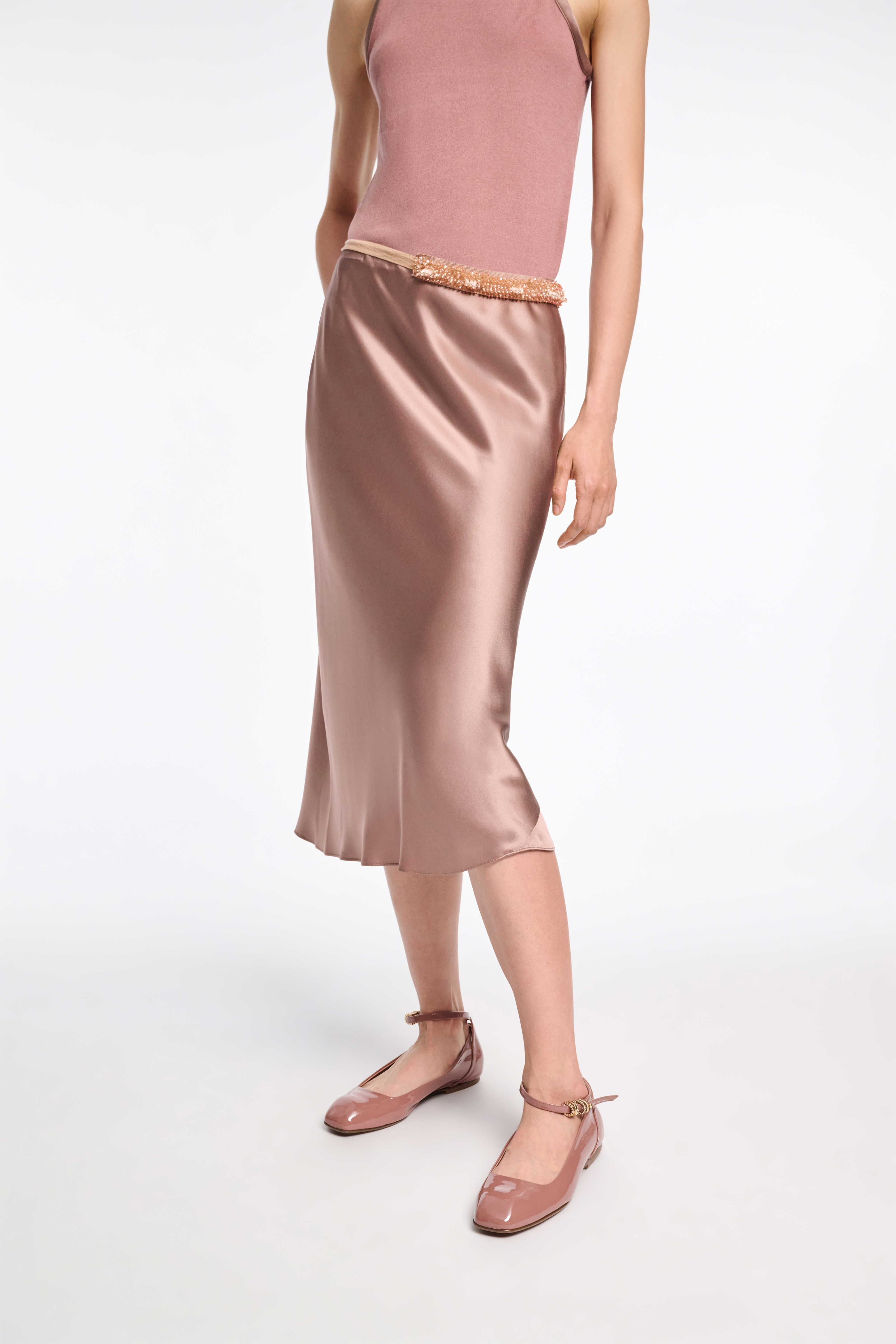 Cut on the bias for a fitted drape, the silk charmeuse skirt is both simple and striking.