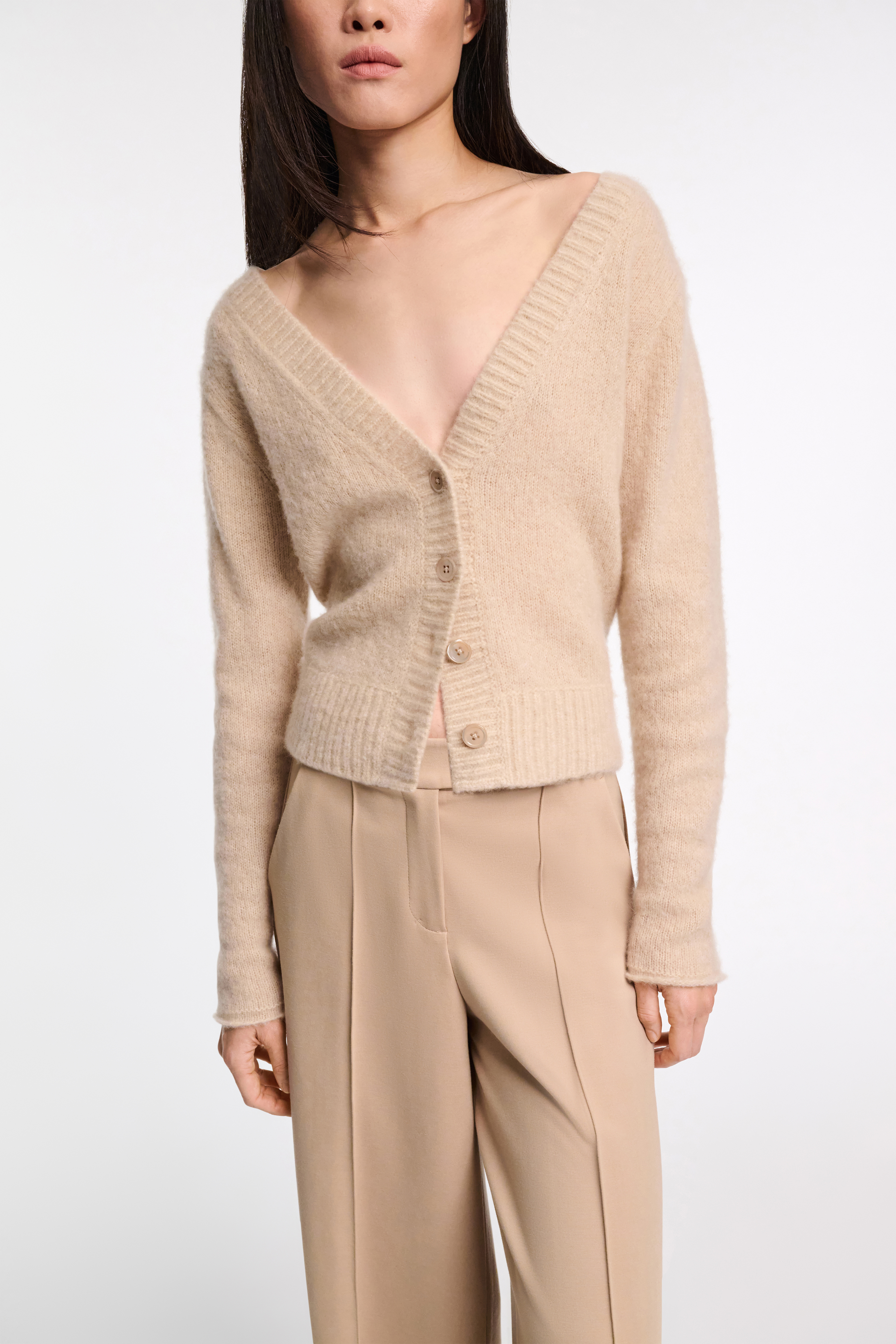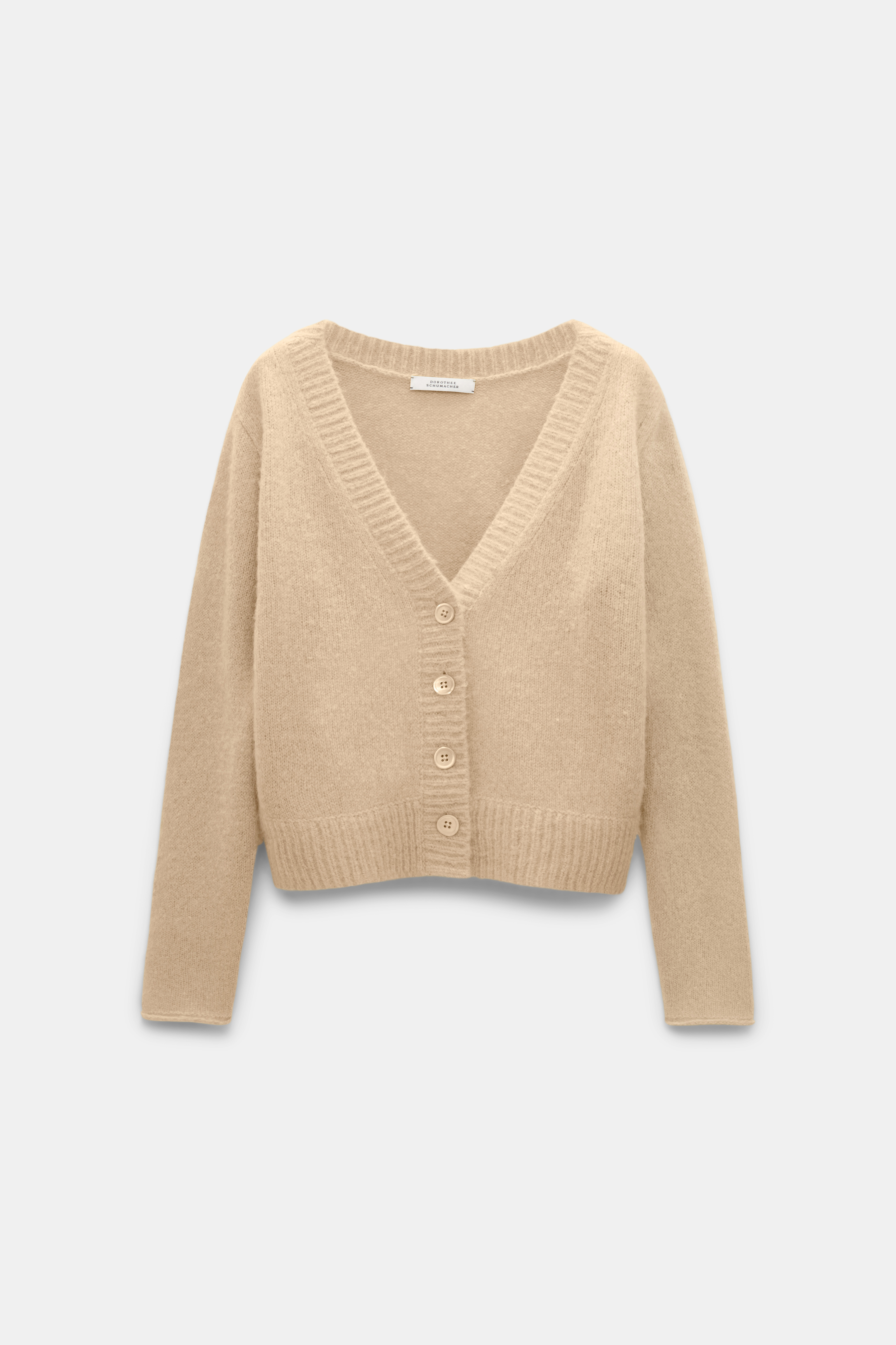The relaxed cardigan is knit in plush new cashmere yarn and has a wide V-neckline.