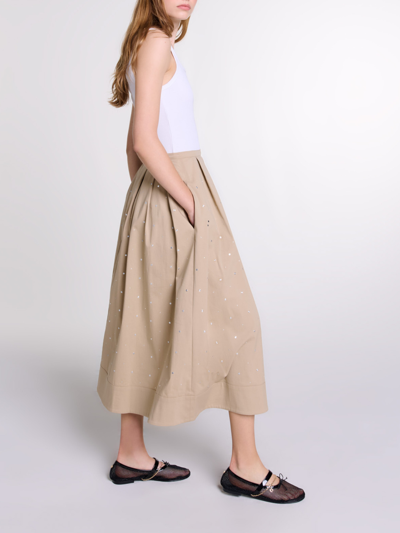 Maje Woman's cotton Long studded cotton skirt for Fall/Winter, in color Beige / Beige